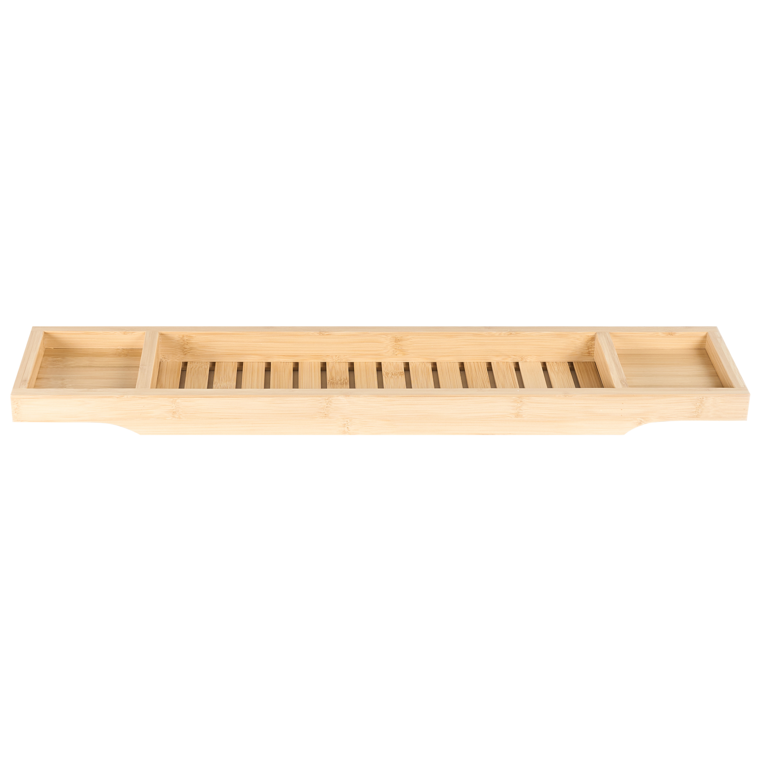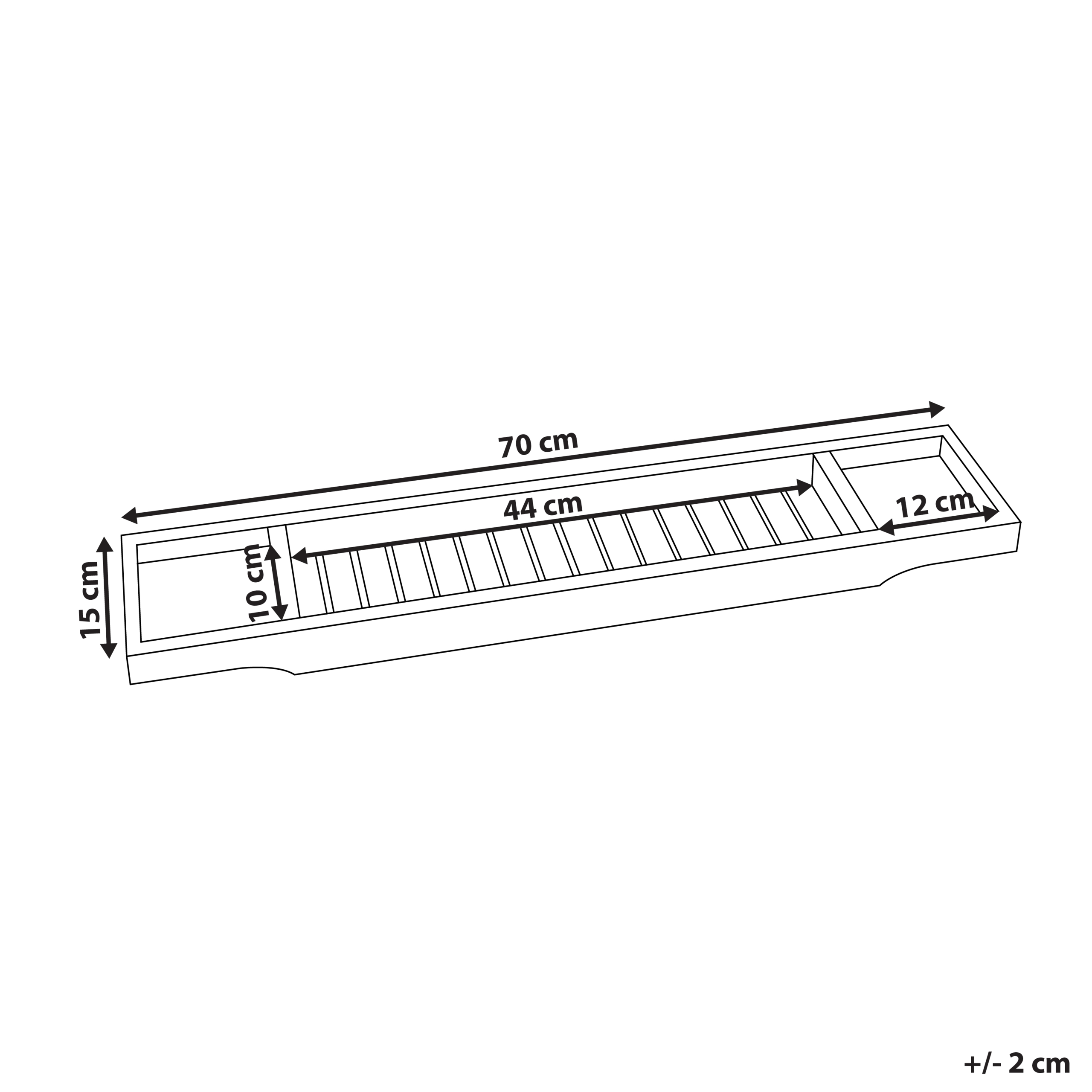 Tăviță pentru cadă multifuncțională din lemn. Această tăviță pentru cadă, realizată din bambus natural, adaugă un strop de farmec rustic băii tale, menținându-ți articolele esențialele la îndemână. Designul său elegant este ideal pentru a susține produse de toaletă precum săpunul, fiind atât practic, cât și stilat. Compactă, dar extrem de convenabilă, este accesoriul ideal pentru a-ți transforma baia într-un loc mai organizat și mai plăcut. Detalii: Tip de Produs: Etajeră pentru baie. Stil: Minimalist. Culoare: Maro. Material: Lemn. Material primar: Lemn de bambus. Finisaj: Lac transparent. Dimensiuni: Adâncime: 15 cm. Lățime: 70 cm. Înălțime: 5 cm. Greutate: 1 kg. Oferta incude: 1 x Tavă de baie. Caracteristici cheie: Granulele și nodurile lemnului natural fac ca fiecare piesă de mobilier să fie unică, Stil minimalist scandinav, Mobilier decorativ și funcțional, De înaltă calitate. Asamblare: Nu necesită asamblare. Informații suplimentare: Trebuie remarcat faptul că lemnul este un material natural și, prin urmare, fiecare obiect din lemn diferă de celelalte. Diferențele de culoare și de textură a suprafeței (noduri de lemn, dungi etc.) sunt caracteristici intrinseci ale materialului și, prin urmare, nu sunt considerate defecte ale produsului. Sfaturi de întreținere: Lemn de bambus: 1.Curățați cu un detergent delicat și o cârpă moale, urmând direcția fibrelor. 2.Ștergeți imediat după curățare pentru a preveni acumularea apei pe produs. 3.Pentru a păstra mobila finisată cu ulei în stare bună, este necesar să o ungeți cu ulei după un timp.
