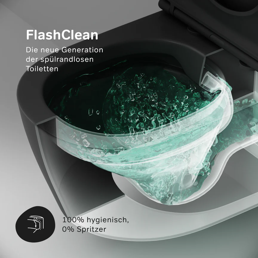 FlashClean este o nouă generație de toalete fără ramă, fără utilizarea plasticului: 100% igienă, 0% stropi.