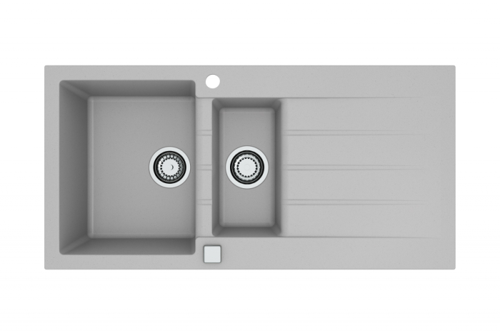 Chiuveta compozit Alveus  Cadit 80    Alveus Cadit 80   este o chiuveta de bucatarie realizata din material compozit, granital. Este formata din doua cuve si  prevazuta cu picurator avand dimensiunea totala de  100 x 50 cm .  Acest model de chiuveta Alveus este conceput pentru montajul pe blatul de bucatarie (incastrabil), fiind parte continua a suprafetei de lucru.  Culori disponibile: alb,terra,bej,gri,negru, ce ofera un contrast placut bucatariei dumneavoastra.  Chiuveta   Alveus Cadit 80  are o forma dreptunghiulara, cu dimensiunea cuvelor de  33 x 42.5 x 20 cm  respectiv  17 x 34 x 14 cm , potrivite pentru spalarea vaselor de orice dimensiune. Aceasta chiuveta este confectionata dintr-un amestec compozit de calitate superioara, numit granital. Datorita procesarii atente a materialului, suprafata chiuvetei de bucatarie este neteda, placuta la atingere si permite o curatare usoara. In plus, ii ofera si alte avantaje, cum ar fi: rezistenta la temperaturi inalte, la utilizare intensa, rezistenta maxima la socuri termice si mecanice, nu se fisureaza si nu se zgarie.  Chiuveta vine insotita cu urmatoarele accesorii:  sifon cu pop up;  ventil de 3 1 2  ;  sistem de prindere.