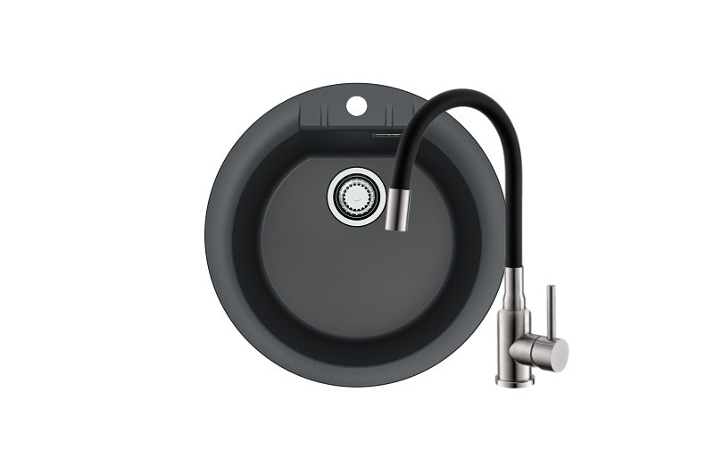 Pachet Cadit 100 si baterie Flexa negru satin Alveus Cadit 100 este o chiuveta de bucatarie realizata din material compozit, granital. Este formata dintr-o cuva spatioasa, fara picurator si are dimensiunea totala de fi 52 cm. Acest model de chiuveta Alveus este conceput pentru montajul pe blatul de bucatarie (incastrabil), fiind parte continua a suprafetei de lucru. Chiuveta Alveus Cadit 100 are o forma rotunda, cu dimensiunea cuvei de 42.5 x 42.5 x 20 cm , potrivita pentru spalarea vaselor de orice dimensiune. Aceasta chiuveta este confectionata dintr-un amestec compozit de calitate superioara, numit granital. Datorita procesarii atente a materialului, suprafata chiuvetei de bucatarie este neteda, placuta la atingere si permite o curatare usoara. In plus, ii ofera si alte avantaje, cum ar fi: rezistenta la temperaturi inalte, la utilizare intensa, rezistenta maxima la socuri termice si mecanice, nu se fisureaza si nu se zgarie. Chiuveta vine insotita cu urmatoarele accesorii: sifon cu pop up; ventil de 3 1 2 ; sistem de prindere. Alveus FLEXA este o baterie pentru chiuvetele de bucatarie, ce dispune de un design elegant, ce se potriveste atat in bucatariile traditionale, precum si in cele moderne, completand functional spatiul in care gatiti si serviti masa. Aceasta va ofera posiblitatea de a modela forma pipei. Bateria are robinet de tip monocomanda si cartus ceramic ce asigura o functionare fiabila si durata lunga de viata; pipa este inalta si mobila (cu rotatie 360 º), astfel incat sa se adapteze nevoilor dumneavoastra. Dimensiunile acesteia sunt: 15 cm latime si 34 cm inaltime. Aceasta baterie Alveus poate fi montata pe chiuveta sau pe blatul de bucatarie si vine insotita de sistem prindere si racorduri flexibile. Intretinere: curatati componentele in mod regulat, pentru a preveni acumularea de murdarie. Curatarea bateriei se va realiza doar cu un detergent neutru, neabraziv. Clatiti componentele cu apa si stergeti-le cu o carpa moale.