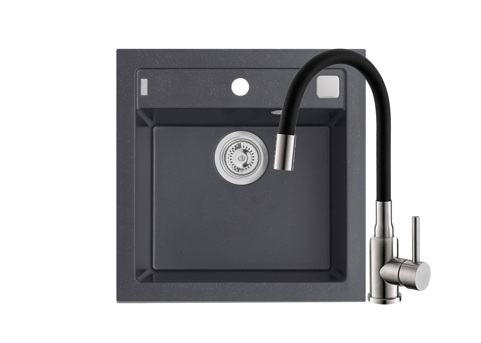 Pachet chiuveta  Formic 20 si baterie Flexa            Alveus Formic 20   este o chiuveta de bucatarie incastrabila, realizata din algranit - material compozit. Este formata dintr-o singura cuva avand dimensiunile 52 x 51 x 20cm.   Culoarea chiuvetei este neagra, ce se incadreaza foarte bine intr-o bucatarie cu mobilier din lemn sau PAL, fie cu aspect clasic, fie cu aspect modern.   Cartusul ceramic si manerul metalic asigura o functionarea fiabila si o durata lunga de viata. Robinetul bateriei este de tip monocomanda.   Racordurile flexibile asigura o instalare simpla si rapida.   Setul de livrare include urmatoarele accesorii:   sistem prindere;  racorduri;  garnituri.   Bateria de bucatarie Alveus Flexa prezinta urmatoarele specificatii tehnice:   Colectie: Flexa;  Inalta;  Cartus ceramic;  Montare: pe chiuveta;  Pipa pivotanta;  Monocomanda  Racorduri flexibile de conectare la apa;  Intretinere:    curatati componentele in mod regulat, pentru a preveni acumularea de murdarie. Curatarea bateriei se va realiza doar cu un detergent neutru, neabraziv. Clatiti componentele cu apa si stergeti-le cu o carpa moale.