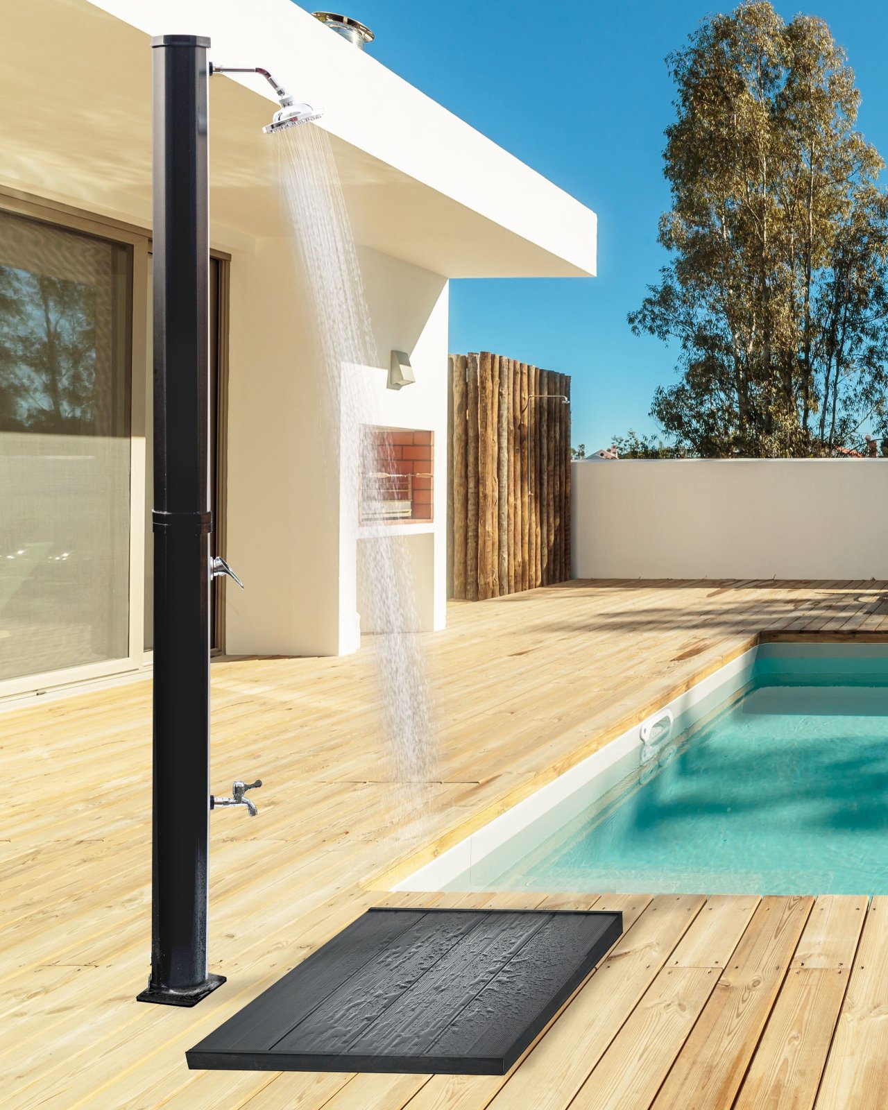 Duș exterior freestanding cu set de amestecător. Acest duș exterior freestanding, elegant, este realizat din PVC și este alimentat cu energie solară, fiind o alegere ecologică pentru grădina sau terasa ta. Construit pentru a oferi un flux de apă revigorant, asemănător cu ploaia, adaugă un strop de lux și confort în orice spațiu exterior. De asemenea, vine echipat cu un robinet pentru spălarea picioarelor, astfel încât să le poți curăța înainte de a intra în piscină. Cu un aspect modern și design sustenabil, acest duș oferă un echilibru perfect între formă și funcționalitate. Ușor de instalat și întreținut, este un must-have pentru oază ta de exterior. Detalii: Tip de Produs: Duș de gradină. Stil: Modern. Culoare: Negru. Material: Material sintetic. Material primar: PVC. Material secundar: Zinc. Finisaj: Lucios. Capacitate: 35. Dimensiuni: Adâncime: 15 cm. Lățime: 18 cm. Înălțime: 217 cm. Greutate: 10 kg. Oferta incude: 1 x Duș de grădină. Caracteristici cheie: Duș sub formă de ploaie cu jet de apă relaxant și de mare amplitudine, Potrivit pentru furtunuri cu conexiune standard G1/2, Ideal pentru grădini sau spații exterioare cu un aer modern, Excepțional de ușor de întreținut, Materiale de cea mai bună calitate. Asamblare: Necesită instalare.20-40 min. Informații suplimentare: Instalarea trebuie efectuată în conformitate cu manualul de utilizare, cu reglementările și legile statului. Vă rugăm să rețineți că dușul de exterior trebuie montat cu cele 4 șuruburi de blocare incluse pe o suprafață dură și plană (de exemplu, podea de beton sau gresie) cu acces la alimentarea cu apă. Pentru a preveni eventuale deteriorări pe timpul iernii, se recomandă demontarea completă a dușului, golirea acestuia de apă și depozitarea într-un spațiu uscat, ferit de îngheț. Nerespectarea acestor indicații poate duce la înghețarea componentelor, provocând infiltrații și defecțiuni în funcționare. Descriere: Mobilier fabricat din materiale rezistente la UV, ideal pentru utilizare în aer liber, nu se decolorează. Rezistență: UV. Sfaturi de întreținere: PVC: 1.Curățați numai cu detergenți blânzi. Nu utilizați agenți de curățare pe bază de alcaline sau acizi. 2.În caz de ploaie și pe timp de iarnă, folosiți o husă de protecție sau depozitați mobila în interior. 3.Ploaia acidă, apa sărată și furtunile de nisip pot deteriora stratul protector. 4.În afara sezonului, se recomandă să curățați regulat robinetul de duș pentru a preveni acumularea de murdărie și praf. De asemenea, este recomandat să aplicați ulei lubrifiant pe robinet pentru a asigura o durabilitate pe termen lung. 5.În timpul lunilor de iarnă, este recomandabil să opriți alimentarea cu apă și să goliți conducta de apă pentru a preveni înghețul și daunele care pot rezulta.