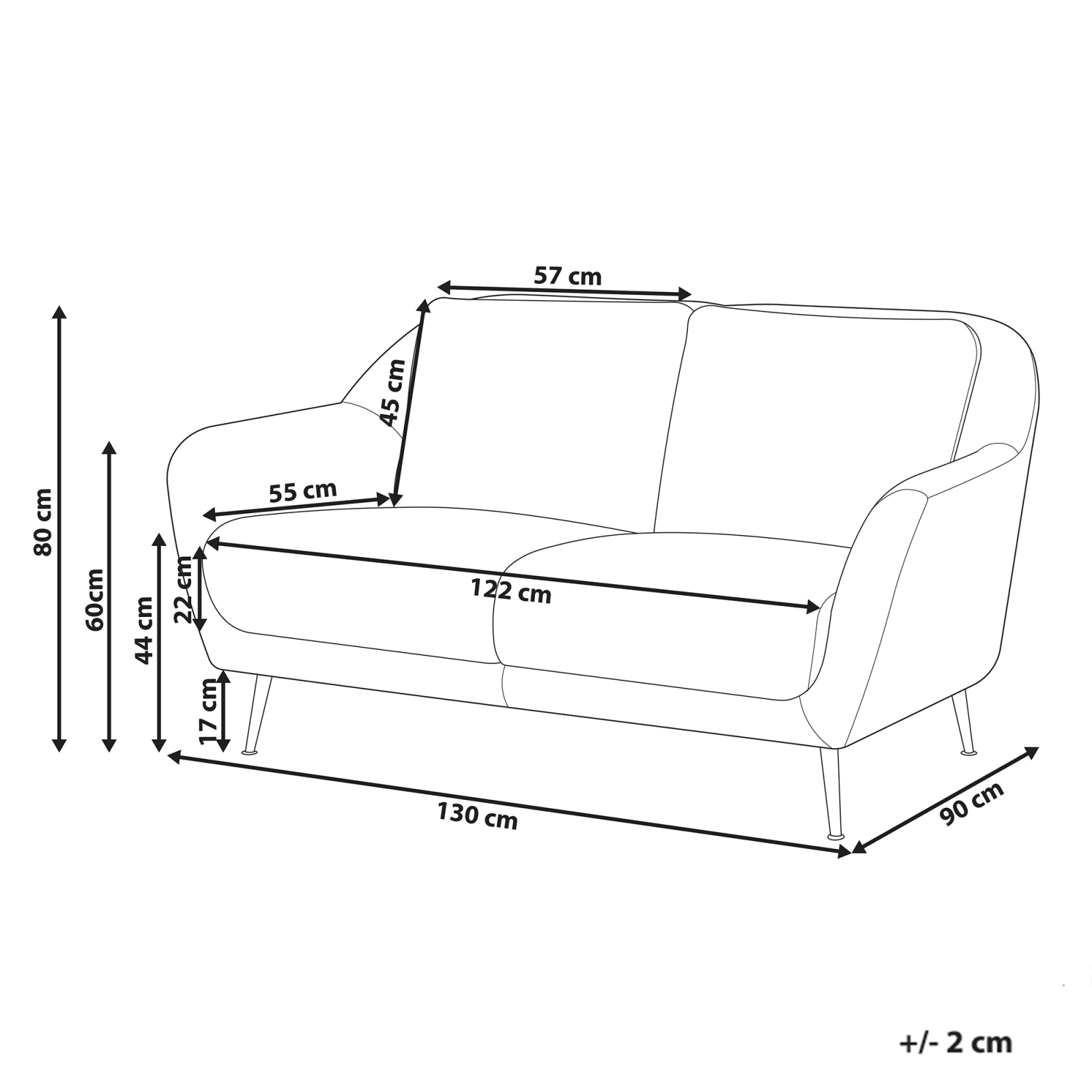 Canapea tapițată cu șezut gros căptușit. Această canapea elegantă cu 2 locuri completează perfect orice interior modern. Tapițeria moale este ușor de întreținut, iar picioarele din fier vopsit în negru oferă durabilitate și rafinament. Cotierele confortabile și șezutul bine căptușit asigură relaxare, iar capacele de protecție mențin pardoseala intactă. Detalii: Tip de Produs: Canapea cu 2 locuri. Stil: Modern. Culoare: Alb. Culoarea cadrului: Negru. Material: Țesătură. Material primar: Chenille. Material secundar: Fier. Căptușeală: Spumă. Compoziția materialului: 100% Poliester. Stilul cotierei: Liniar. Model: Culoare solidă. Structura scaunului: Curea elastică. Densitatea pernei scaunului: 30 kg/m3. Locuri până la: 2 persoane. Dimensiuni: Înălțimea cotierei: 60 cm. Adâncime: 90 cm. Grosimea scaunului: 22 cm. Înălțimea scaunului: 44 cm. Lățime: 130 cm. Înălțime: 80 cm. Suprafața de ședere: 122x55 cm. Greutate: 34 kg. Capacitatea de greutate per persoană: 120 kg. Oferta incude: 1 x Canapea cu 2 locuri. Caracteristici cheie: Design mereu actualizat, Se adaptează la orice stil de interior, Tapițerie din țesătură de înaltă calitate, Structură proiectată pentru a oferi stabilitate maximă, Capace pentru picioare pentru protecția suprafeței. Asamblare: Necesită asamblare parțială.5-15 min. Sfaturi de întreținere: Chenille: 1.Vă rugăm să curățați cu un șampon uscat și un burete umed sau cu un detergent ușor. 2.Aspirati folosind un accesoriu potrivit. Fier: 1.Curățați cu un detergent delicat și o cârpă moale, apoi ștergeți bine. 2.Pentru a evita zgârieturile, nu folosiți produse de curățare abrazive. 3.Pentru elementele din cupru sau crom, folosiți un agent de lustruire.