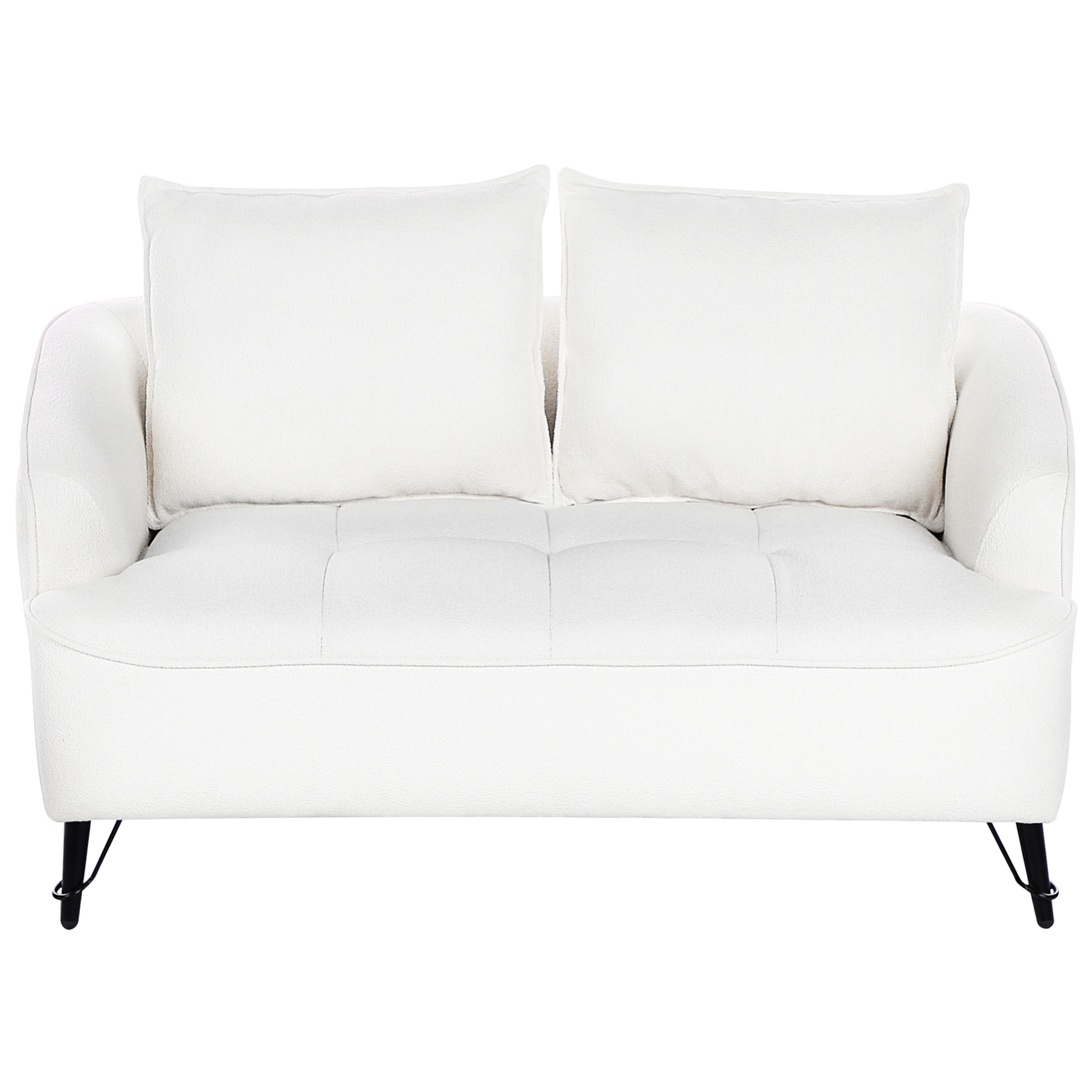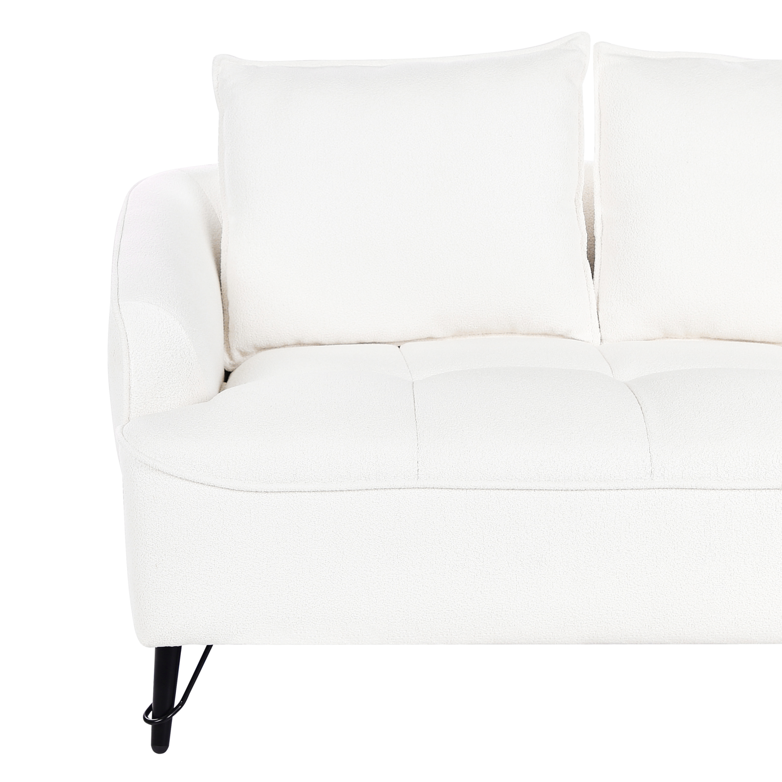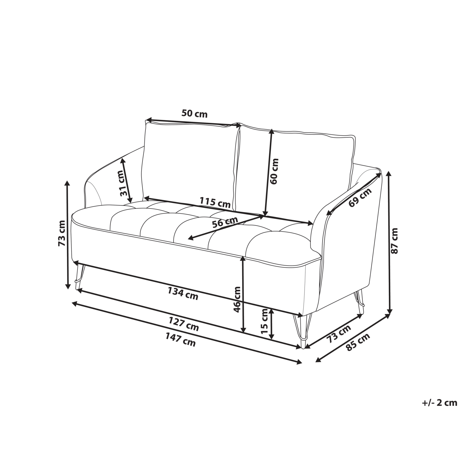 Canapea cu șezut capitonat. Această canapea cu două locuri aduce împreună confortul și stilul, datorită tapițeriei din țesătură boucle de calitate superioară, plăcută la atingere, și a șezutului generos, căptușit cu spumă. Picioarele din metal negru, durabile și elegante, completează perfect aspectul piesei de mobilier. Ideală pentru interioruri moderne sau cu influențe rustice, această canapea va transforma orice încăpere într-un spațiu elegant și confortabil, perfect pentru momente de relaxare alături de cei dragi. Detalii: Tip de Produs: Canapea cu 2 locuri. Stil: Cottage. Culoare: Alb. Material: Țesătură. Material primar: Boucle. Material secundar: Oțel. Căptușeală: Spumă. Compoziția materialului: 100% Poliester. Stilul cotierei: Liniar. Model: Culoare solidă. Structura scaunului: Lemn. Densitatea pernei scaunului: 28 kg/m3. Locuri până la: 2 persoane. Dimensiuni: Înălțimea cotierei: 73 cm. Adâncime: 85 cm. Grosimea scaunului: 31 cm. Înălțimea scaunului: 46 cm. Lățime: 147 cm. Înălțime: 87 cm. Suprafața de ședere: 134x56 cm. Greutate: 42 kg. Capacitatea de greutate per persoană: 100 kg. Oferta incude: 1 x Canapea cu 2 locuri. Caracteristici cheie: Confort maxim la șezut, Design mereu actualizat, Structură proiectată pentru a oferi stabilitate maximă, Materiale de cea mai bună calitate, Tapițată complet. Asamblare: Necesită asamblare parțială.5-15 min. Sfaturi de întreținere: Boucle: 1.Vă rugăm să curățați cu un șampon uscat și un burete umed sau cu un detergent ușor. 2.Aspirati folosind un accesoriu potrivit. Oțel: 1.Curățați cu un detergent delicat și o cârpă moale, apoi ștergeți bine. 2.Pentru a evita zgârieturile, nu folosiți produse de curățare abrazive. 3.Pentru elementele din cupru sau crom, folosiți un agent de lustruire.
