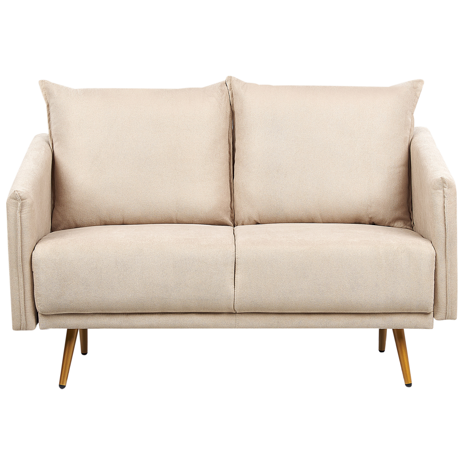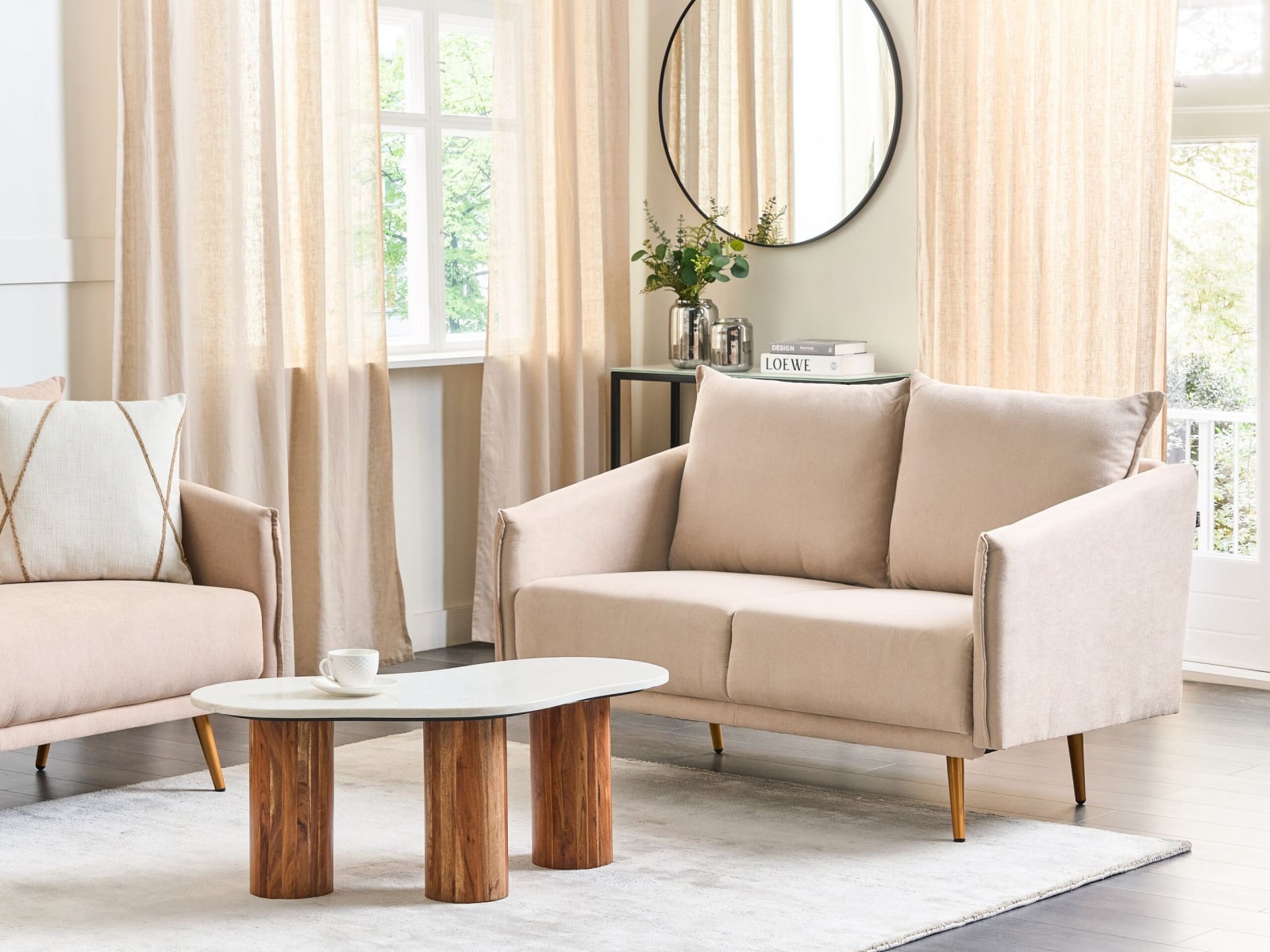 Canapea cu 2 locuri. Canapeaua oferă confort excepțional, tapițerie plăcută și un finisaj elegant. Pernele de spate cu arcuri buzunar asigură ore de relaxare. Poate găzdui până la două persoane. Se potrivește perfect în spații glamour, dar poate fi combinată și cu elemente boho sau retro. Detalii: Tip de Produs: Canapea cu 2 locuri. Stil: Retro. Culoare: Bej. Material: Țesătură. Material primar: Catifea. Material secundar: Metal. Căptușeală: Spumă. Compoziția materialului: 100% Poliester. Stilul cotierei: Liniar. Model: Culoare solidă. Structura scaunului: Arcuri ondulate. Densitatea pernei scaunului: 24 kg/m3. Locuri până la: 2 persoane. Dimensiuni: Înălțimea cotierei: 60 cm. Adâncime: 78 cm. Grosimea scaunului: 24 cm. Înălțimea scaunului: 47 cm. Lățime: 130 cm. Înălțime: 83 cm. Suprafața de ședere: 113x50 cm. Greutate: 33 kg. Capacitatea de greutate per persoană: 125 kg. Oferta incude: 1 x Canapea cu 2 locuri. Caracteristici cheie: Scaun gros pentru confort maxim, Design tradițional cu o notă modernă, Potrivit pentru orice stil de decor interior, Perne detașabile pentru o curățare ușoară, Capace pentru picioare pentru protecția suprafeței, Tapițată complet. Asamblare: Necesită asamblare completă.5-15 min. Informații suplimentare: PVC cu poliester este o alternativă perfectă la orice tip de țesătură utilizată în construcția de mobilier de exterior. Este de fapt mai durabilă, rezistentă la umiditate și la pete. Cu toate acestea, vă recomandăm să asamblați mobilierul din PVC cu poliester într-un mediu cu o temperatură de cel puțin 20°C pentru ca acest material să fie mai flexibil și mai ușor de manevrat. Temperaturile mai scăzute ar putea cauza rigidizarea țesăturii și ar face mai dificilă asamblarea mobilierului. Sfaturi de întreținere: Catifea: 1.Vă rugăm să curățați cu un șampon uscat și un burete umed sau cu un detergent ușor. 2.Aspirati folosind un accesoriu potrivit. Metal: 1.Curățați cu un detergent delicat și o cârpă moale, apoi ștergeți bine. 2.Pentru a evita zgârieturile, nu folosiți produse de curățare abrazive. 3.Pentru elementele din cupru sau crom, folosiți un agent de lustruire.