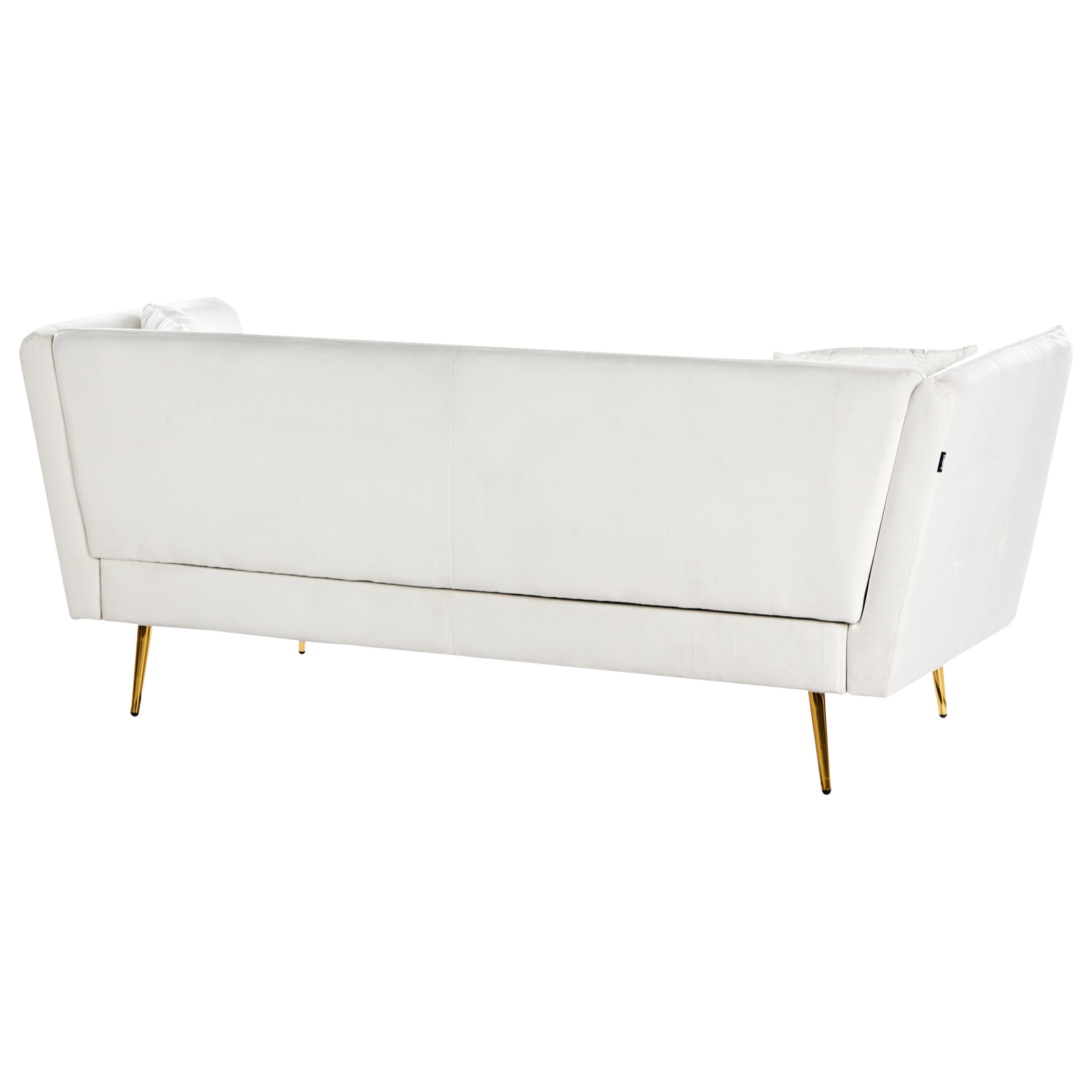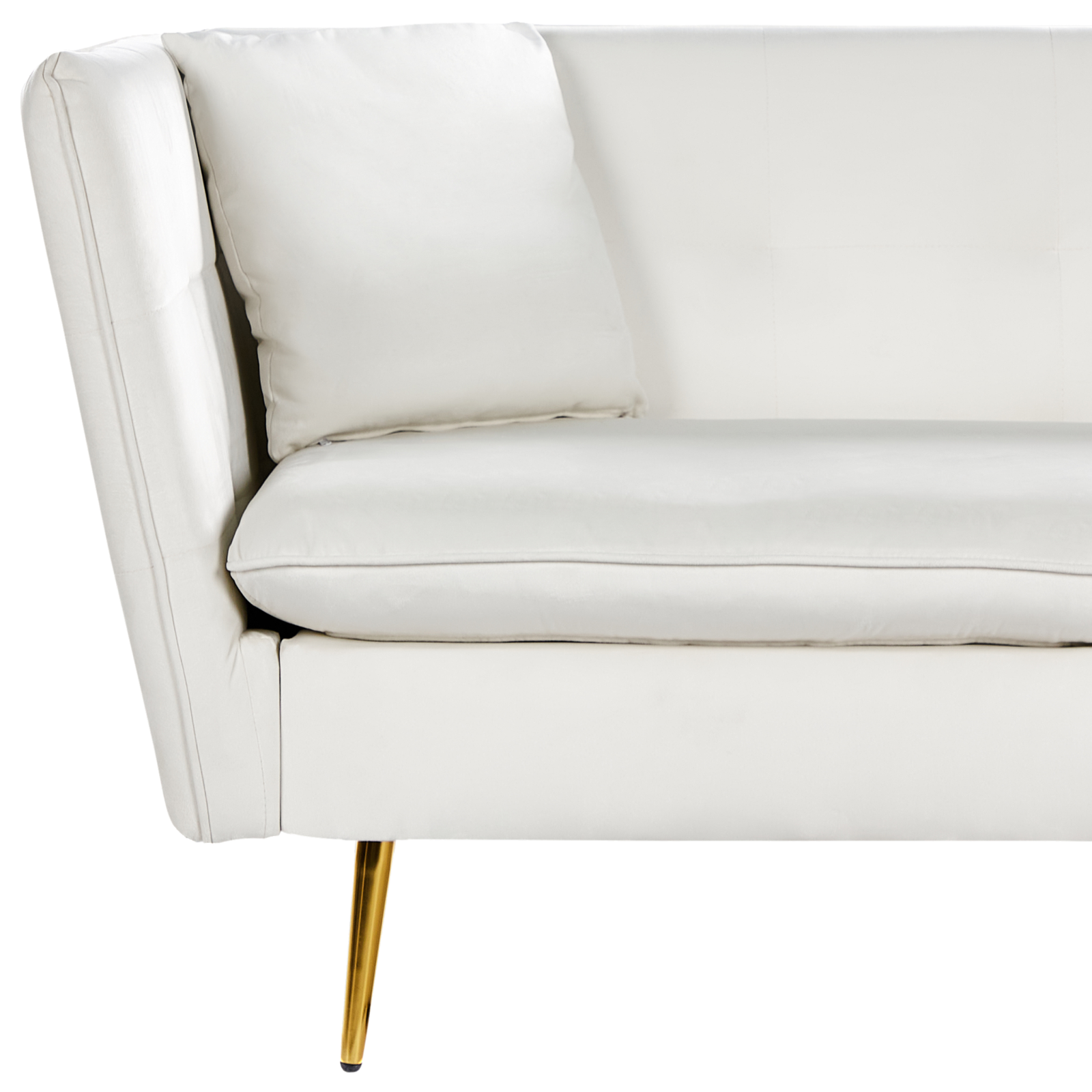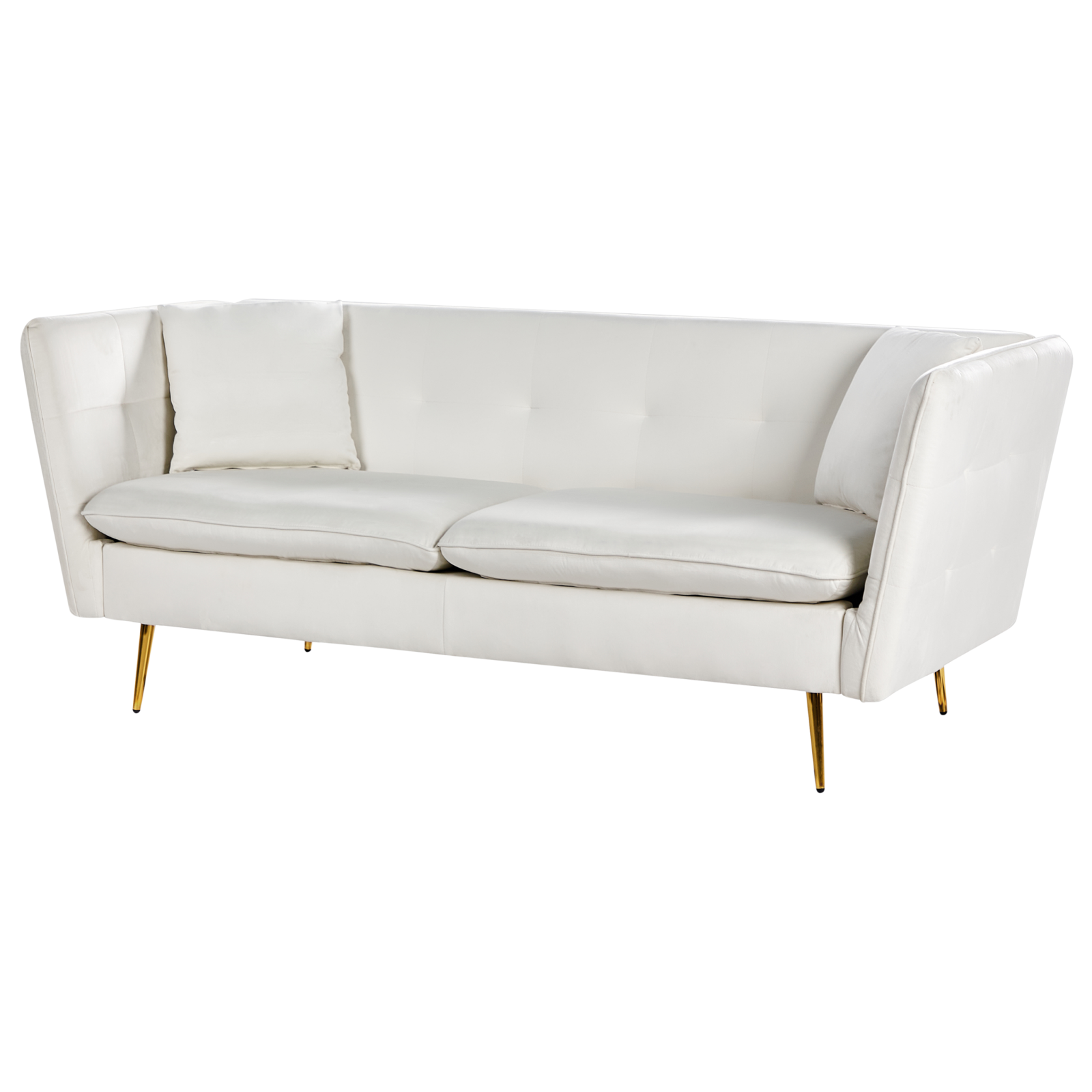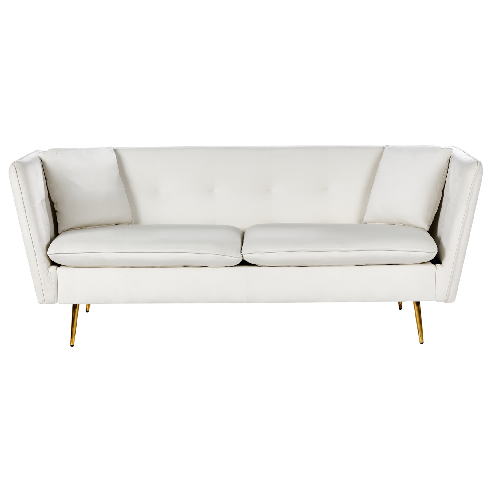 Canapea tapițată cu 3 locuri. Creează un spațiu rafinat cu această canapea de 3 locuri, tapițată cu țesătură catifelată și textură luxoasă. Nasturii pătrați și picioarele metalice aurii îi dau un aer elegant, iar combinația dintre stilul retro și designul modern aduce o notă de glamour în livingul tău. Detalii: Tip de Produs: Canapea cu 3 locuri. Stil: Glamour. Culoare: Alb. Nuanță: Alb-murdar. Material: Țesătură. Material primar: Catifea. Material secundar: Lemn de eucalipt. Căptușeală: Spumă. Compoziția materialului: 100% Poliester. Stilul cotierei: Liniar. Model: Culoare solidă. Structura scaunului: Arcuri ondulate. Densitatea pernei scaunului: 30 kg/m3. Locuri până la: 3 persoane. Dimensiuni: Înălțimea cotierei: 77 cm. Adâncime: 80 cm. Grosimea scaunului: 16 cm. Înălțimea scaunului: 33 cm. Lățime: 200 cm. Înălțime: 77 cm. Suprafața de ședere: 170x60 cm. Greutate: 44 kg. Capacitatea de greutate per persoană: 150 kg. Oferta incude: 1 x Canapea, 2 x Pernă. Caracteristici cheie: Foarte chic, Cu un tufting decorativ clasic, De înaltă calitate, Țesătură de catifea netedă și mătăsoasă, Tapițată complet. Asamblare: Necesită asamblare completă.20-40 min. Informații suplimentare: Rețineți că țesătura de catifea poate avea un aspect puțin diferit atunci când este expusă la lumină; tinde să fie mai strălucitoare și mai luminoasă în lumina soarelui, în timp ce în lumină artificială are un ton diferit, mai închis. Datorită tipului de țesătură, tonul catifelei poate varia, de asemenea, atunci când este atinsă din direcții diferite. Pentru a uniformiza culoarea și a scăpa de lovituri și cute, materialul trebuie mângâiat cu palma deschisă într-o singură direcție, frecat cu o cârpă umedă sau călcat cu abur. Sfaturi de întreținere: Catifea: 1.Vă rugăm să curățați cu un șampon uscat și un burete umed sau cu un detergent ușor. 2.Aspirati folosind un accesoriu potrivit. Oțel: 1.Curățați cu un detergent delicat și o cârpă moale, apoi ștergeți bine. 2.Pentru a evita zgârieturile, nu folosiți produse de curățare abrazive. 3.Pentru elementele din cupru sau crom, folosiți un agent de lustruire.