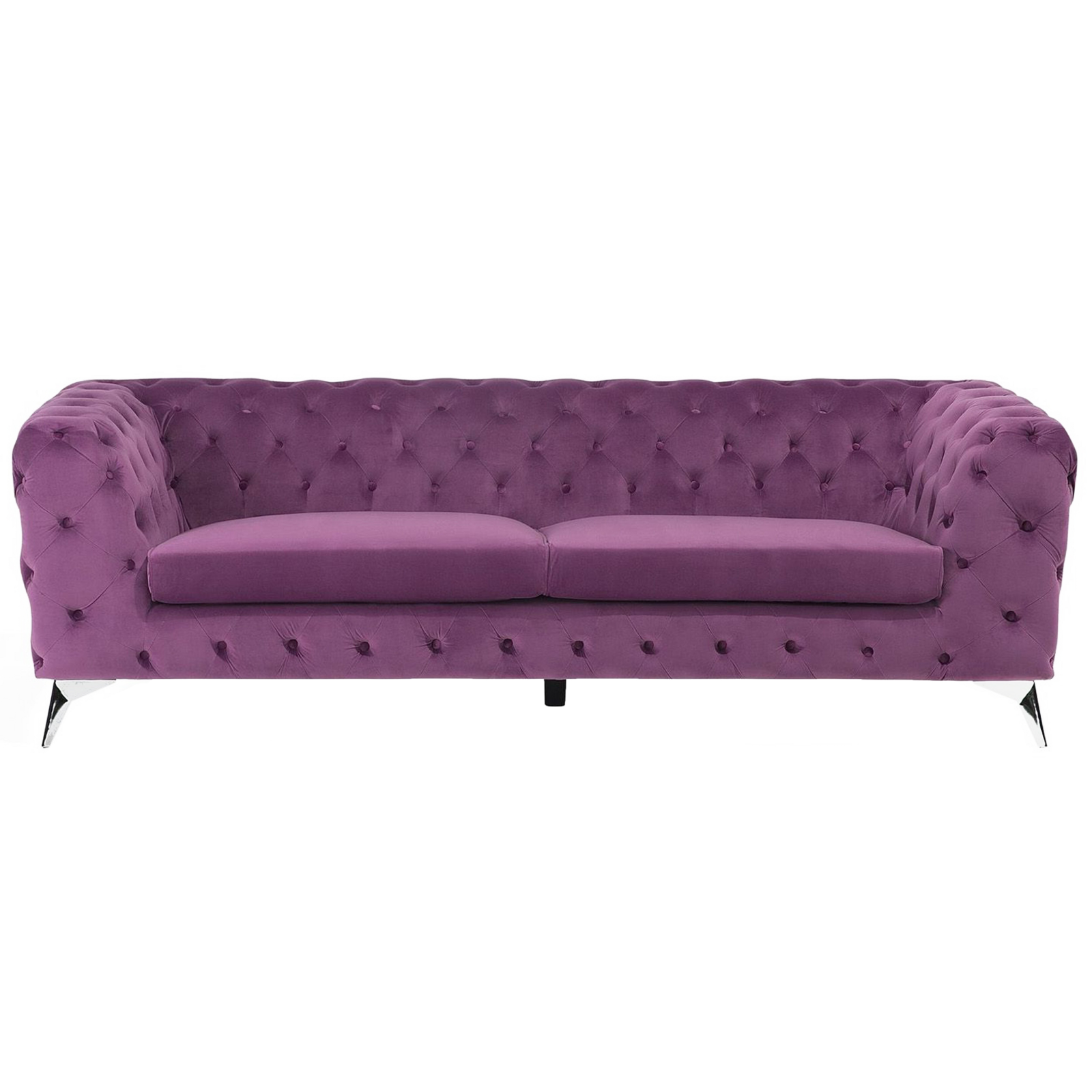 Canapea Chesterfield din catifea. Această canapea cu trei locuri, cu o siluetă elegantă adaugă un aer rafinat oricărui interior, oferind în același timp confort și stil. Confecționată din catifea moale la atingere, cu detalii cu butoane, completată cu picioare metalice moderne, se potrivește perfect atât în decoruri tradiționale, cât și în cele contemporane, de la minimalism la glamour. Un plus de eleganță și confort pentru orice locuință. Detalii: Tip de Produs: Canapea cu 3 locuri. Stil: Glamour. Culoare: Violet. Nuanță: Violet. Material: Țesătură. Material primar: Catifea. Material secundar: Lemn de pin. Căptușeală: Spumă. Compoziția materialului: 100% Poliester. Stilul cotierei: Liniar. Model: Culoare solidă. Structura scaunului: Arcuri ondulate. Densitatea pernei scaunului: 30 kg/m3. Locuri până la: 3 persoane. Dimensiuni: Înălțimea cotierei: 70 cm. Adâncime: 85 cm. Grosimea scaunului: 15 cm. Înălțimea scaunului: 45 cm. Lățime: 224 cm. Înălțime: 70 cm. Suprafața de ședere: 165x59 cm. Greutate: 52 kg. Capacitatea de greutate per persoană: 150 kg. Oferta incude: 1 x Canapea. Caracteristici cheie: Scaun jos și adânc, Design tradițional cu o notă modernă, Adaugă o notă de stil în orice cameră, Tapițerie din țesătură de înaltă calitate, Structură proiectată pentru a oferi stabilitate maximă, Țesătură de catifea netedă și mătăsoasă, Tapițată complet. Asamblare: Picioare neasamblate.5-15 min. Informații suplimentare: Rețineți că țesătura de catifea poate avea un aspect puțin diferit atunci când este expusă la lumină; tinde să fie mai strălucitoare și mai luminoasă în lumina soarelui, în timp ce în lumină artificială are un ton diferit, mai închis. Datorită tipului de țesătură, tonul catifelei poate varia, de asemenea, atunci când este atinsă din direcții diferite. Pentru a uniformiza culoarea și a scăpa de lovituri și cute, materialul trebuie mângâiat cu palma deschisă într-o singură direcție, frecat cu o cârpă umedă sau călcat cu abur. Sfaturi de întreținere: Catifea: 1.Vă rugăm să curățați cu un șampon uscat și un burete umed sau cu un detergent ușor. 2.Aspirati folosind un accesoriu potrivit. Metal: 1.Curățați cu un detergent delicat și o cârpă moale, apoi ștergeți bine. 2.Pentru a evita zgârieturile, nu folosiți produse de curățare abrazive. 3.Pentru elementele din cupru sau crom, folosiți un agent de lustruire.