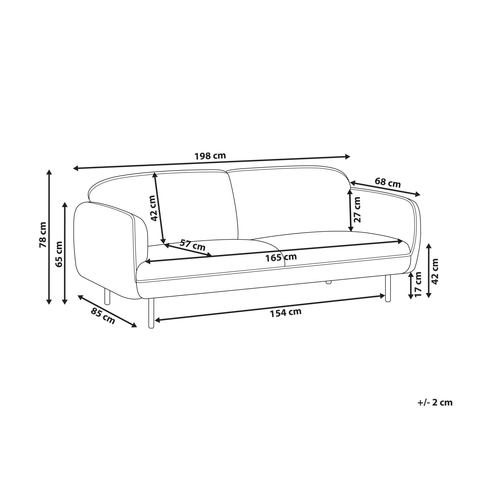 Canapea decorativă cu 3 locuri. Răsfață-te cu confortul absolut oferit de această canapea cu 3 locuri, o veritabilă capodoperă ce îmbină stilul contemporan cu rafinamentul absolut. Îmbrăcată într-o țesătură delicată, care te învăluie cu fiecare atingere, canapeaua devine locul ideal pentru a te deconecta și a te bucura de momente de relaxare totală. Detaliile fine, precum marginea neagră elegantă ce conturează perfect formele sale și picioarele metalice negre, adaugă o notă de eleganță care se potrivește perfect în orice decor. Detalii: Tip de Produs: Canapea cu 3 locuri. Stil: Retro. Culoare: Bej. Nuanță: Bej deschis. Material: Țesătură. Material primar: Țesătură. Material secundar: Metal. Căptușeală: Spumă. Compoziția materialului: 100% Poliester. Stilul cotierei: Liniar. Model: Culoare solidă. Structura scaunului: Arcuri ondulate. Densitatea pernei scaunului: 50 kg/m3. Locuri până la: 3 persoane. Dimensiuni: Înălțimea cotierei: 65 cm. Adâncime: 85 cm. Grosimea scaunului: 25 cm. Înălțimea scaunului: 42 cm. Lățime: 198 cm. Înălțime: 78 cm. Suprafața de ședere: 165x57 cm. Greutate: 45 kg. Capacitatea de greutate per persoană: 117 kg. Oferta incude: 1 x Canapea cu 3 locuri. Caracteristici cheie: Formă curbată pentru a maximiza confortul, Un loc excelent pentru relaxare, Incredibil de moale, Design clasic, Mobilier decorativ și funcțional, Materiale de cea mai bună calitate. Asamblare: Picioare neasamblate.20-40 min. Sfaturi de întreținere: Țesătură: 1.Vă rugăm să curățați cu un șampon uscat și un burete umed sau cu un detergent ușor. 2.Aspirati folosind un accesoriu potrivit. Metal: 1.Curățați cu un detergent delicat și o cârpă moale, apoi ștergeți bine. 2.Pentru a evita zgârieturile, nu folosiți produse de curățare abrazive. 3.Pentru elementele din cupru sau crom, folosiți un agent de lustruire.