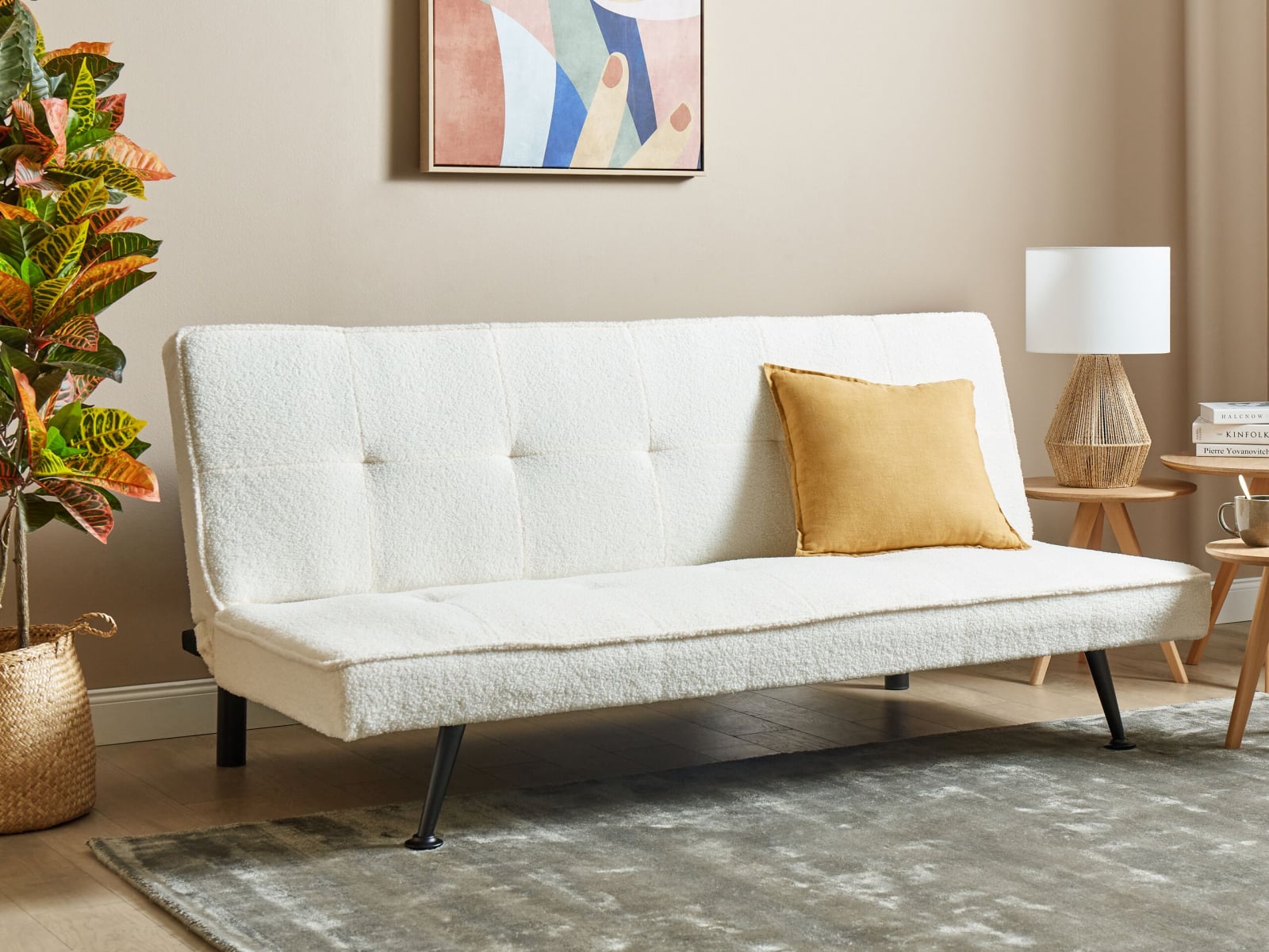 Canapea extensibilă modernă. Această canapea cu trei locuri este alegerea ideală pentru orice interior modern sau minimalist. Pe timpul zilei, este locul perfect pentru relaxare sau pentru un pui de somn după o zi obositoare de muncă. Noaptea, poate deveni un pat confortabil pentru oaspeți. Se transformă rapid într-un pat extensibil, grație spătarului reglabil. Tapițată cu țesătură rezistentă, șezutul și spătarul au un design discret matlasat. Picioarele din metal negru subliniază perfect designul modern al canapelei. Detalii: Tip de Produs: Canapea cu 3 locuri. Stil: Modern. Culoare: Alb. Material: Țesătură. Material primar: Boucle. Material secundar: Lemn de eucalipt. Căptușeală: Spumă. Compoziția materialului: 100% Poliester. Stilul cotierei: Fără cotiere. Protecții pentru picioare incluse: Nu. Reclinabil: Nu. Huse detașabile de perne: Nu. Structura scaunului: Arcuri ondulate. Densitatea pernei scaunului: 50 kg/m3. Locuri până la: 3 persoane. Funcție de dormit: Da. Funcție extensibilă: Click-Clack. Depozitare: Nu. Dimensiuni: Adâncime: 88 cm. Grosimea scaunului: 12 cm. Înălțimea scaunului: 35 cm. Lățime: 168 cm. Înălțime: 77 cm. Suprafața de ședere: 168x54 cm. Suprafața de dormit: 168x103 cm. Greutate: 24 kg. Capacitatea de greutate per persoană: 150 kg. Oferta incude: 1 x Canapea. Caracteristici cheie: Ușor de transformat în pat, Spătar reglabil în 3 poziții, Confort maxim la șezut, Culori calde și elegante, Creează o atmosferă confortabilă, Tapițerie din țesătură de înaltă calitate. Asamblare: Picioare neasamblate.5-15 min. Informații suplimentare: Pentru a facilita transportul, picioarele au fost plasate într-un buzunar sub scaun. Sfaturi de întreținere: Boucle: 1.Vă rugăm să curățați cu un șampon uscat și un burete umed sau cu un detergent ușor. 2.Aspirati folosind un accesoriu potrivit. Metal: 1.Curățați cu un detergent delicat și o cârpă moale, apoi ștergeți bine. 2.Pentru a evita zgârieturile, nu folosiți produse de curățare abrazive. 3.Pentru elementele din cupru sau crom, folosiți un agent de lustruire.