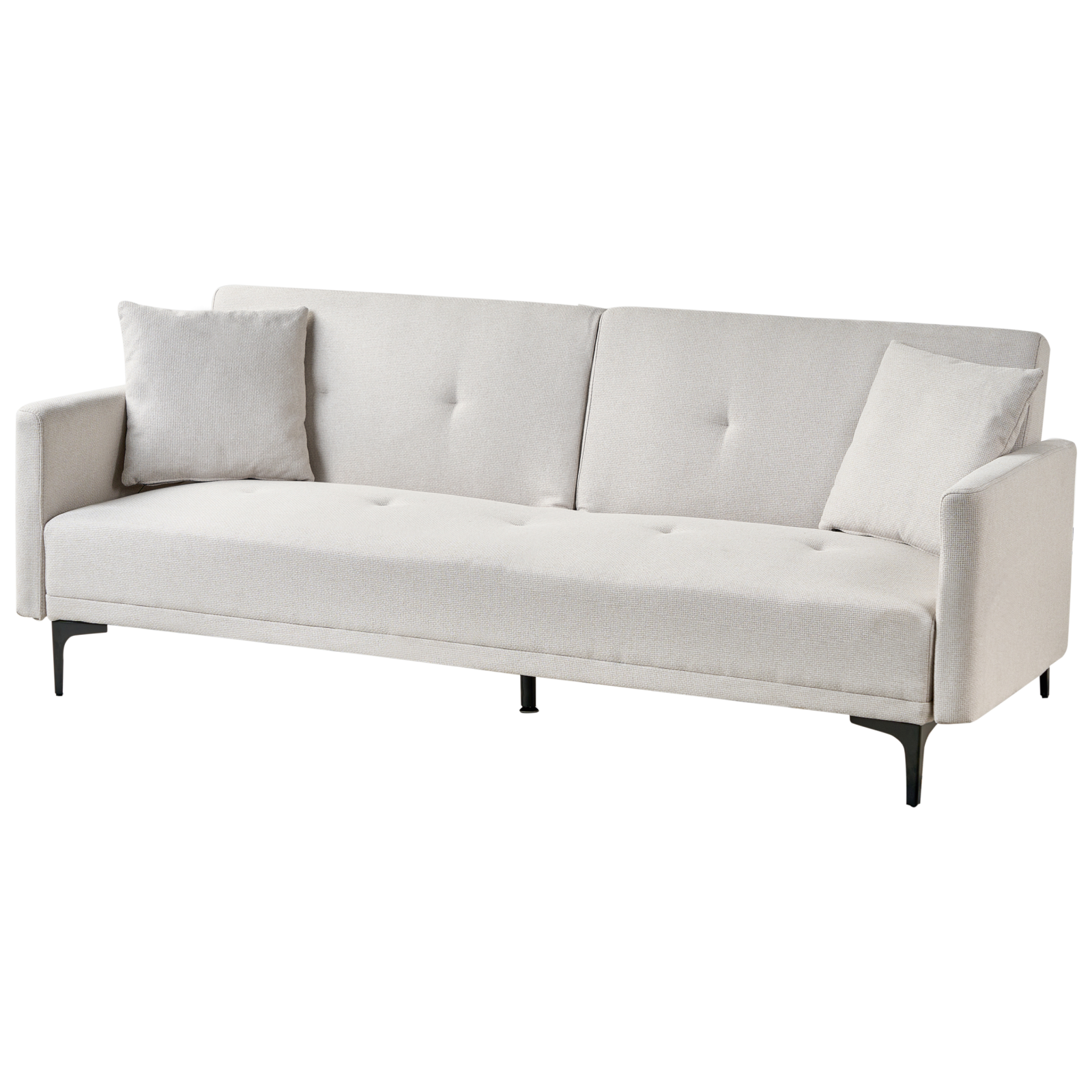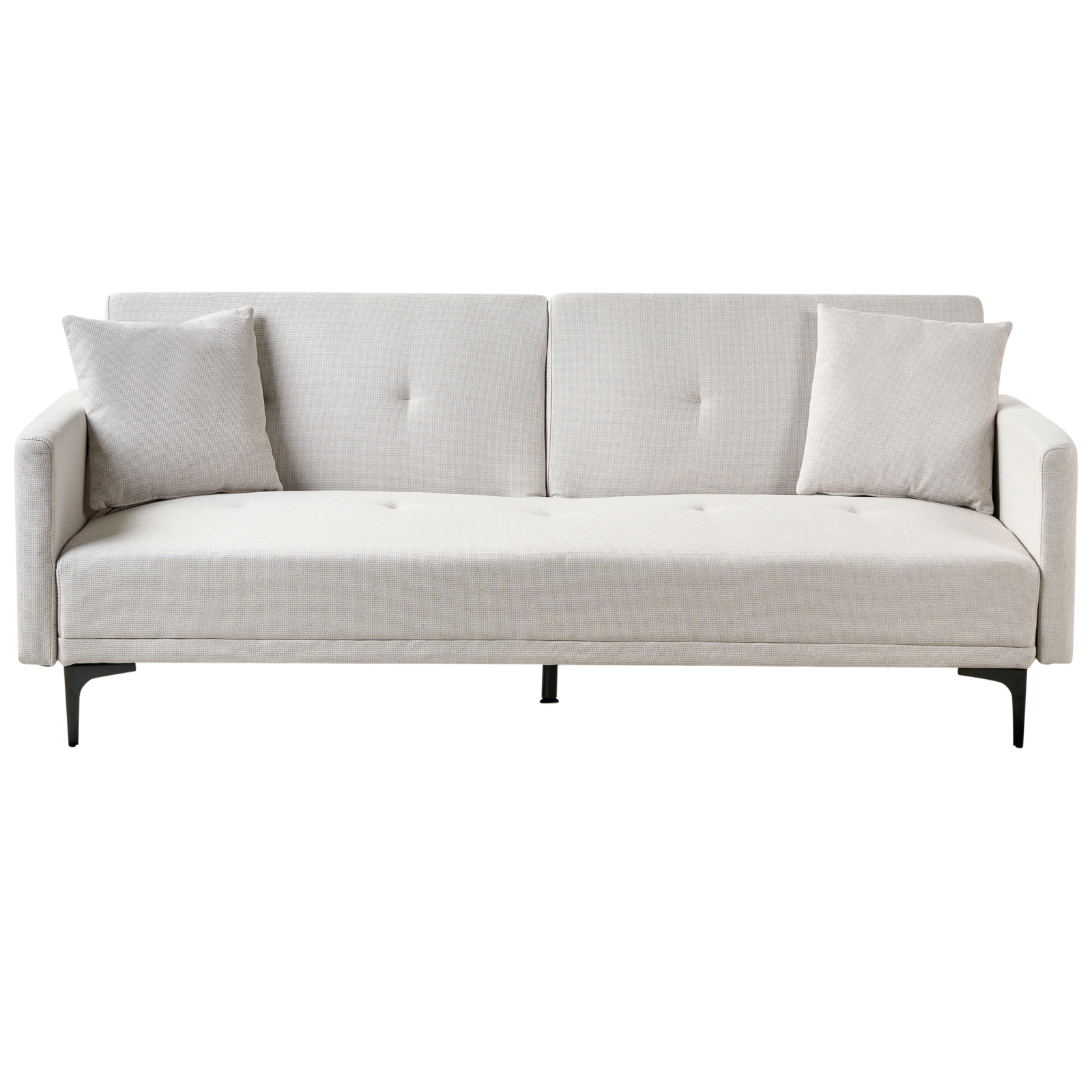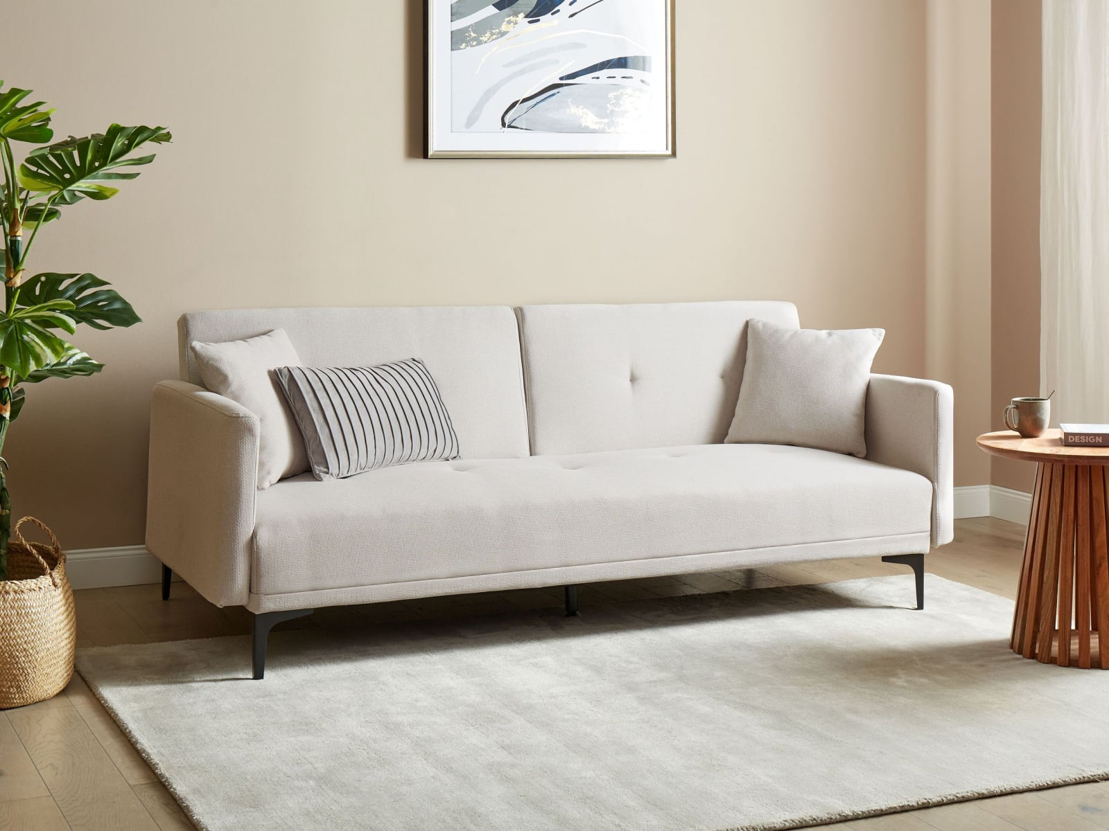 Canapea extensibiă modernă. Decorează-ți livingul cu această canapea extensibilă, perfectă pentru spațiile mici. Tapițeria moale și durabilă, cadrul din lemn de eucalipt și picioarele din metal îți garantează confort și stabilitate. Husele detașabile sunt ușor de curățat, iar spătarul reglabil se transformă rapid într-un pat confortabil, oferind un loc suplimentar de dormit. Designul său versatil se potrivește perfect în orice tip de interior, aducând un plus de stil și confort casei tale. Detalii: Tip de Produs: Canapea extensibilă. Stil: Retro. Culoare: Bej. Nuanță: Bej deschis. Material: Țesătură. Material primar: Țesătură. Material secundar: Oțel. Căptușeală: Spumă. Compoziția materialului: 100% Poliester. Stilul cotierei: Liniar. Protecții pentru picioare incluse: Da. Reclinabil: Nu. Huse detașabile de perne: Da. Structura scaunului: Arcuri ondulate. Densitatea pernei scaunului: 50 kg/m3. Locuri până la: 3 persoane. Funcție de dormit: Da. Funcție extensibilă: Click-Clack. Depozitare: Nu. Dimensiuni: Înălțimea cotierei: 55 cm. Adâncime: 91 cm. Grosimea scaunului: 17 cm. Înălțimea scaunului: 37 cm. Lățime: 191 cm. Înălțime: 75 cm. Suprafața de ședere: 175x50 cm. Suprafața de dormit: 175x102 cm. Greutate: 40 kg. Capacitatea de greutate per persoană: 75 kg. Oferta incude: 1 x Canapea, 2 x Pernă decorativă. Caracteristici cheie: Ușor de transformat în pat, Șezut lat, capitonat gros, Design tradițional cu o notă modernă, Tapițerie din țesătură de înaltă calitate, Perne detașabile pentru o curățare ușoară, Tapițată complet, Capace pentru picioare pentru protecția suprafeței. Asamblare: Necesită asamblare parțială.20-40 min. Informații suplimentare: Pentru a facilita transportul, picioarele au fost plasate într-un buzunar sub scaun. Sfaturi de întreținere: Țesătură: 1.Vă rugăm să curățați cu un șampon uscat și un burete umed sau cu un detergent ușor. 2.Aspirati folosind un accesoriu potrivit. Oțel: 1.Curățați cu un detergent delicat și o cârpă moale, apoi ștergeți bine. 2.Pentru a evita zgârieturile, nu folosiți produse de curățare abrazive. 3.Pentru elementele din cupru sau crom, folosiți un agent de lustruire.