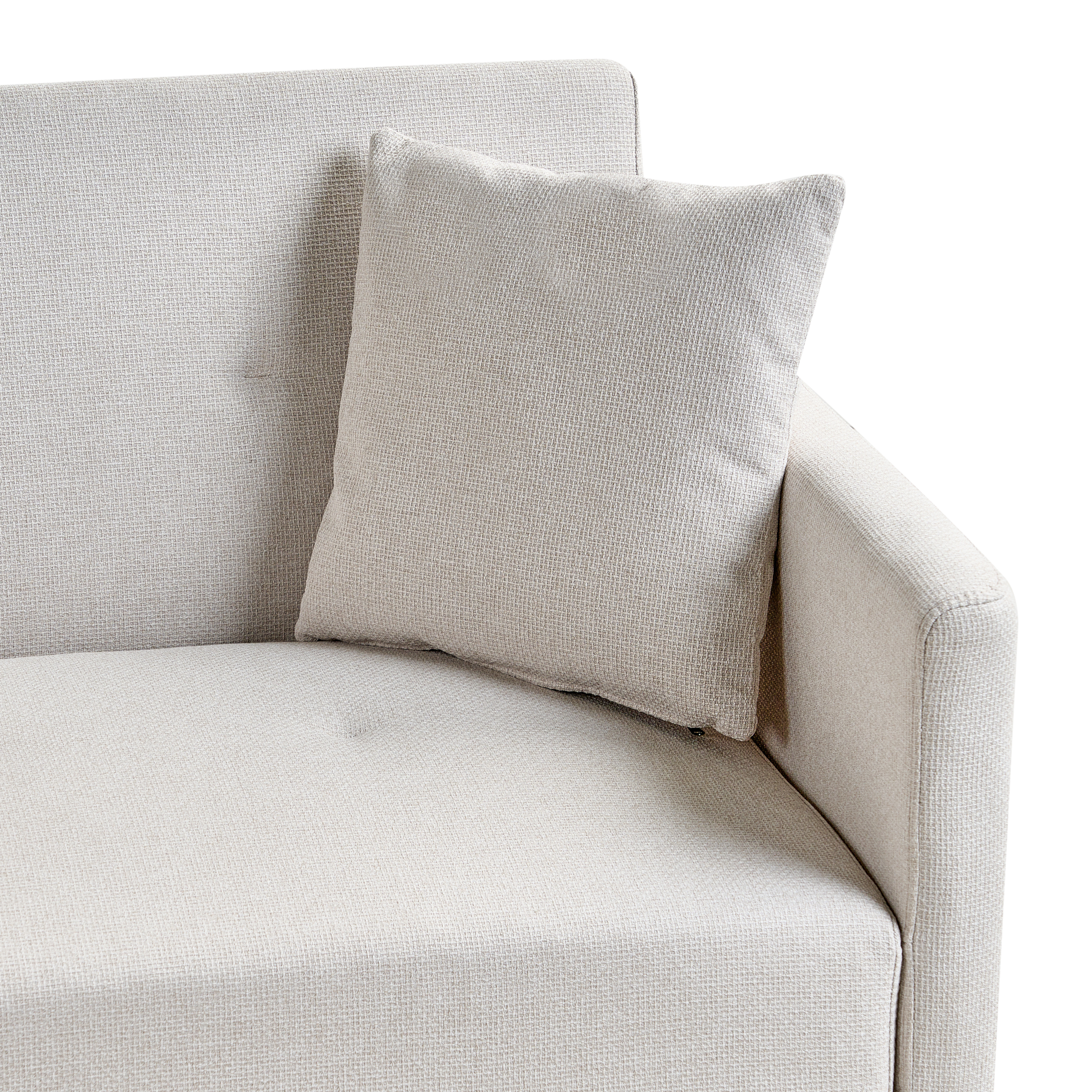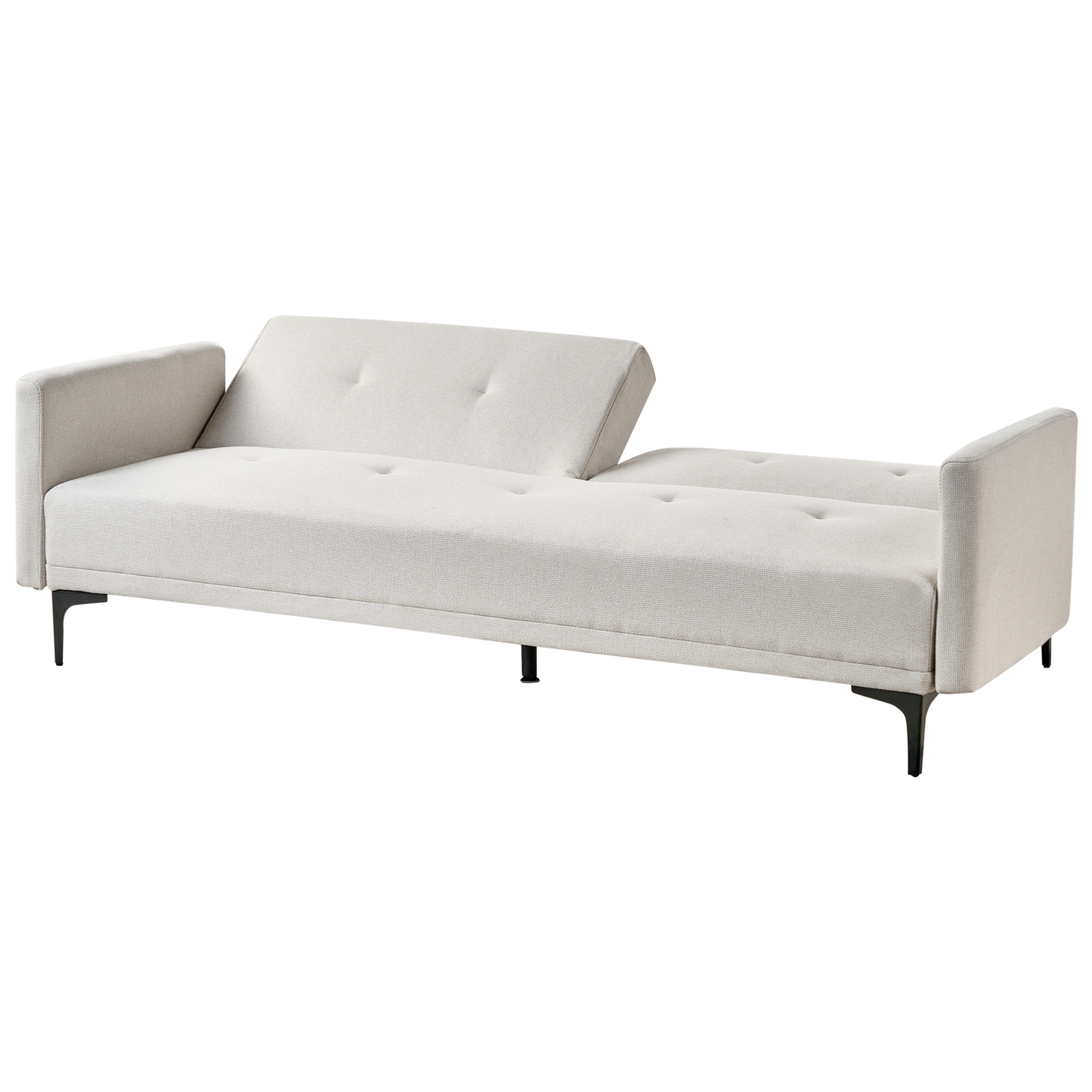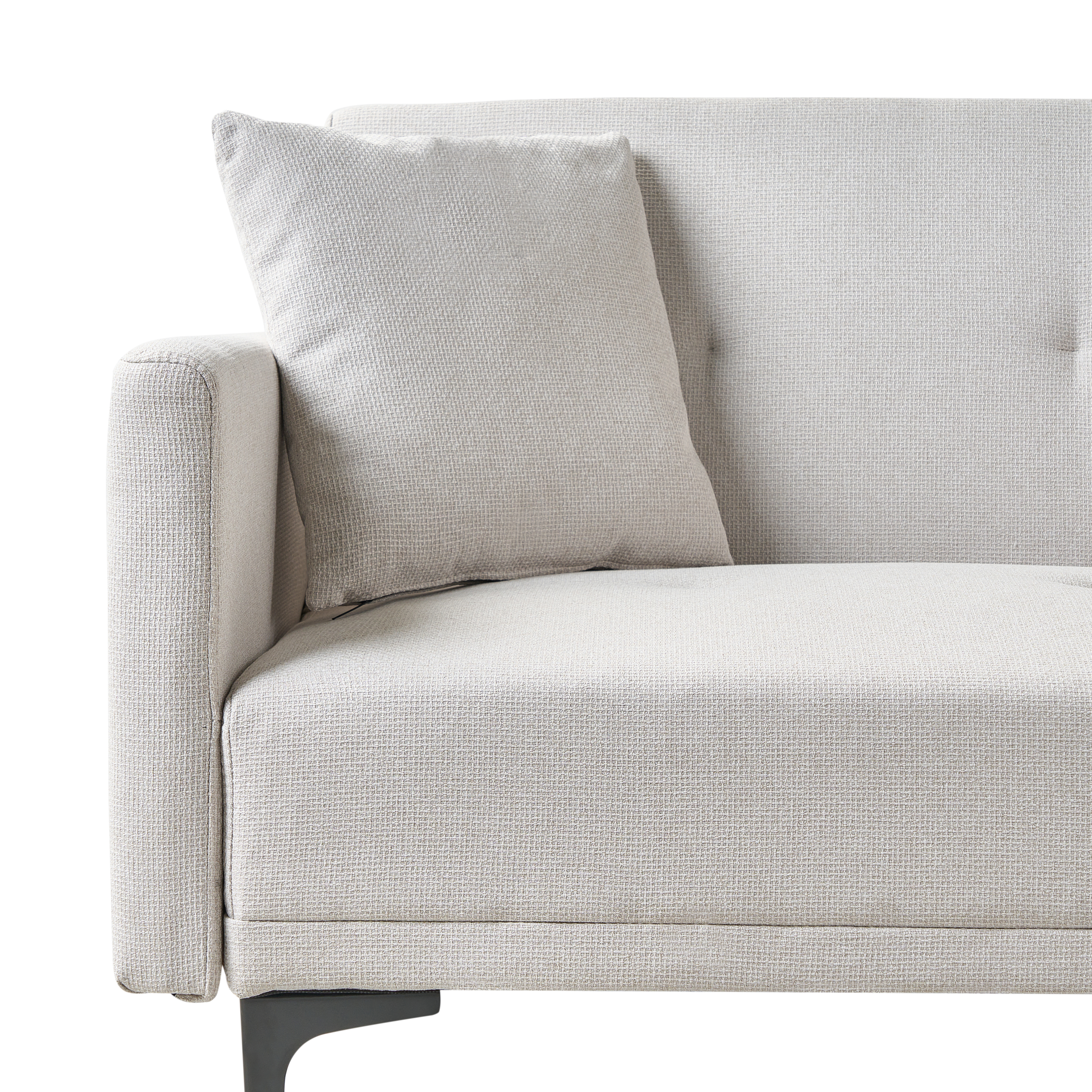 Canapea extensibiă modernă. Decorează-ți livingul cu această canapea extensibilă, perfectă pentru spațiile mici. Tapițeria moale și durabilă, cadrul din lemn de eucalipt și picioarele din metal îți garantează confort și stabilitate. Husele detașabile sunt ușor de curățat, iar spătarul reglabil se transformă rapid într-un pat confortabil, oferind un loc suplimentar de dormit. Designul său versatil se potrivește perfect în orice tip de interior, aducând un plus de stil și confort casei tale. Detalii: Tip de Produs: Canapea extensibilă. Stil: Retro. Culoare: Bej. Nuanță: Bej deschis. Material: Țesătură. Material primar: Țesătură. Material secundar: Oțel. Căptușeală: Spumă. Compoziția materialului: 100% Poliester. Stilul cotierei: Liniar. Protecții pentru picioare incluse: Da. Reclinabil: Nu. Huse detașabile de perne: Da. Structura scaunului: Arcuri ondulate. Densitatea pernei scaunului: 50 kg/m3. Locuri până la: 3 persoane. Funcție de dormit: Da. Funcție extensibilă: Click-Clack. Depozitare: Nu. Dimensiuni: Înălțimea cotierei: 55 cm. Adâncime: 91 cm. Grosimea scaunului: 17 cm. Înălțimea scaunului: 37 cm. Lățime: 191 cm. Înălțime: 75 cm. Suprafața de ședere: 175x50 cm. Suprafața de dormit: 175x102 cm. Greutate: 40 kg. Capacitatea de greutate per persoană: 75 kg. Oferta incude: 1 x Canapea, 2 x Pernă decorativă. Caracteristici cheie: Ușor de transformat în pat, Șezut lat, capitonat gros, Design tradițional cu o notă modernă, Tapițerie din țesătură de înaltă calitate, Perne detașabile pentru o curățare ușoară, Tapițată complet, Capace pentru picioare pentru protecția suprafeței. Asamblare: Necesită asamblare parțială.20-40 min. Informații suplimentare: Pentru a facilita transportul, picioarele au fost plasate într-un buzunar sub scaun. Sfaturi de întreținere: Țesătură: 1.Vă rugăm să curățați cu un șampon uscat și un burete umed sau cu un detergent ușor. 2.Aspirati folosind un accesoriu potrivit. Oțel: 1.Curățați cu un detergent delicat și o cârpă moale, apoi ștergeți bine. 2.Pentru a evita zgârieturile, nu folosiți produse de curățare abrazive. 3.Pentru elementele din cupru sau crom, folosiți un agent de lustruire.