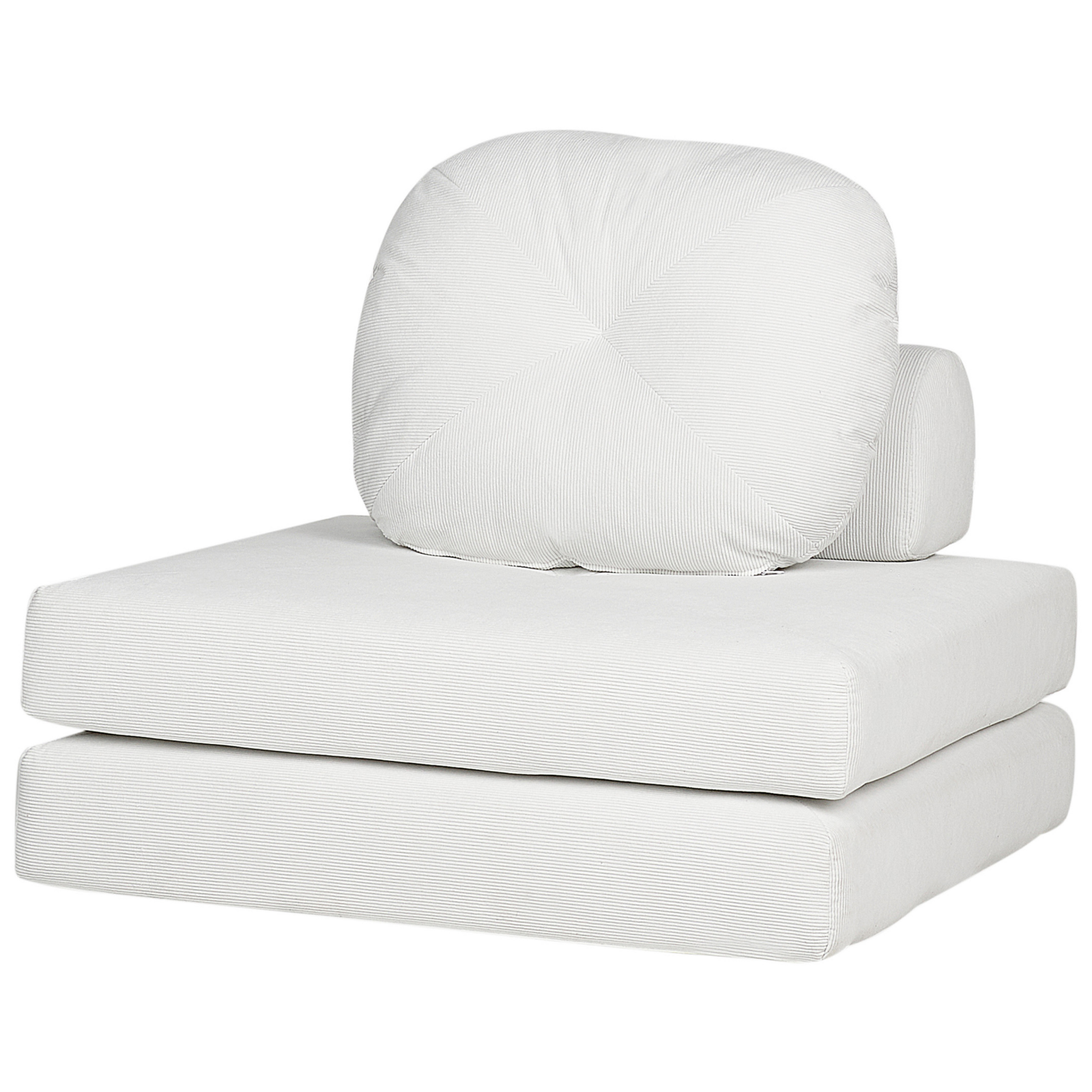 Fotoliu extensibil alb. Bucură-te de confort cu canapeaua extensibilă pentru o persoană, creată special pentru a se adapta stilului tău de viață. Dotată cu două perne de șezut și două decorative, îți oferă libertatea de a le aranja așa cum dorești. Se transformă rapid într-un fotoliu, șezlong sau pat single, în funcție de nevoi. Husele detașabile fac întreținerea simplă și practică. O soluție modernă, ideală pentru spații multifuncționale, fără compromisuri la stil. Detalii: Tip de Produs: Canapea extensibilă. Stil: Modern. Culoare: Alb. Nuanță: Alb-murdar. Material: Țesătură. Material primar: Velur. Căptușeală: Spumă. Compoziția materialului: 100% Poliester. Stilul cotierei: Fără cotiere. Protecții pentru picioare incluse: Nu. Reclinabil: Nu. Huse detașabile de perne: Da. Structura scaunului: Arcuri cu buzunare. Densitatea pernei scaunului: 22 kg/m3. Locuri până la: 1 persoană. Funcție de dormit: Da. Funcție extensibilă: Pliabil. Depozitare: Nu. Dimensiuni: Adâncime: 91 cm. Grosimea scaunului: 32 cm. Înălțimea scaunului: 32 cm. Lățime: 81 cm. Înălțime: 54 cm. Suprafața de ședere: 81x91 cm. Suprafața de dormit: 81x182 cm. Greutate: 14 kg. Capacitatea de greutate per persoană: 80 kg. Oferta incude: 2 x Pernă pentru șezut, 2 x Pernă decorativă. Caracteristici cheie: Ușor de transformat în pat, Se adaptează la orice stil de interior, De înaltă calitate, Perne detașabile pentru o curățare ușoară, Compact, Mobilier multifuncțional. Asamblare: Necesită asamblare parțială.5-15 min. Sfaturi de întreținere: Velur: 1.Spălați manual, folosind doar apă rece și un detergent delicat. 2.Nu se usucă la mașina de uscat și nu se calcă.