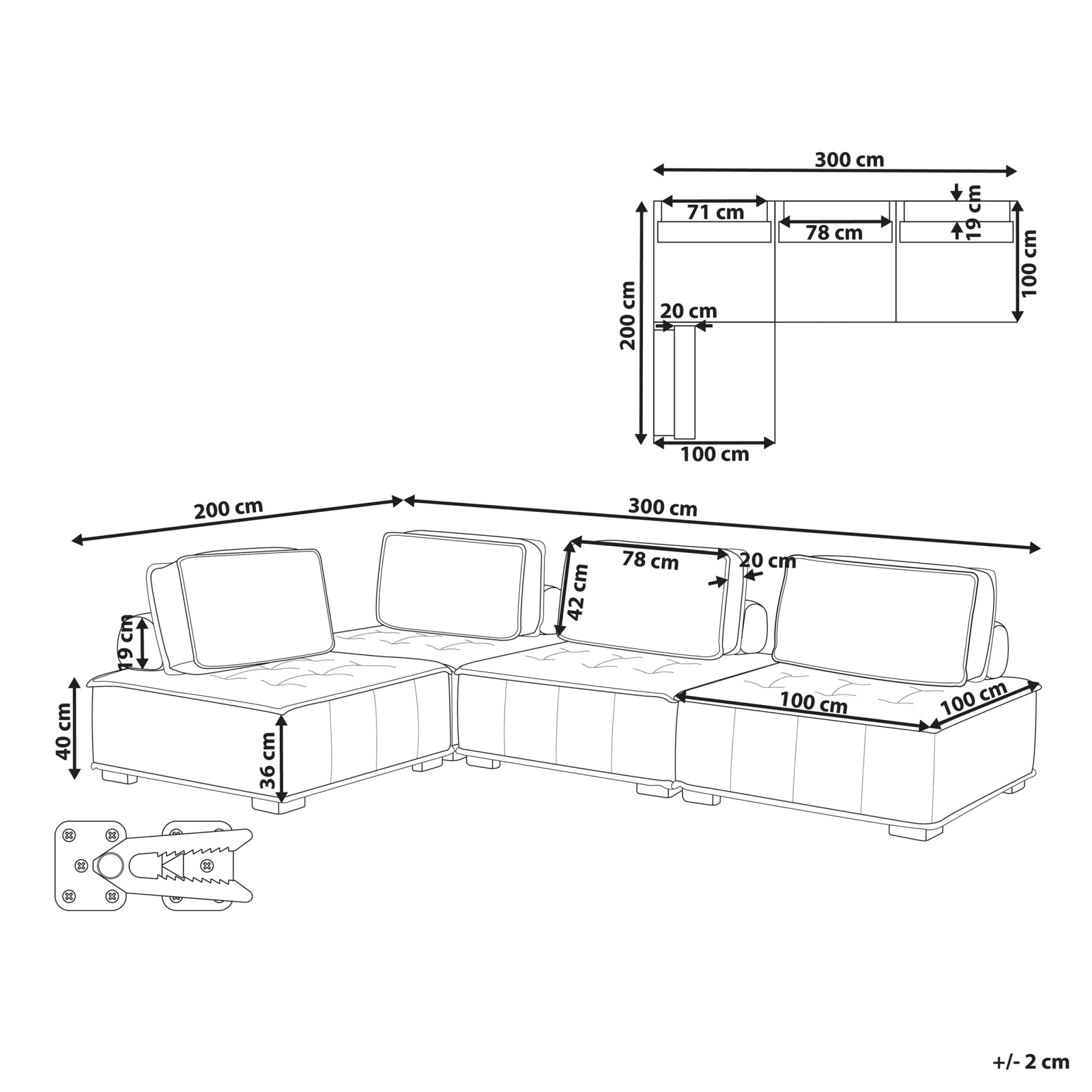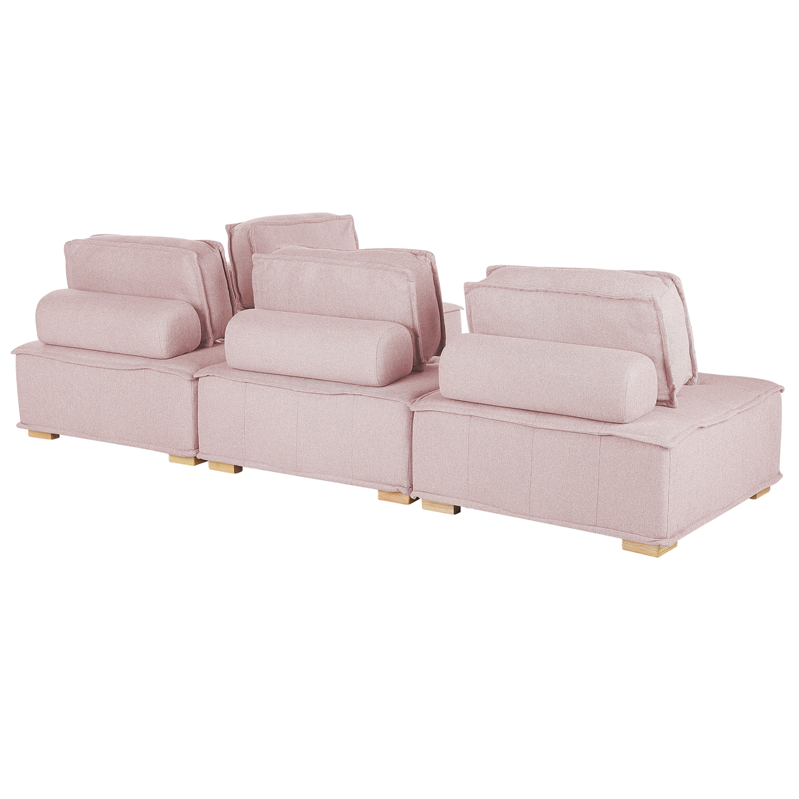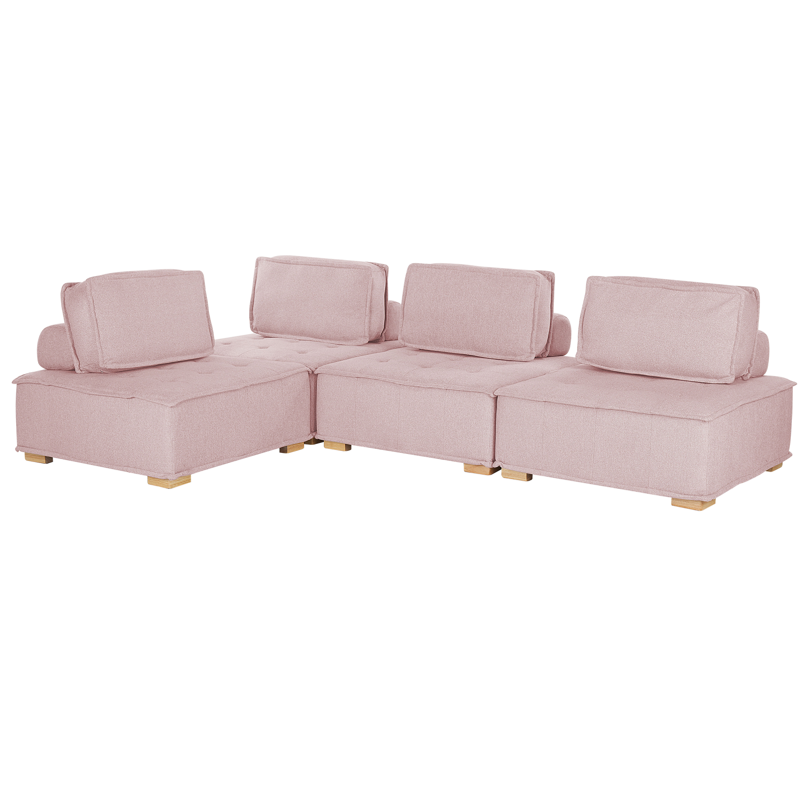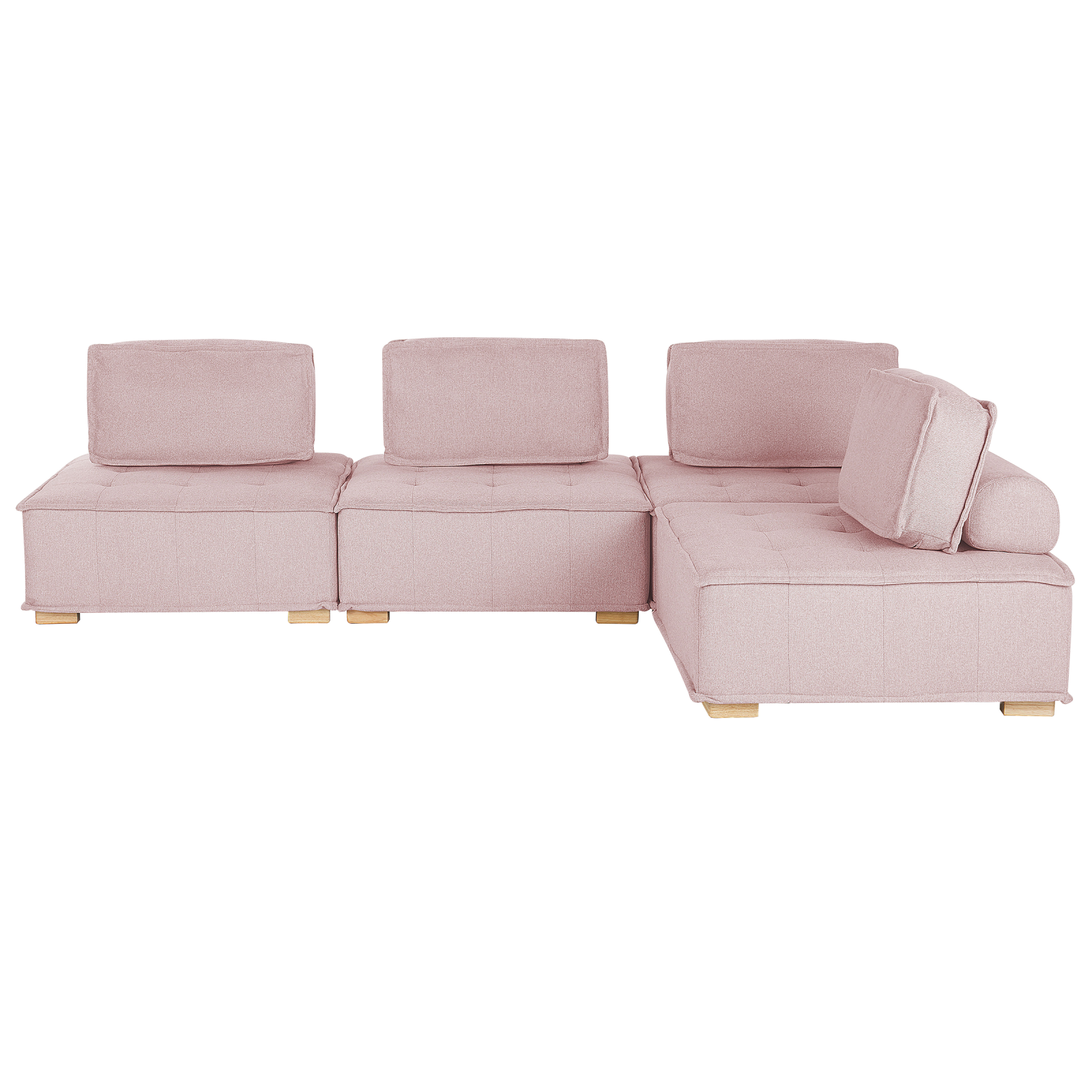Canapea colțar modulară cu perne. Adaugă confort și stil livingului tău cu acest colțar modular, tapițat cu material ușor de întreținut. Picioarele din lemn oferă stabilitate, iar detaliile cu butoane și tivul clasic dau un aer tradițional, ideal pentru interioare minimaliste sau scandinave. Spătarul include o pernă groasă cu husă detașabilă, iar modulele pot fi conectate cu clemele de fixare pentru a forma o canapea compactă. Detalii: Tip de Produs: Canapea modulară. Stil: Modern. Culoare: Roz. Material: Țesătură. Material primar: Țesătură. Material secundar: Lemn de cauciuc. Căptușeală: Spumă. Compoziția materialului: 100% Poliester. Formă: În formă de L. Stilul cotierei: Fără cotiere. Spate căptușit: Da. Protecții pentru picioare incluse: Da. Orientare: Dreapta. Model: Culoare solidă. Structura scaunului: Lemn. Densitatea pernei scaunului: 28 kg/m3. Locuri până la: 4 persoane. Dimensiuni: Adâncime: 200 cm. Grosimea scaunului: 36 cm. Înălțimea scaunului: 40 cm. Lățime: 300 cm. Înălțime: 40 cm. Suprafața de ședere: 300x100 cm. Greutate: 91 kg. Capacitatea de greutate per persoană: 120 kg. Oferta incude: 4 x Fotoliu modular. Caracteristici cheie: Poate fi combinat cu alte elemente modulare din colecție, Clemele de fixare Easy-Click mențin modulele unite, Se integrează practic cu orice stil de amenajare, Cu un tufting decorativ clasic, Materiale de cea mai bună calitate, Tapițată complet, Perne de spate cu huse detașabile. Asamblare: Necesită asamblare parțială.20-40 min. Informații suplimentare: Pentru a facilita transportul, picioarele au fost plasate într-un buzunar sub scaun. Sfaturi de întreținere: Țesătură: 1.Vă rugăm să curățați cu un șampon uscat și un burete umed sau cu un detergent ușor. 2.Aspirati folosind un accesoriu potrivit. Lemn de cauciuc: 1.Curățați cu un detergent delicat și o cârpă moale, urmând direcția fibrelor. 2.Ștergeți imediat după curățare pentru a preveni acumularea apei pe produs. 3.Pentru a păstra mobila finisată cu ulei în stare bună, este necesar să o ungeți cu ulei după un timp.