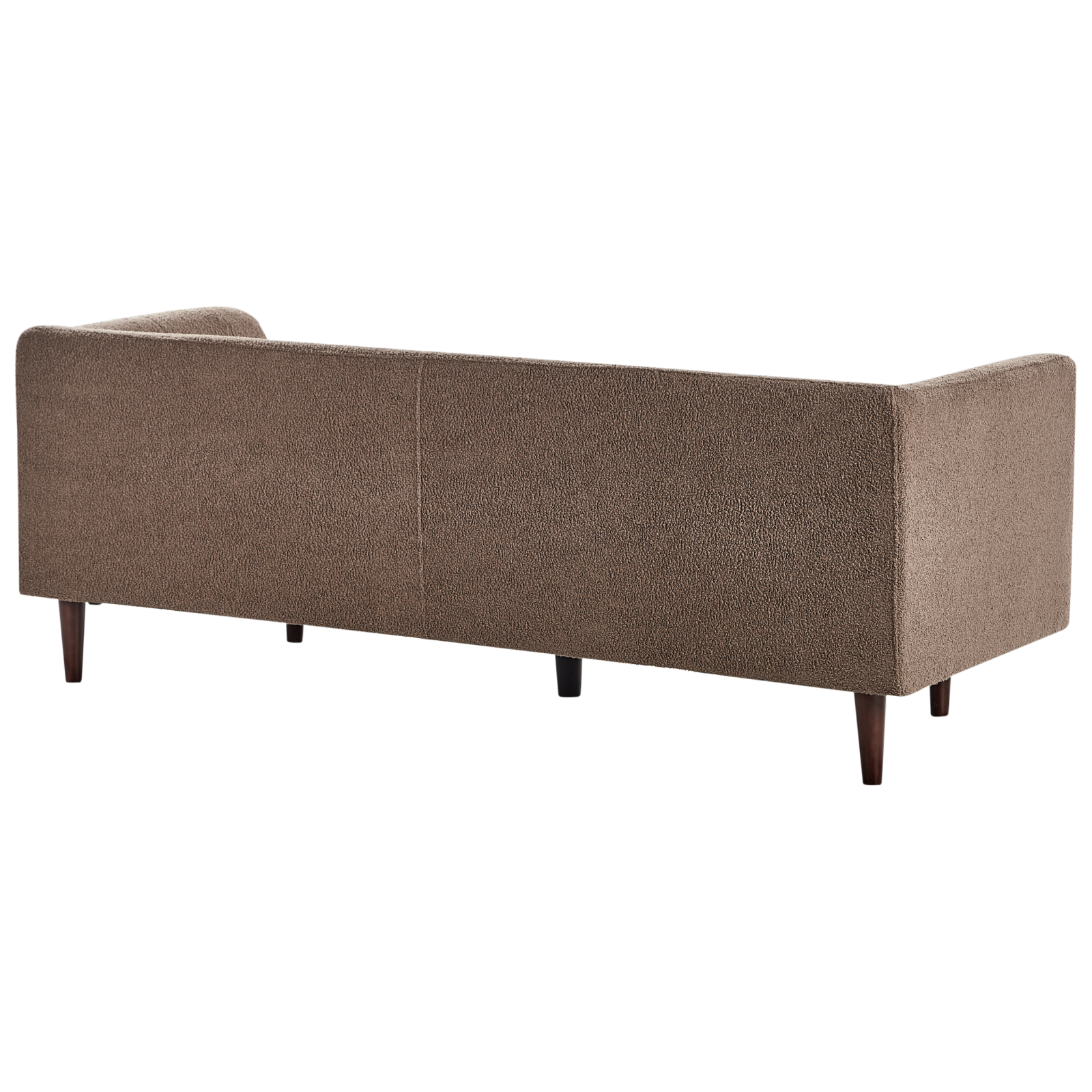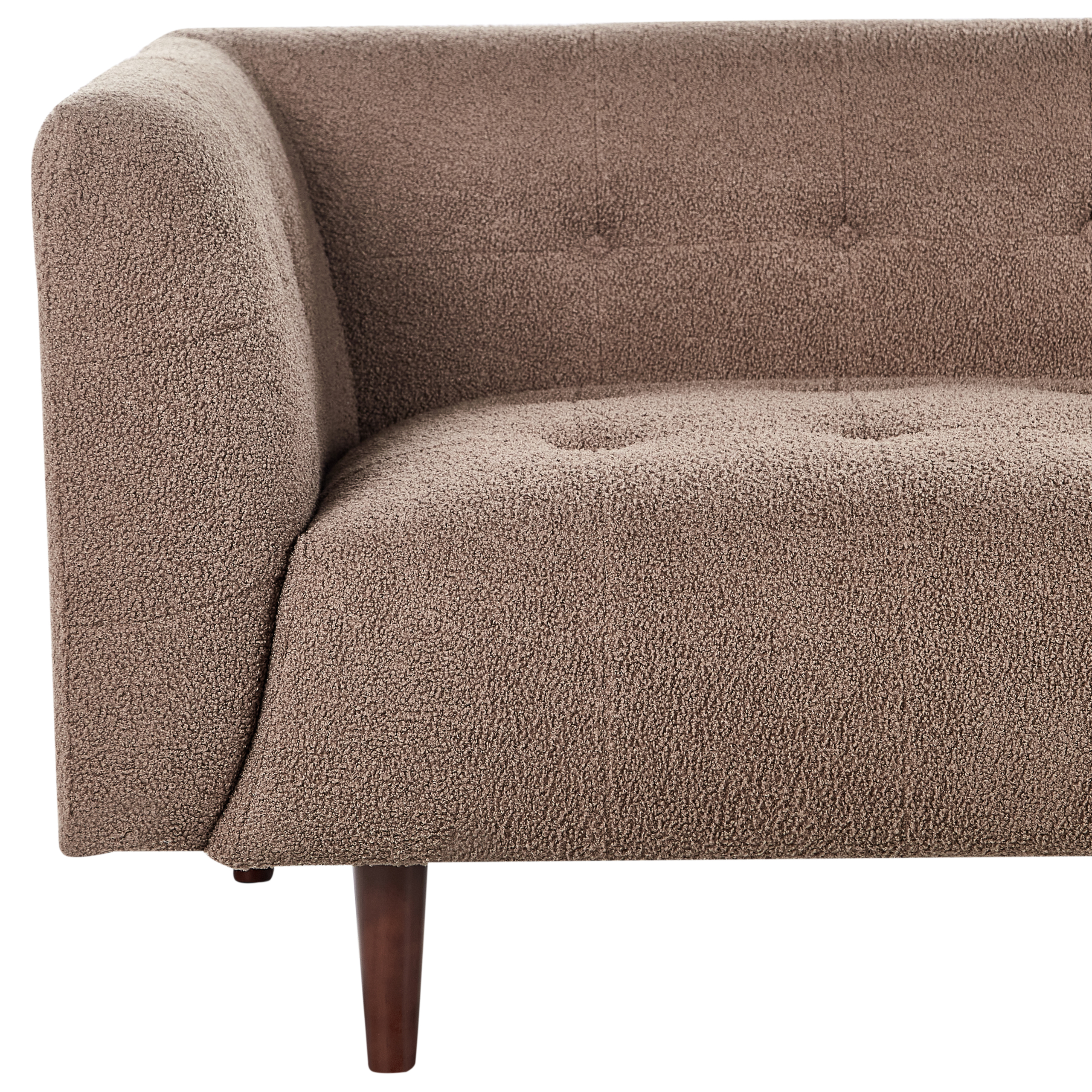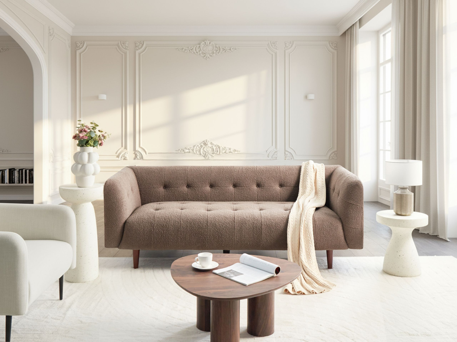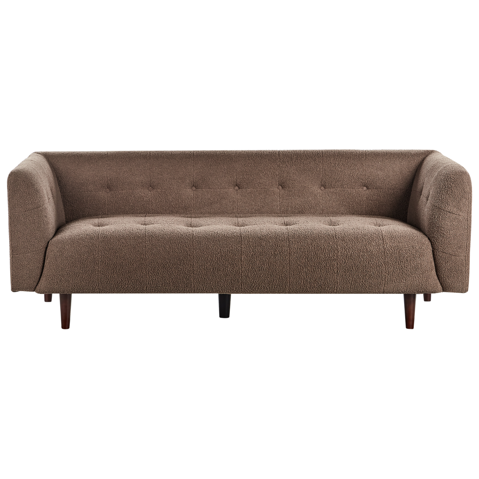Canapea elegantă cu 3 locuri. Această canapea modernă cu design luxos îți transformă livingul într-un spațiu elegant. Oferă loc pentru 3 persoane, are șezut gros pentru confort deplin, detalii capitonate cu nasturi și picioare subțiri din lemn de cauciuc pentru un stil atemporal. Detalii: Tip de Produs: Canapea cu 3 locuri. Stil: Retro. Culoare: Maro. Material: Țesătură. Material primar: Boucle. Material secundar: Lemn de cauciuc. Căptușeală: Spumă. Compoziția materialului: 100% Poliester. Stilul cotierei: Liniar. Model: Culoare solidă. Structura scaunului: Arcuri ondulate. Densitatea pernei scaunului: 24 kg/m3. Locuri până la: 3 persoane. Dimensiuni: Înălțimea cotierei: 73 cm. Adâncime: 78 cm. Grosimea scaunului: 11 cm. Înălțimea scaunului: 44 cm. Lățime: 200 cm. Înălțime: 73 cm. Suprafața de ședere: 165x62 cm. Greutate: 42 kg. Capacitatea de greutate per persoană: 150 kg. Oferta incude: 1 x Canapea cu 3 locuri. Caracteristici cheie: Se adaptează la orice stil de interior, Decorată cu un tuft cu buton, Tapițerie din țesătură de înaltă calitate, Tapițată complet, Picioare cu tampoane de cauciuc antiderapante. Asamblare: Picioare neasamblate.5-15 min. Sfaturi de întreținere: Boucle: 1.Vă rugăm să curățați cu un șampon uscat și un burete umed sau cu un detergent ușor. 2.Aspirati folosind un accesoriu potrivit. Lemn de cauciuc: 1.Curățați cu un detergent delicat și o cârpă moale, urmând direcția fibrelor. 2.Ștergeți imediat după curățare pentru a preveni acumularea apei pe produs. 3.Pentru a păstra mobila finisată cu ulei în stare bună, este necesar să o ungeți cu ulei după un timp.