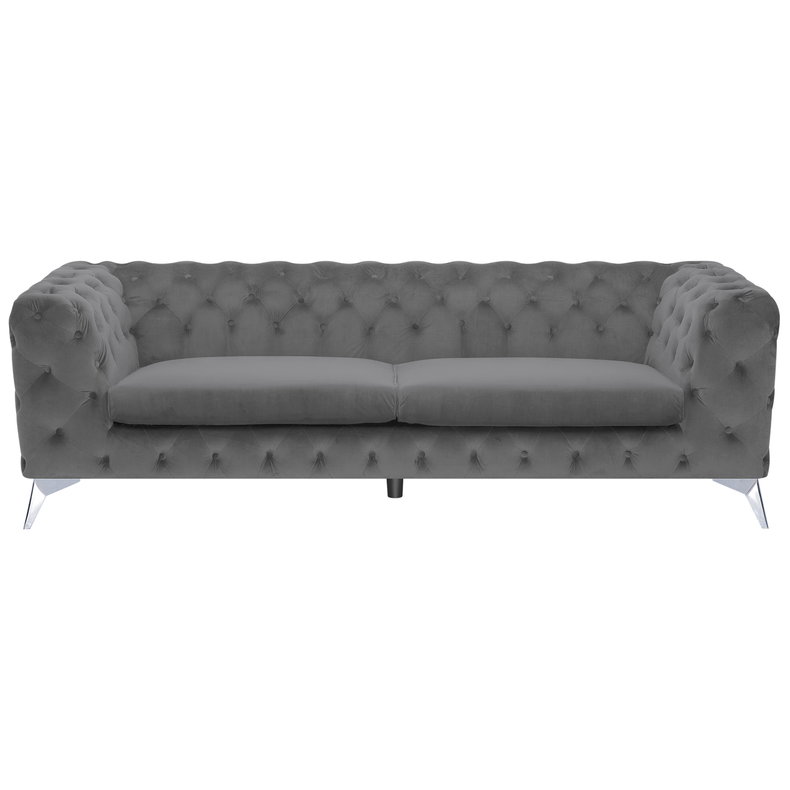 Canapea Chesterfield din catifea. Această canapea cu trei locuri, cu o siluetă elegantă adaugă un aer rafinat oricărui interior, oferind în același timp confort și stil. Confecționată din catifea moale la atingere, cu detalii cu butoane, completată cu picioare metalice moderne, se potrivește perfect atât în decoruri tradiționale, cât și în cele contemporane, de la minimalism la glamour. Un plus de eleganță și confort pentru orice locuință. Detalii: Tip de Produs: Canapea cu 3 locuri. Stil: Glamour. Culoare: Gri. Material: Țesătură. Material primar: Catifea. Material secundar: Lemn de pin. Căptușeală: Spumă. Compoziția materialului: 100% Poliester. Stilul cotierei: Liniar. Model: Culoare solidă. Structura scaunului: Arcuri ondulate. Densitatea pernei scaunului: 30 kg/m3. Locuri până la: 3 persoane. Dimensiuni: Înălțimea cotierei: 70 cm. Adâncime: 85 cm. Grosimea scaunului: 15 cm. Înălțimea scaunului: 45 cm. Lățime: 224 cm. Înălțime: 70 cm. Suprafața de ședere: 165x59 cm. Greutate: 47 kg. Capacitatea de greutate per persoană: 150 kg. Oferta incude: 1 x Canapea. Caracteristici cheie: Scaun jos și adânc, Design tradițional cu o notă modernă, Adaugă o notă de stil în orice cameră, Tapițerie din țesătură de înaltă calitate, Structură proiectată pentru a oferi stabilitate maximă, Țesătură de catifea netedă și mătăsoasă, Tapițată complet. Asamblare: Picioare neasamblate.5-15 min. Informații suplimentare: Rețineți că țesătura de catifea poate avea un aspect puțin diferit atunci când este expusă la lumină; tinde să fie mai strălucitoare și mai luminoasă în lumina soarelui, în timp ce în lumină artificială are un ton diferit, mai închis. Datorită tipului de țesătură, tonul catifelei poate varia, de asemenea, atunci când este atinsă din direcții diferite. Pentru a uniformiza culoarea și a scăpa de lovituri și cute, materialul trebuie mângâiat cu palma deschisă într-o singură direcție, frecat cu o cârpă umedă sau călcat cu abur. Sfaturi de întreținere: Catifea: 1.Vă rugăm să curățați cu un șampon uscat și un burete umed sau cu un detergent ușor. 2.Aspirati folosind un accesoriu potrivit. Metal: 1.Curățați cu un detergent delicat și o cârpă moale, apoi ștergeți bine. 2.Pentru a evita zgârieturile, nu folosiți produse de curățare abrazive. 3.Pentru elementele din cupru sau crom, folosiți un agent de lustruire.