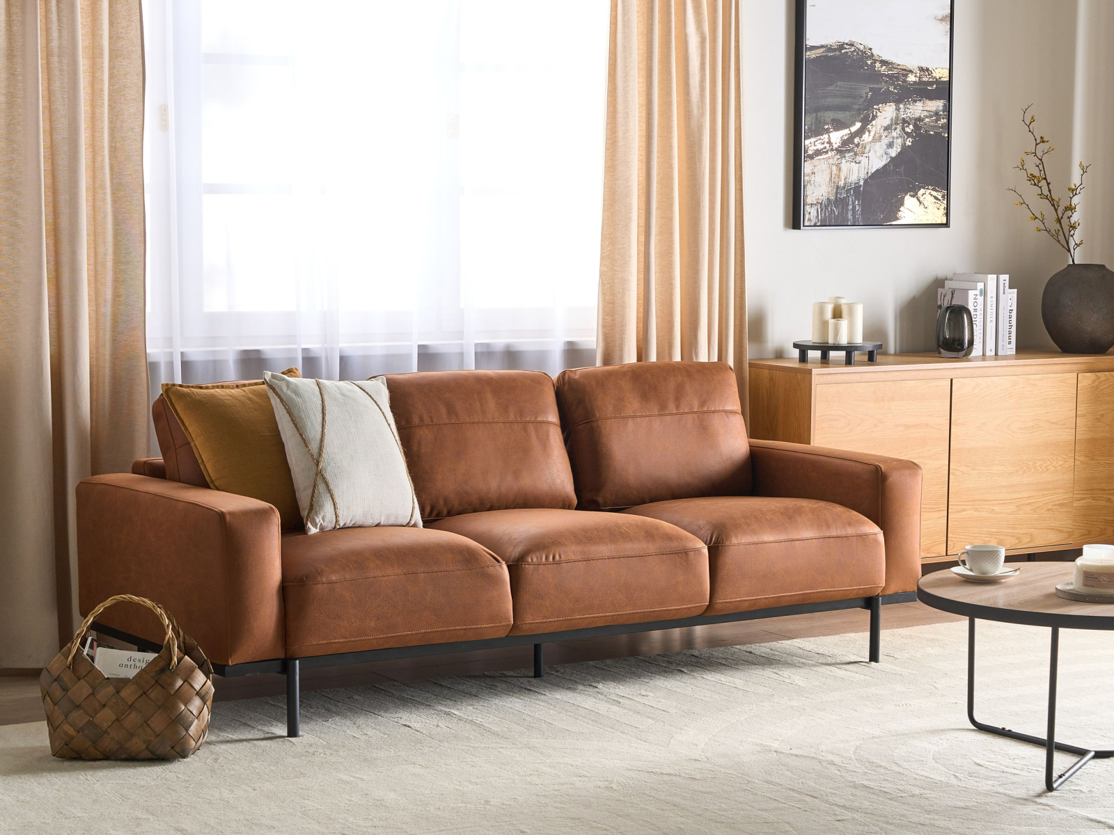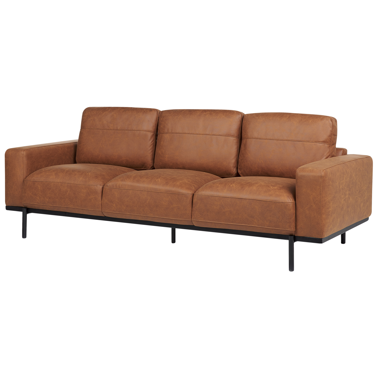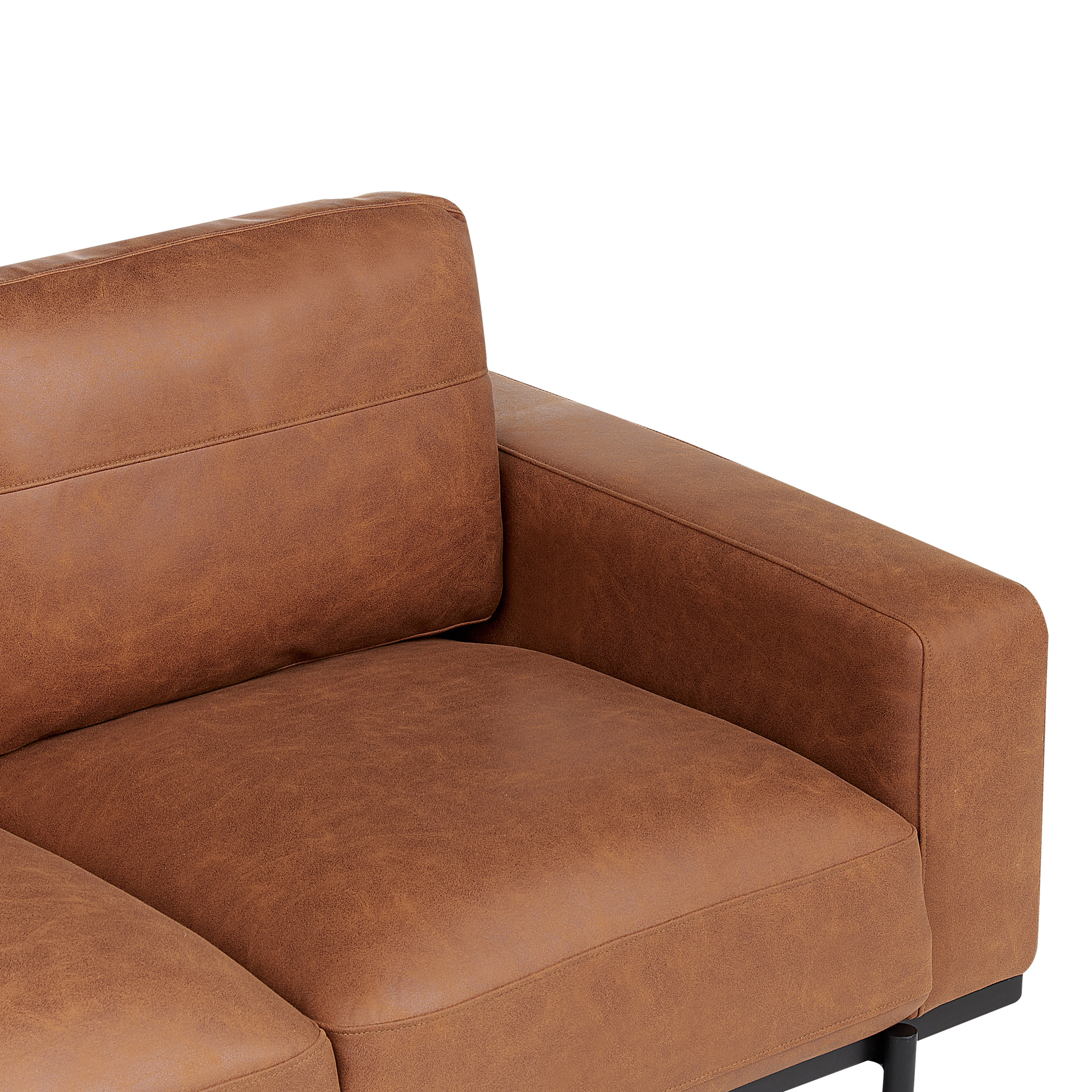 Canapea modernă cu efect de piele. Canapeaua cu 3 locuri îți oferă combinația perfectă între stil și confort. Tapițată cu țesătură fină, aduce o notă luxoasă oricărui spațiu. Picioarele metalice rezistente completează designul minimalist cu un aer urban modern. Ideală pentru momente de relaxare, această piesă elegantă unește rafinamentul cu funcționalitatea. Detalii: Tip de Produs: Canapea cu 3 locuri. Stil: Modern. Culoare: Maro. Material: Țesătură. Material primar: Țesătură. Material secundar: Metal. Căptușeală: Spumă. Compoziția materialului: 100% Poliester. Stilul cotierei: Liniar. Model: Culoare solidă. Structura scaunului: Arcuri ondulate. Densitatea pernei scaunului: 30 kg/m3. Locuri până la: 3 persoane. Dimensiuni: Înălțimea cotierei: 51 cm. Adâncime: 87 cm. Grosimea scaunului: 27 cm. Înălțimea scaunului: 40 cm. Lățime: 215 cm. Înălțime: 72 cm. Suprafața de ședere: 180x55 cm. Greutate: 53 kg. Capacitatea de greutate per persoană: 136 kg. Oferta incude: 1 x Canapea cu 3 locuri. Caracteristici cheie: Cotiere confortabile, Scaun gros pentru confort maxim, Design tradițional cu o notă modernă, Tapițerie din piele ecologică de înaltă calitate pentru un aspect natural, Tapițată complet. Asamblare: Necesită asamblare completă.5-15 min. Sfaturi de întreținere: Țesătură: 1.Vă rugăm să curățați cu un șampon uscat și un burete umed sau cu un detergent ușor. 2.Aspirati folosind un accesoriu potrivit. Metal: 1.Curățați cu un detergent delicat și o cârpă moale, apoi ștergeți bine. 2.Pentru a evita zgârieturile, nu folosiți produse de curățare abrazive. 3.Pentru elementele din cupru sau crom, folosiți un agent de lustruire.