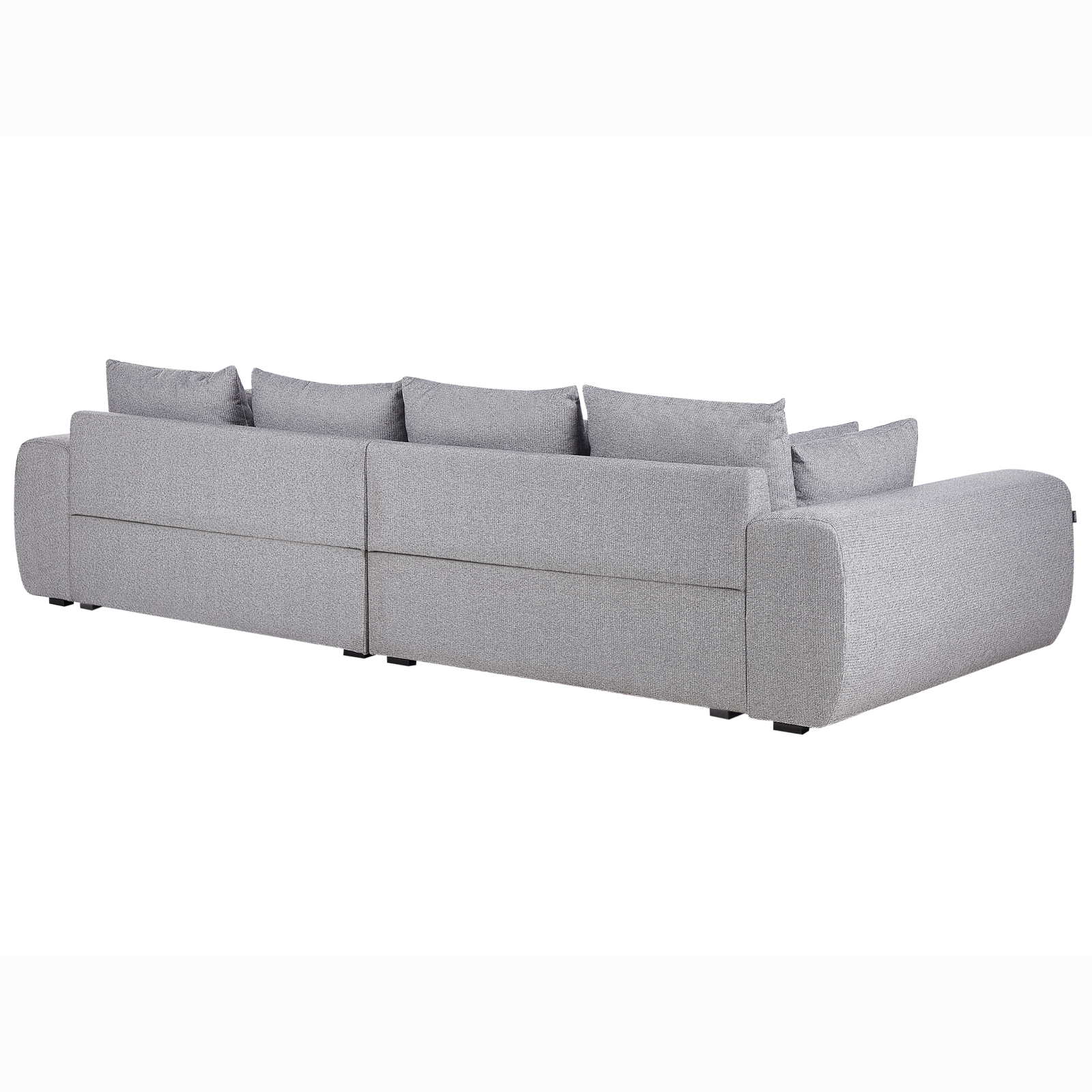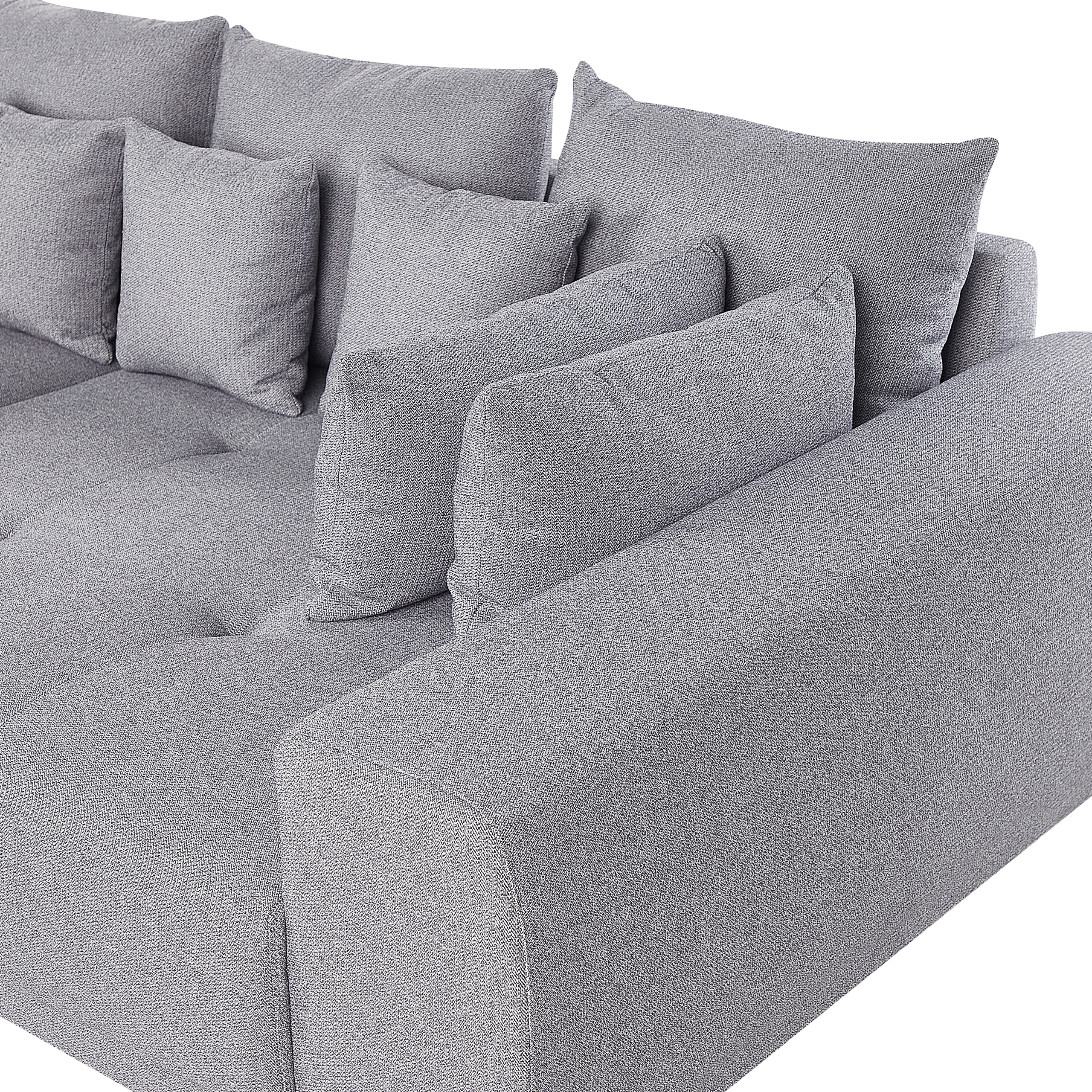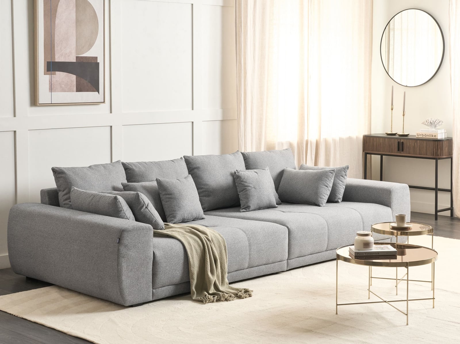 Canapea spațioasă pentru living. Această canapea de living extraordinară, de dimensiuni mari, este piesa centrală ideală pentru orice locuință, mai ales pentru cele cu spațiu generos dedicat mobilierului de designer. Concepută pentru relaxare absolută, oferă o suprafață de ședere groasă și confortabilă, suficient de spațioasă încât să te poți întinde complet și să te bucuri de un confort excepțional. Paleta cromatică deschisă este subtilă și delicată, fiind ușor de integrat în orice interior modern. Este susținută de picioare din lemn, care asigură stabilitate și un plus de eleganță. Detalii: Tip de Produs: Canapea cu 4 locuri. Stil: Modern. Culoare: Gri. Material: Țesătură. Material primar: Țesătură. Material secundar: Lemn de eucalipt. Căptușeală: Spumă. Compoziția materialului: 100% Poliester. Stilul cotierei: Liniar. Model: Culoare solidă. Structura scaunului: Arcuri ondulate. Densitatea pernei scaunului: 25 kg/m3. Locuri până la: 4 persoane. Dimensiuni: Înălțimea cotierei: 54 cm. Adâncime: 136 cm. Grosimea scaunului: 35 cm. Înălțimea scaunului: 41 cm. Lățime: 308 cm. Înălțime: 84 cm. Suprafața de ședere: 252x121 cm. Greutate: 102 kg. Capacitatea de greutate per persoană: 150 kg. Oferta incude: 1 x Canapea, 8 x Pernă. Caracteristici cheie: Poziție de șezut relaxată, Suprafață de șezut largă și confortabilă, Scaun gros pentru confort maxim, Creează o atmosferă confortabilă, Materiale de înaltă calitate, Tapițată complet. Asamblare: Necesită asamblare parțială.20-40 min. Sfaturi de întreținere: Țesătură: 1.Vă rugăm să curățați cu un șampon uscat și un burete umed sau cu un detergent ușor. 2.Aspirati folosind un accesoriu potrivit.