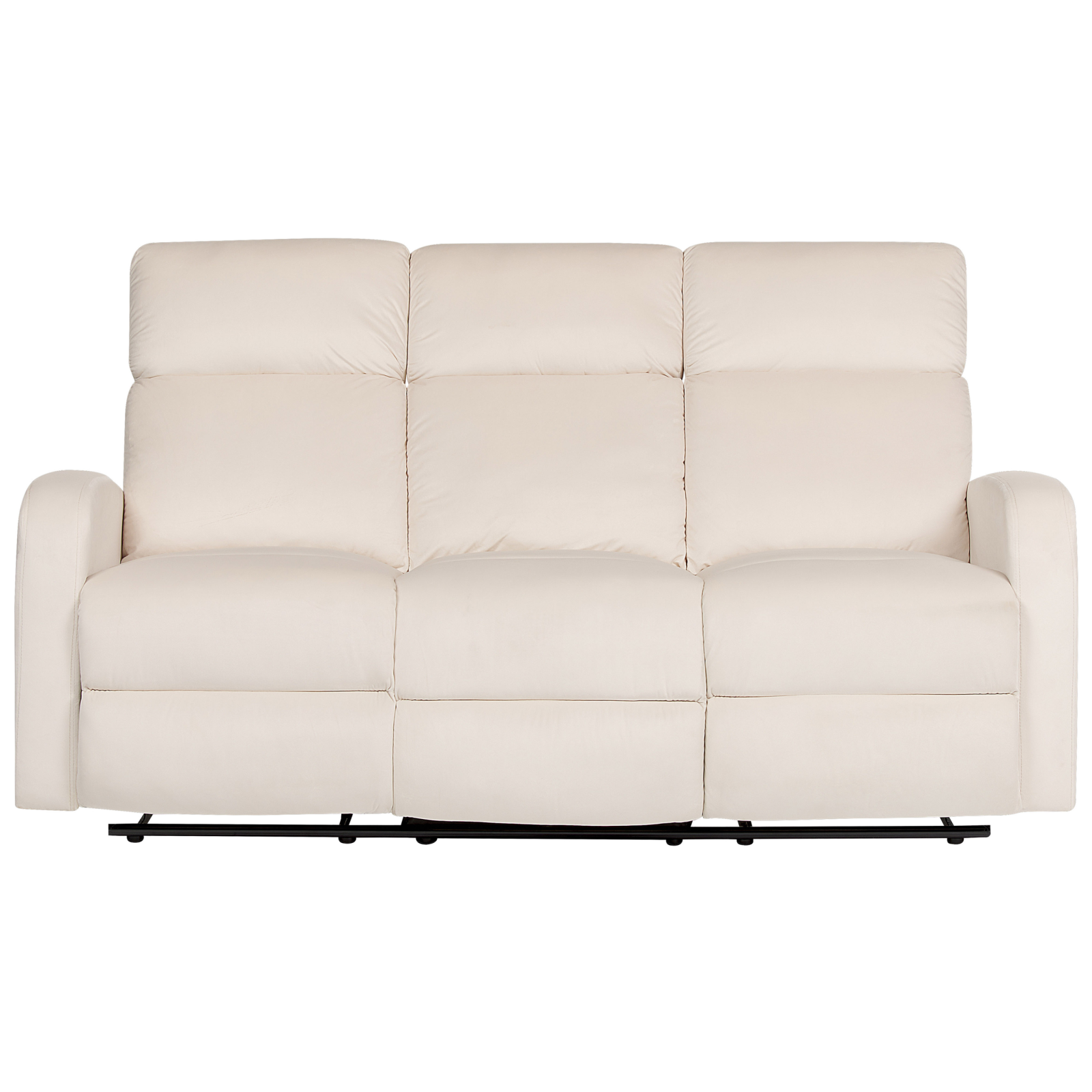 Canapea cu recliner manual. Nimic nu se compară cu relaxarea pe canapea, mai ales când o poți înclina cu ușurință. Aceasta are un spătar ajustabil manual și un suport pentru picioare, astfel încât poți trece rapid de la șezut la întins. Cadrul din fier durabil îi conferă rezistență și stabilitate, perfectă pentru momentele de relaxare. Detalii: Tip de Produs: Canapea cu 3 locuri. Stil: Modern. Culoare: Alb. Nuanță: Alb-murdar. Material: Țesătură. Material primar: Catifea. Material secundar: Fier. Căptușeală: Țesătură. Compoziția materialului: 100% Poliester. Tipul de reglare: Manual. Stilul cotierei: Liniar. Model: Culoare solidă. Structura scaunului: Arcuri cu buzunare. Densitatea pernei scaunului: 24 kg/m3. Locuri până la: 3 persoane. Dimensiuni: Înălțimea cotierei: 73 cm. Adâncime: 73 cm. Grosimea scaunului: 18 cm. Înălțimea scaunului: 39 cm. Lățime: 180 cm. Înălțime: 102 cm. Suprafața de ședere: 156x53 cm. Greutate: 63 kg. Capacitatea de greutate per persoană: 120 kg. Oferta incude: 1 x Canapea cu 3 locuri. Caracteristici cheie: Spătar și suport pentru picioare reglabile, Un loc excelent pentru relaxare, Scaun gros pentru confort maxim, Cotiere confortabile, Design modern, Tapițată complet. Asamblare: Necesită asamblare parțială.20-40 min. Informații suplimentare: Rețineți că țesătura de catifea poate avea un aspect puțin diferit atunci când este expusă la lumină; tinde să fie mai strălucitoare și mai luminoasă în lumina soarelui, în timp ce în lumină artificială are un ton diferit, mai închis. Datorită tipului de țesătură, tonul catifelei poate varia, de asemenea, atunci când este atinsă din direcții diferite. Pentru a uniformiza culoarea și a scăpa de lovituri și cute, materialul trebuie mângâiat cu palma deschisă într-o singură direcție, frecat cu o cârpă umedă sau călcat cu abur. Sfaturi de întreținere: Catifea: 1.Vă rugăm să curățați cu un șampon uscat și un burete umed sau cu un detergent ușor. 2.Aspirati folosind un accesoriu potrivit.