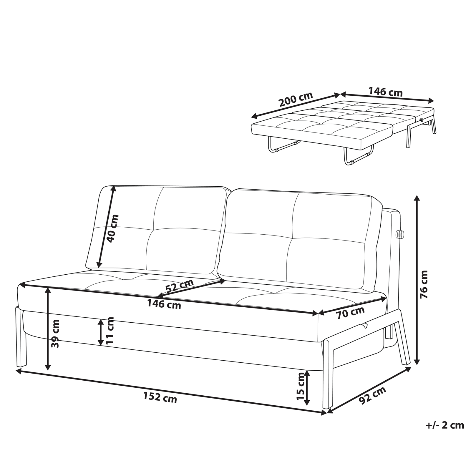 Canapea cu 2 locuri. Această canapea modernă combină stilul și funcționalitatea. Potrivită pentru dormitor sau living, se transformă rapid într-un pat pentru oaspeți și devine o canapea confortabilă când este pliată. Designul său compact și minimalist se potrivește diverselor stiluri de interior. Pernele groase și husele detașabile sunt ușor de curățat. Cadrul solid și picioarele metalice garantează confortul. Detalii: Tip de Produs: Canapea cu 2 locuri. Stil: Retro. Culoare: Negru. Material: Țesătură. Material primar: Țesătură. Material secundar: Metal. Căptușeală: Spumă. Compoziția materialului: 100% Poliester. Stilul cotierei: Fără cotiere. Protecții pentru picioare incluse: Da. Reclinabil: Nu. Huse detașabile de perne: Da. Structura scaunului: Arcuri ondulate. Densitatea pernei scaunului: 46 kg/m3. Locuri până la: 2 persoane. Funcție de dormit: Da. Funcție extensibilă: Pliabil. Depozitare: Nu. Dimensiuni: Adâncime: 92 cm. Grosimea scaunului: 13 cm. Înălțimea scaunului: 39 cm. Lățime: 152 cm. Înălțime: 76 cm. Suprafața de ședere: 146x52 cm. Suprafața de dormit: 146x200 cm. Greutate: 32 kg. Capacitatea de greutate per persoană: 150 kg. Oferta incude: 1 x Canapea. Caracteristici cheie: Posibilitate de a fi transformat într-un pat confortabil, Șezut lat, capitonat gros, Ideal atât pentru dormitor, cât și pentru camera de zi, Se integrează practic cu orice stil de amenajare, Huse detașabile, Ușor de asamblat. Asamblare: Necesită asamblare completă.45-60 min. Sfaturi de întreținere: Țesătură: 1.Vă rugăm să curățați cu un șampon uscat și un burete umed sau cu un detergent ușor. 2.Aspirati folosind un accesoriu potrivit. Metal: 1.Curățați cu un detergent delicat și o cârpă moale, apoi ștergeți bine. 2.Pentru a evita zgârieturile, nu folosiți produse de curățare abrazive. 3.Pentru elementele din cupru sau crom, folosiți un agent de lustruire.