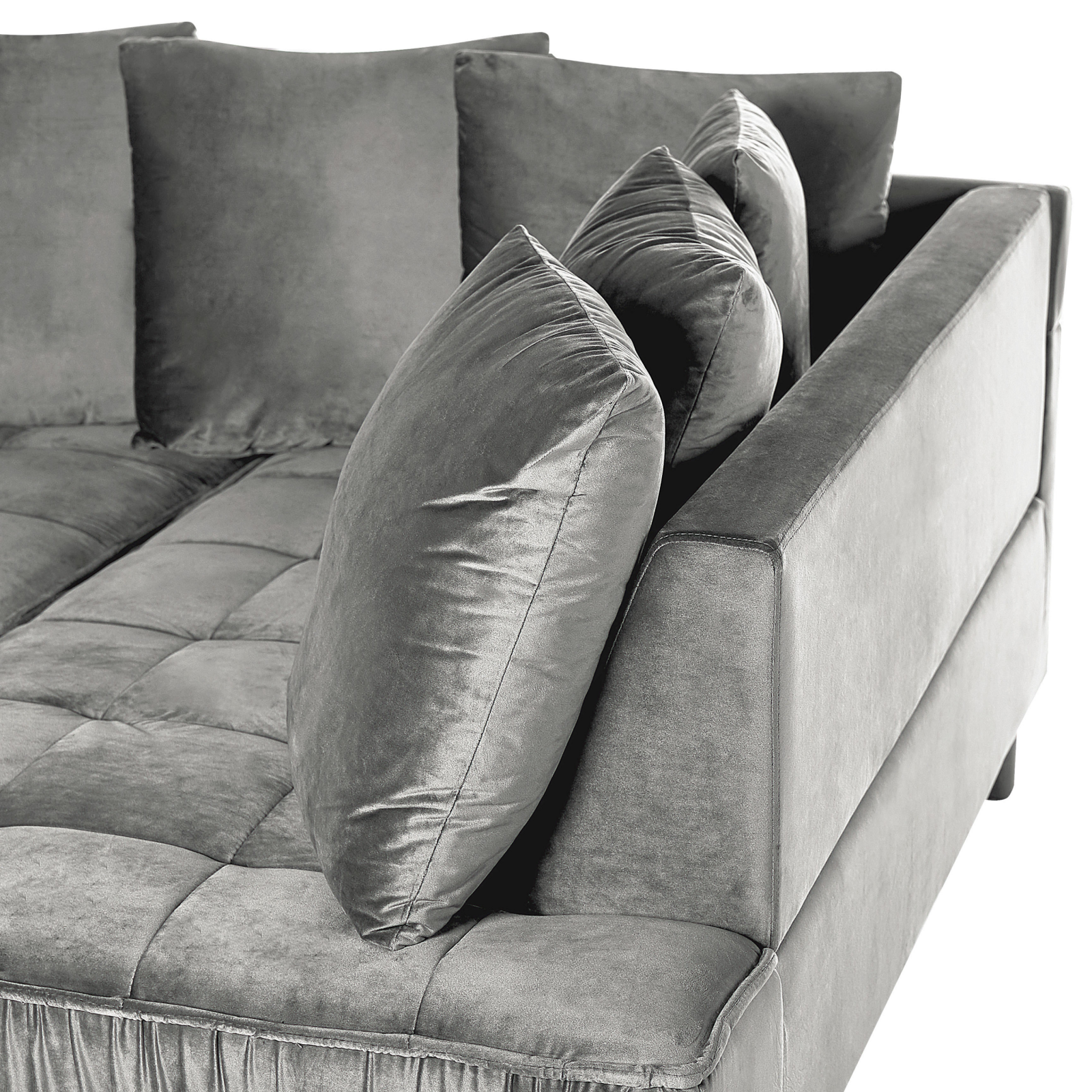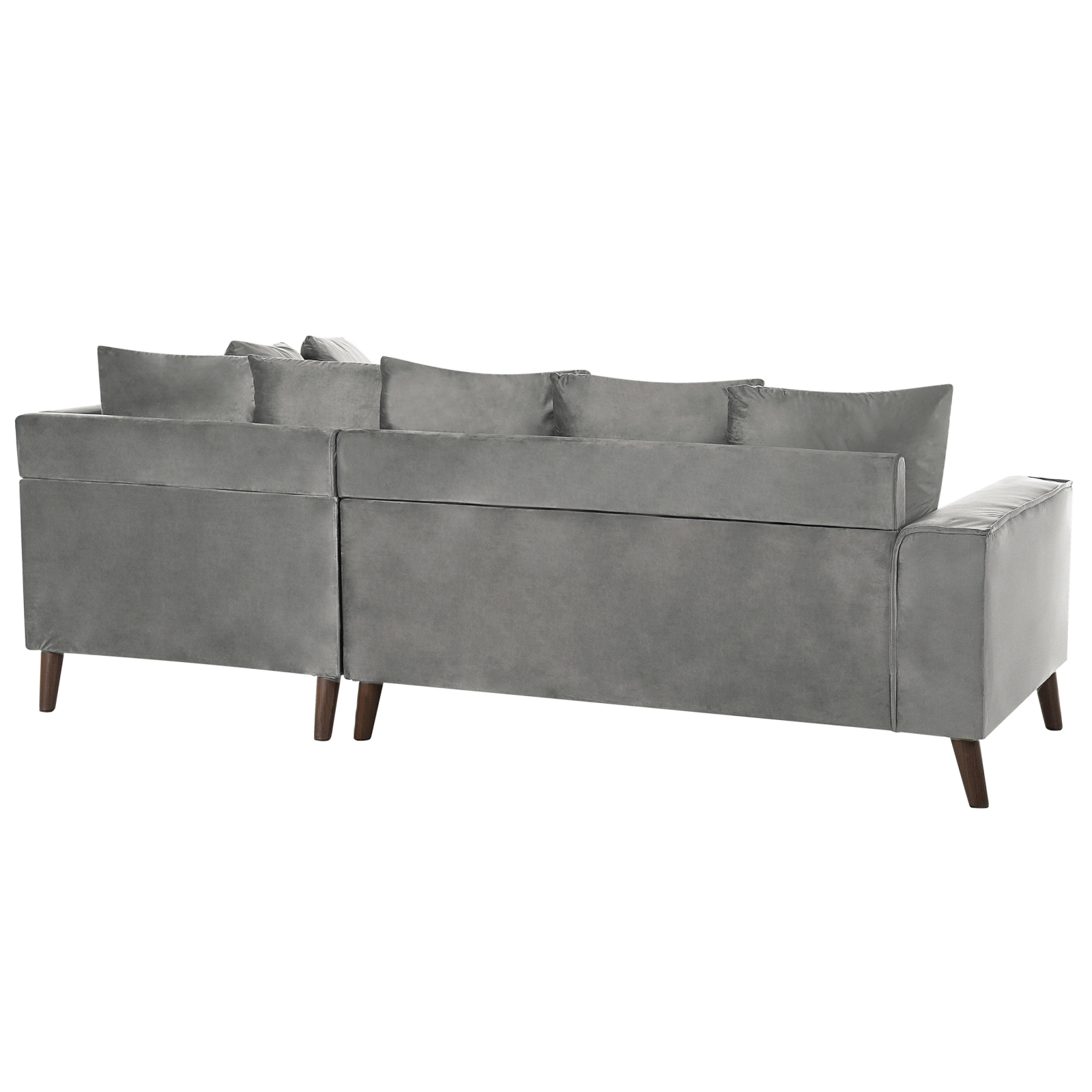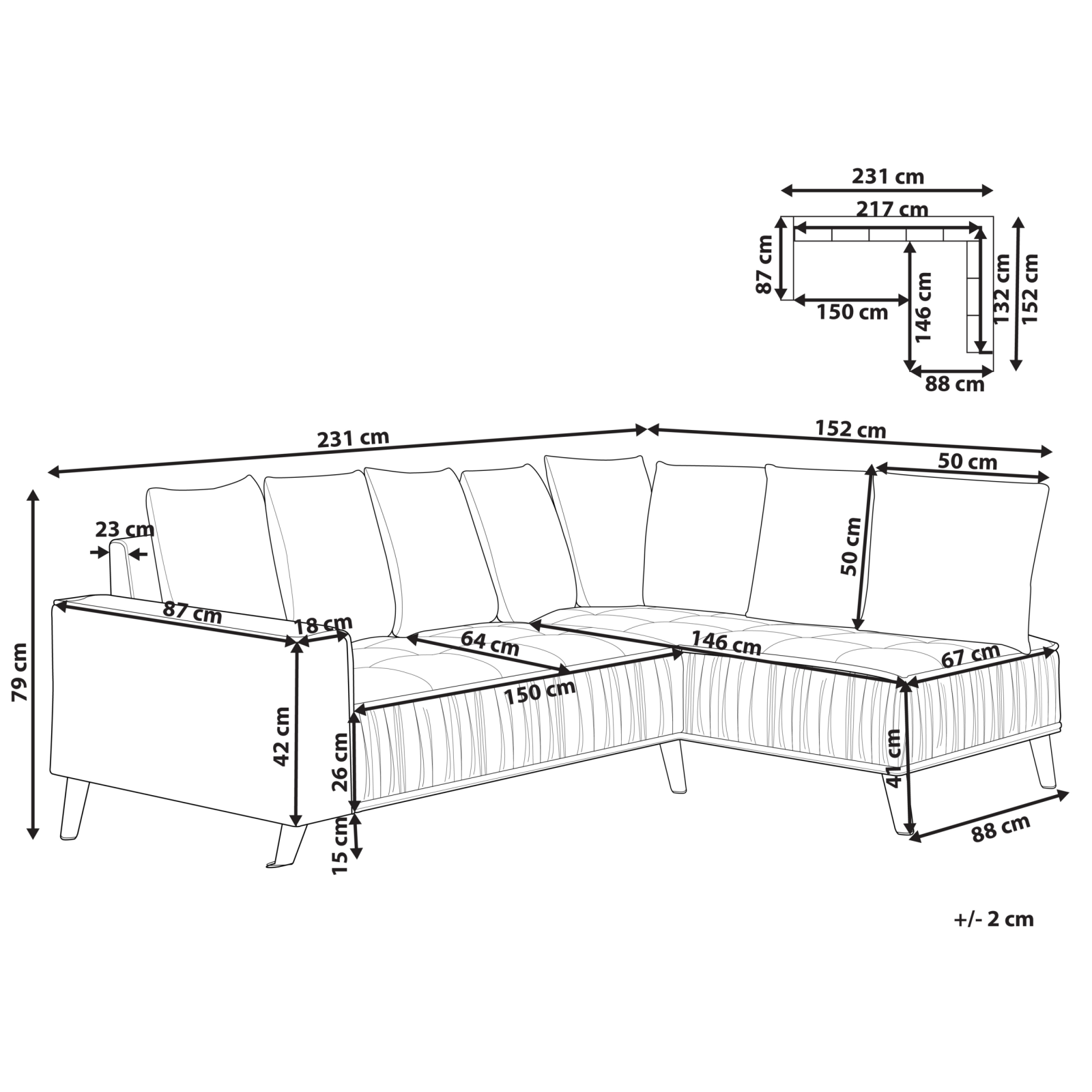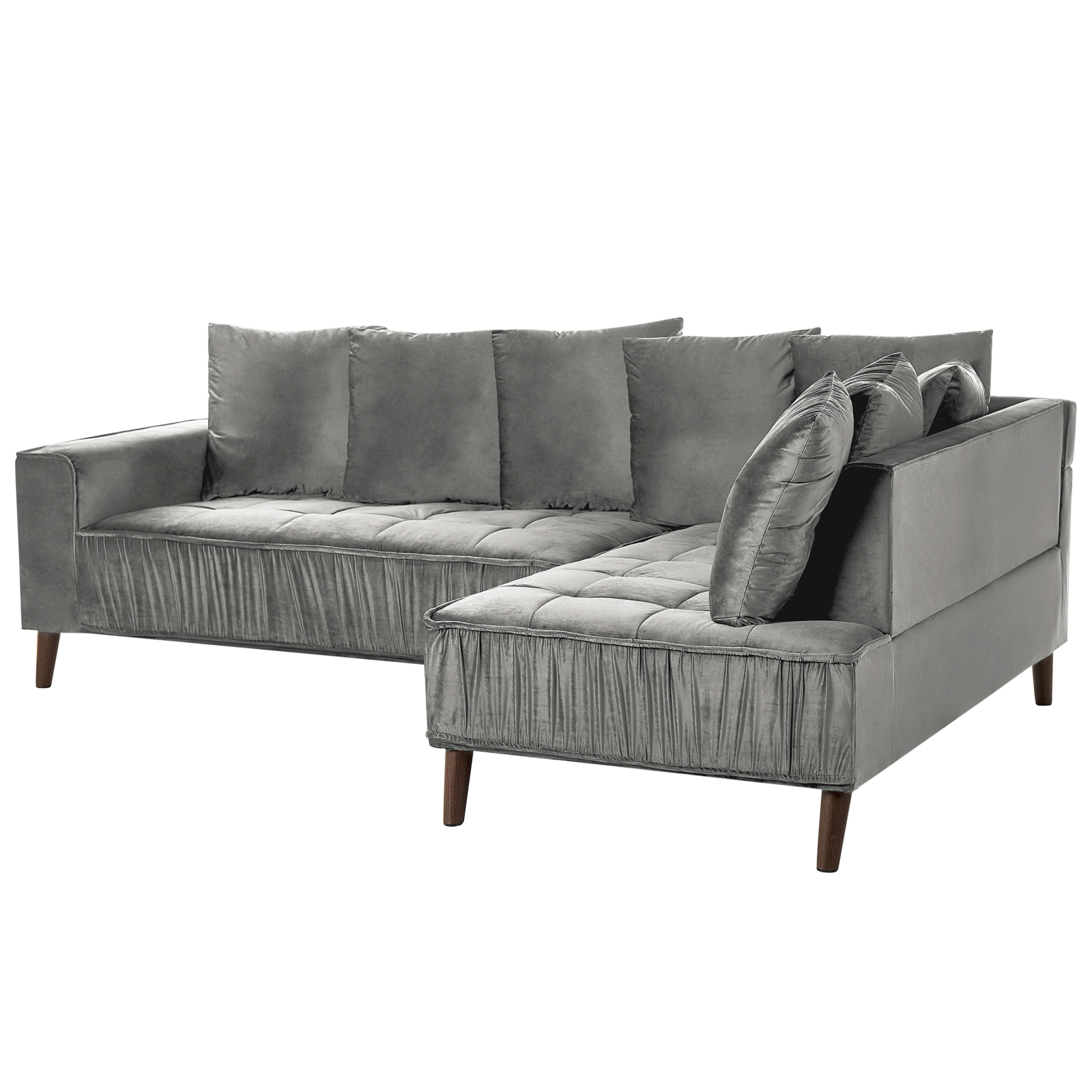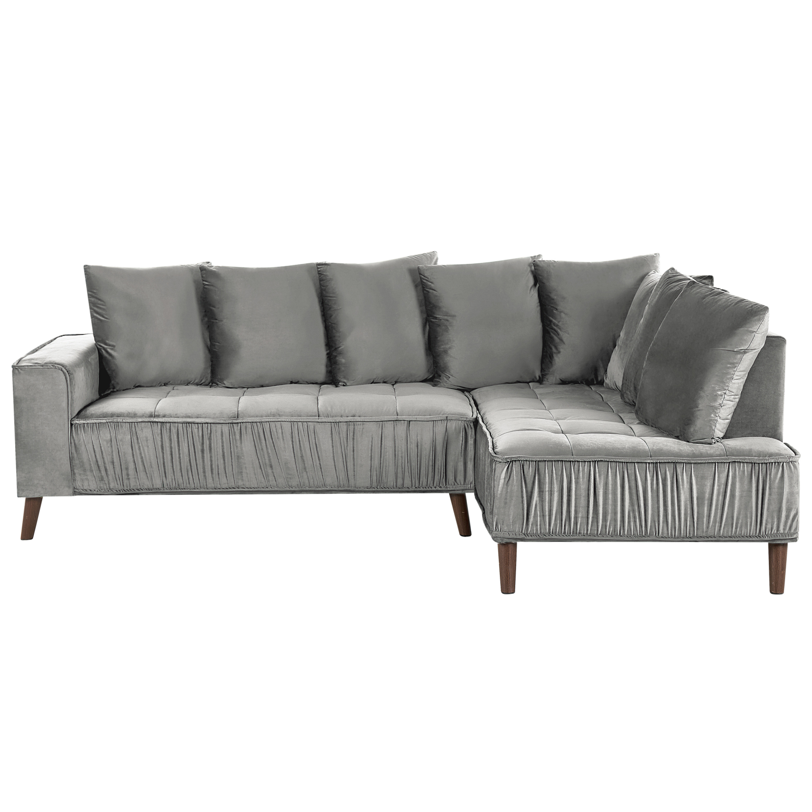Canapea de colț cu perne. Răsfață-te cu această canapea confortabilă și elegantă, acoperită cu catifea moale și durabilă care reflectă lumina. Pernele capitonate și fața drapată adaugă un aer glamorous, iar picioarele din metal cu finisaj lemnos aduc stabilitate. Pernele groase de pe spătar îți oferă confort, iar fermoarul încorporat le face ușor de curățat. Detalii: Tip de Produs: Canapea de colț. Stil: Modern. Culoare: Gri. Nuanță: Gri deschis. Material: Țesătură. Material primar: Catifea. Material secundar: Metal. Căptușeală: Spumă. Compoziția materialului: 100% Poliester. Formă: În formă de L. Stilul cotierei: Liniar. Orientare: Stânga. Model: Culoare solidă. Structura scaunului: Curea elastică. Densitatea pernei scaunului: 20 kg/m3. Locuri până la: 3 persoane. Dimensiuni: Înălțimea cotierei: 57 cm. Adâncime: 152 cm. Grosimea scaunului: 26 cm. Înălțimea scaunului: 41 cm. Lățime: 231 cm. Înălțime: 79 cm. Suprafața de ședere: 217x64 cm. Greutate: 61 kg. Capacitatea de greutate per persoană: 183 kg. Oferta incude: 8 x Pernă, 1 x Colțar. Caracteristici cheie: Cotiere confortabile, Scaun spațios și confortabil, Poziție de șezut relaxată, Design elegant, Amestec perfect de culori frumoase și materiale inovatoare, Tapițată complet. Asamblare: Necesită asamblare parțială.45-60 min. Informații suplimentare: Rețineți că țesătura de catifea poate avea un aspect puțin diferit atunci când este expusă la lumină; tinde să fie mai strălucitoare și mai luminoasă în lumina soarelui, în timp ce în lumină artificială are un ton diferit, mai închis. Datorită tipului de țesătură, tonul catifelei poate varia, de asemenea, atunci când este atinsă din direcții diferite. Pentru a uniformiza culoarea și a scăpa de lovituri și cute, materialul trebuie mângâiat cu palma deschisă într-o singură direcție, frecat cu o cârpă umedă sau călcat cu abur. Sfaturi de întreținere: Catifea: 1.Vă rugăm să curățați cu un șampon uscat și un burete umed sau cu un detergent ușor. 2.Aspirati folosind un accesoriu potrivit. Metal: 1.Curățați cu un detergent delicat și o cârpă moale, apoi ștergeți bine. 2.Pentru a evita zgârieturile, nu folosiți produse de curățare abrazive. 3.Pentru elementele din cupru sau crom, folosiți un agent de lustruire.