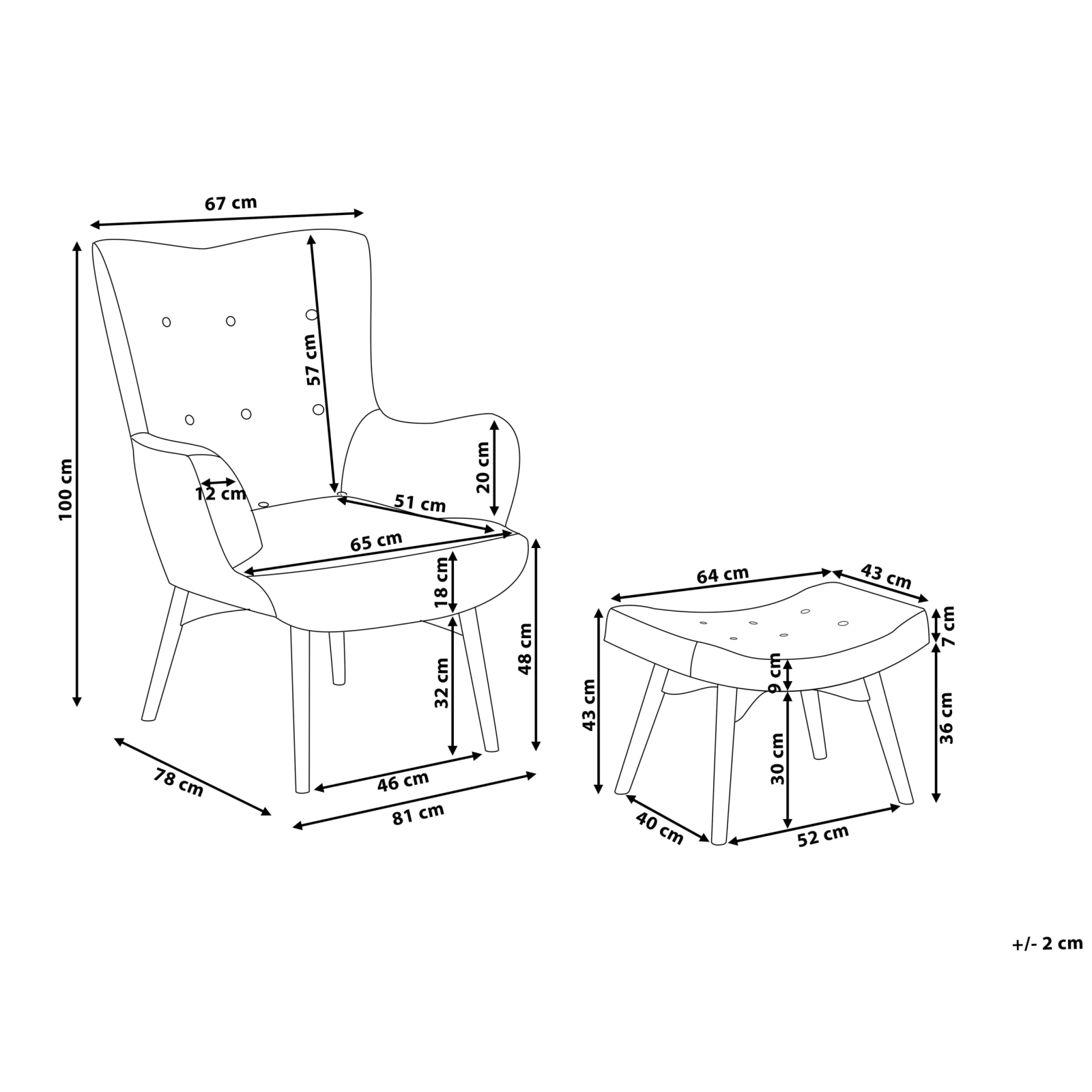 Fotoliu cu taburet de inspirație retro. Descoperă confortul desăvârșit cu acest set format din fotoliu și taburet, care aduce un plus de eleganță și căldură oricărui living. Materialul durabil, fin și plăcut la atingere, își păstrează frumusețea chiar și după mult timp de utilizare, iar șezutul generos, cu butoni decorativi, spătarul înalt și cotierele bine conturate te invită să te relaxezi complet după o zi lungă. Suportul pentru picioare transformă fiecare moment petrecut aici într-o adevărată clipă de răsfăț. Structura solidă din lemn adaugă stabilitate și un aer natural, completând armonios această piesă. Detalii: Tip de Produs: Fotoliu. Stil: Retro. Culoare: Bej. Nuanță: Bej deschis. Material: Țesătură. Material primar: Țesătură. Material secundar: Lemn de cauciuc. Căptușeală: Spumă. Detalii material picioare: Lemn. Material scaun: Țesătură. Compoziția materialului: 100% Poliester. Stilul cotierei: Integrat. Cotiere: Da. Suport pentru picioare inclus: Da. Protecții pentru picioare incluse: Nu. Model: Culoare solidă. Reclinabil: Nu. Structura scaunului: Lemn. Densitatea pernei scaunului: 32 kg/m3. Dimensiuni: Înălțimea cotierei: 61 cm. Adâncime: 78 cm. Otoman: 64x43x43 cm. Grosimea scaunului: 18 cm. Înălțimea scaunului: 43 cm. Lățime: 81 cm. Înălțime: 100 cm. Suprafața de ședere: 51x65 cm. Dimensiuni generale: 81x78x100. Greutate: 17 kg. Capacitatea de greutate: 150 kg. Oferta incude: 1 x Fotoliu, 1 x Scaun. Caracteristici cheie: Poziție de șezut relaxată, Confort maxim, Stil retro, Motiv decorativ remarcabil, Tapițerie din țesătură de înaltă calitate. Asamblare: Picioare neasamblate.5-15 min. Informații suplimentare: Pentru o stabilitate și siguranță maximă în utilizare, se recomandă să verificați la aproximativ 2 săptămâni după instalare dacă produsul a fost asamblat corect. De asemenea, se recomandă să verificați dacă șuruburile sunt strânse corect, o dată la 3 luni. Sfaturi de întreținere: Țesătură: 1.Vă rugăm să curățați cu un șampon uscat și un burete umed sau cu un detergent ușor. 2.Aspirati folosind un accesoriu potrivit. Lemn: 1.Curățați cu un detergent delicat și o cârpă moale, urmând direcția fibrelor. 2.Ștergeți imediat după curățare pentru a preveni acumularea apei pe produs. 3.Pentru a păstra mobila finisată cu ulei în stare bună, este necesar să o ungeți cu ulei după un timp.