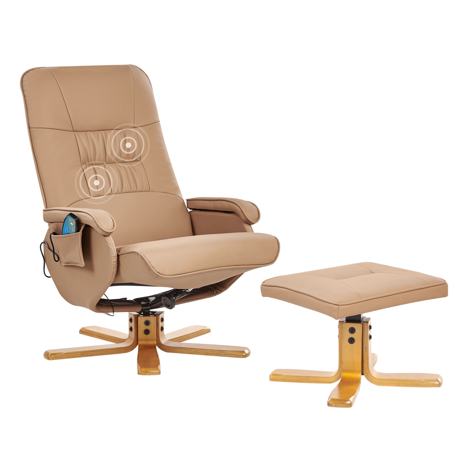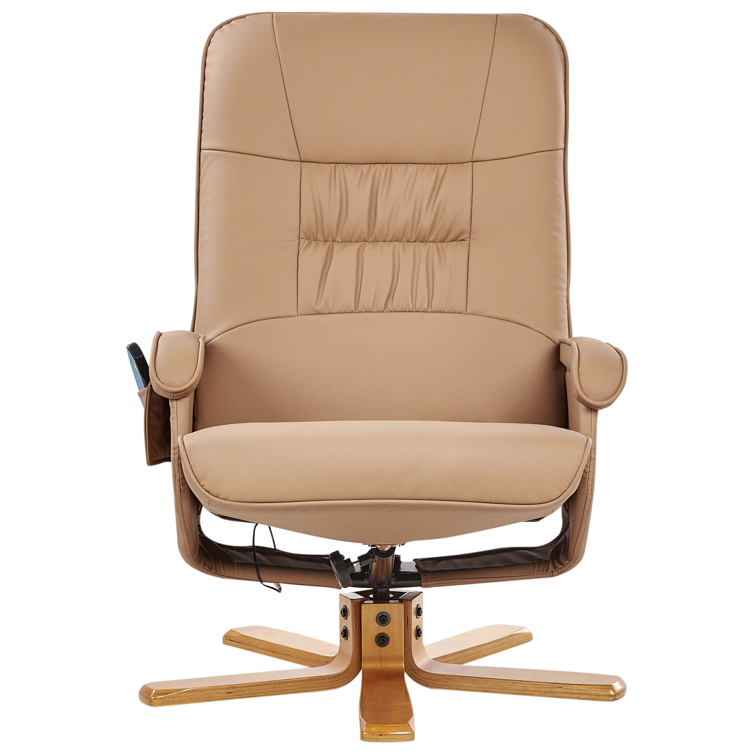 Fotoliu pentru masaj cu încălzire și suport pentru picioare. Bucură-te de confortul complet oferit de un spătar și cotiere ergonomice, acoperite cu piele ecologică moale. Această piesă nu doar că oferă un suport excelent, dar asigură și o postură corectă a corpului. Mecanismul de înclinare reduce presiunea asupra coloanei vertebrale, iar suportul pentru picioare și funcția de încălzire contribuie la o relaxare totală. Designul include o telecomandă atașată, care permite alegerea între 5 setări și 2 moduri de intensitate ale masajului. Cele 3 puncte de masaj sunt amplasate în zona lombară, pe coapse și pe partea superioară a spatelui. Baza rotativă la 360° este realizată din placaj durabil. Detalii: Tip de Produs: Scaun reclinabil. Stil: Retro. Culoare: Maro. Nuanță: Maro deschis. Material: Piele ecologică. Material primar: Piele ecologică. Material secundar: Lemn de cauciuc. Detalii material picioare: Lemn. Material scaun: Piele ecologică. Compoziția materialului: 100% Piele sintetică. Funcții suplimentare: Masaj. Cotiere: Da. Suport pentru picioare inclus: Da. Reclinabil: Da. Tensiune nominală: 220-240 V (50 Hz). Înclinare: Nu. Dimensiuni: Înălțimea cotierei: 51 cm. Adâncime: 50 cm. Otoman: 45x45x34 cm. Înălțimea scaunului: 40 cm. Lățime: 68 cm. Înălțime: 98 cm. Suprafața de ședere: 57x49 cm. Dimensiuni generale: 68x80x98. Greutate: 19 kg. Capacitatea de greutate: 130 kg. Oferta incude: 1 x Fotoliu, 1 x Scaun, 1 x Telecomandă. Caracteristici cheie: Funcție de încălzire pentru un confort maxim, Rotire de 360°, 5 programe de masaj, 2 intensități de masaj, Funcție de masaj în 3 puncte, Vine într-un set cu un taburet confortabil, Spătar și cotiere care susțin corpul. Asamblare: Necesită asamblare completă.45-60 min. Informații suplimentare: Pentru o stabilitate și siguranță maximă în utilizare, se recomandă să verificați la aproximativ 2 săptămâni după instalare dacă produsul a fost asamblat corect. De asemenea, se recomandă să verificați dacă șuruburile sunt strânse corect, o dată la 3 luni. Sfaturi de întreținere: Piele ecologică: 1.O dată pe săptămână, ștergeți cu o cârpă umedă și uscați după curățare. Nu folosiți substanțe uleioase. 2.Vă rugăm să curățați cu apă distilată și să folosiți detergenți pe bază de săpun pentru petele dificile. 3.Utilizați doar soluții de curățare delicate și balsamuri dedicate pielii ecologice. 4.Aspirati folosind un accesoriu potrivit. Lemn de cauciuc: 1.Curățați cu un detergent delicat și o cârpă moale, urmând direcția fibrelor. 2.Ștergeți imediat după curățare pentru a preveni acumularea apei pe produs. 3.Pentru a păstra mobila finisată cu ulei în stare bună, este necesar să o ungeți cu ulei după un timp.
