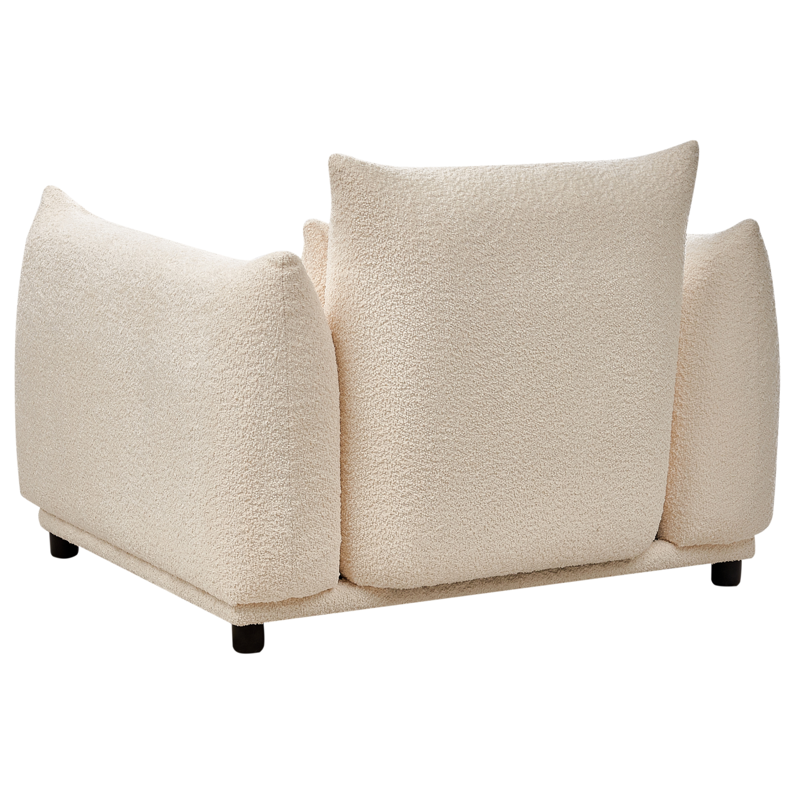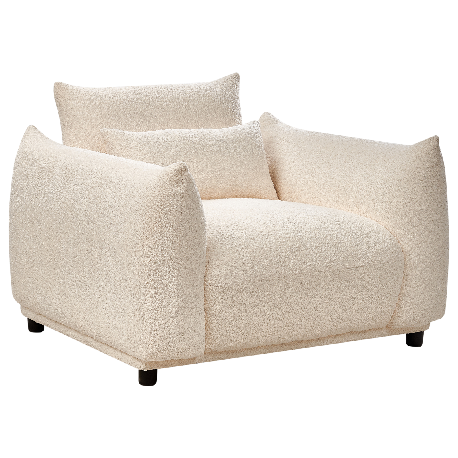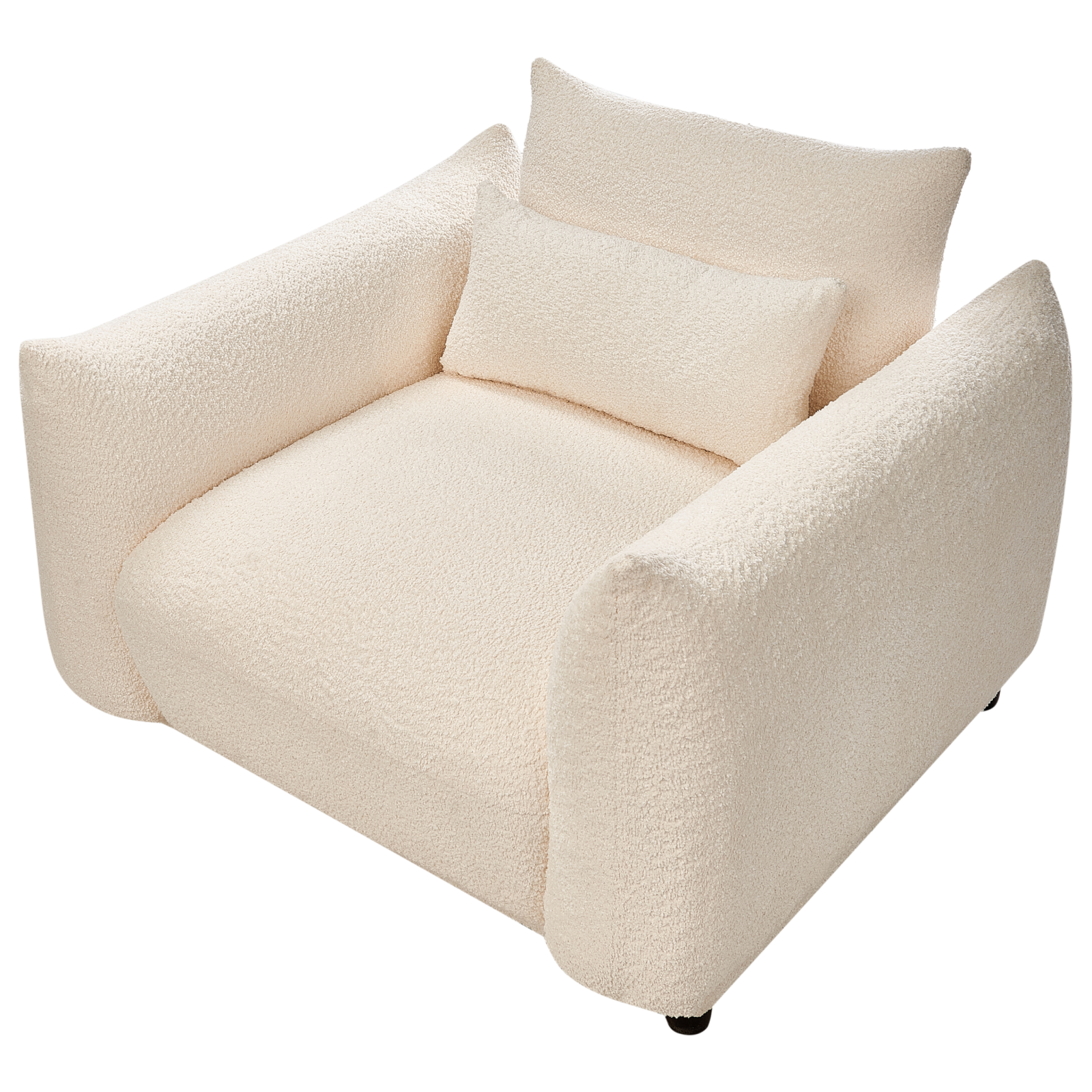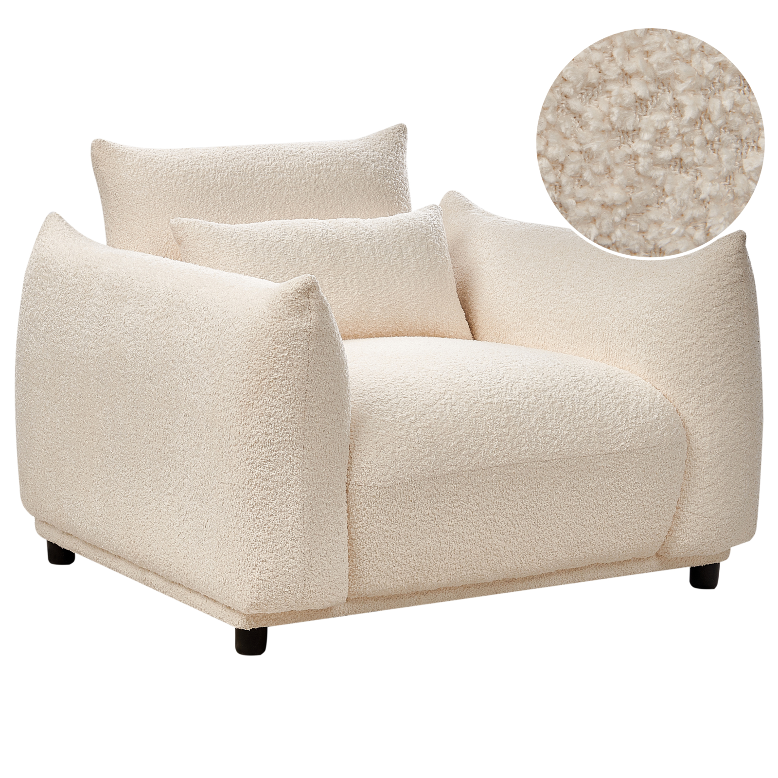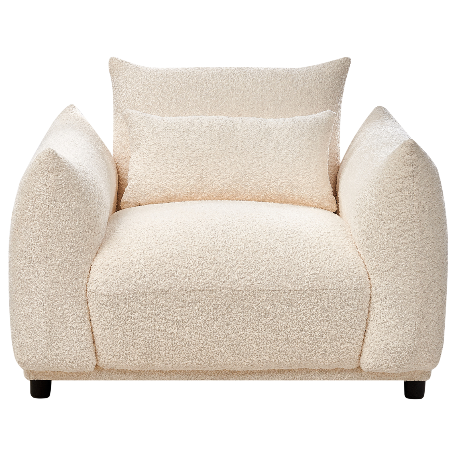 Fotoliu confortabil. Adaugă confort și eleganță în casa ta cu acest fotoliu tapițat cu material boucle. Designul său modern, cu șezutul jos și picioare scurte, se potrivește perfect în interioarele de inspirație clasică sau Japandi. Tapițeria moale, cu textura buclată, acoperă întreaga suprafață, iar brațele delicat umplute oferă un confort excelent. Ideal pentru a crea un colț de relaxare în living sau un loc primitor în dormitor, acest fotoliu adaugă o notă de rafinament oricărui spațiu. Detalii: Tip de Produs: Fotoliu. Stil: Retro. Culoare: Alb. Nuanță: Alb-murdar. Material: Țesătură. Material primar: Boucle. Material secundar: Material sintetic. Căptușeală: Spumă. Detalii material picioare: Material sintetic. Material scaun: Țesătură. Compoziția materialului: 100% Poliester. Stilul cotierei: Căptușit. Cotiere: Da. Protecții pentru picioare incluse: Nu. Model: Culoare solidă. Reclinabil: Nu. Structura scaunului: Lemn. Densitatea pernei scaunului: 28 kg/m3. Dimensiuni: Înălțimea cotierei: 56 cm. Adâncime: 86 cm. Înălțimea scaunului: 40 cm. Lățime: 96 cm. Înălțime: 72 cm. Suprafața de ședere: 56x62 cm. Greutate: 27 kg. Capacitatea de greutate: 180 kg. Oferta incude: 1 x Fotoliu, 1 x Pernă decorativă. Caracteristici cheie: Un loc excelent pentru relaxare, Adaugă o notă de eleganță oricărui interior, Adaugă o notă de stil în orice cameră, Ideal atât pentru dormitor, cât și pentru camera de zi, Construcție robustă. Asamblare: Necesită asamblare parțială.5-15 min. Informații suplimentare: Pentru o stabilitate și siguranță maximă în utilizare, se recomandă să verificați la aproximativ 2 săptămâni după instalare dacă produsul a fost asamblat corect. De asemenea, se recomandă să verificați dacă șuruburile sunt strânse corect, o dată la 3 luni. Sfaturi de întreținere: Boucle: 1.Aspirati folosind un accesoriu potrivit. 2.Vă rugăm să curățați cu un șampon uscat și un burete umed sau cu un detergent ușor. Material sintetic: 1.Curățați cu un detergent delicat și o cârpă moale, apoi ștergeți bine.