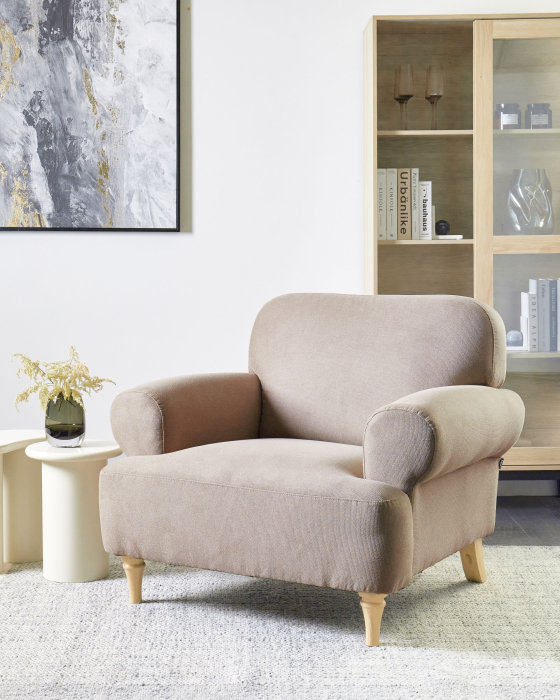 Fotoliu tapițat cu picioare din lemn. O combinație atemporală de farmec clasic și confort modern, acest fotoliu oferă un loc primitor cu o pernă adâncă și un spătar ușor curbat, ideal pentru momente de relaxare. Cotierele elegante adaugă o notă de sofisticare tradițională, iar picioarele din lemn rezistente asigură stabilitate și stil. Tapițat cu o țesătură durabilă și de înaltă calitate, este creat pentru a oferi o experiență zilnică plăcută fără a sacrifica eleganța, fiind ideal pentru orice living. Detalii: Tip de Produs: Fotoliu. Stil: Minimalist. Culoare: Bej. Nuanță: Taupe. Material: Țesătură. Material primar: Țesătură. Material secundar: Lemn de cauciuc. Căptușeală: Spumă. Detalii material picioare: Lemn. Material scaun: Țesătură. Compoziția materialului: 100% Poliester. Stilul cotierei: Rotunjit. Cotiere: Da. Protecții pentru picioare incluse: Nu. Model: Culoare solidă. Reclinabil: Nu. Structura scaunului: Arcuri cu buzunare. Densitatea pernei scaunului: 28 kg/m3. Dimensiuni: Înălțimea cotierei: 61 cm. Adâncime: 98 cm. Grosimea scaunului: 28 cm. Înălțimea scaunului: 43 cm. Lățime: 103 cm. Înălțime: 83 cm. Suprafața de ședere: 94x61 cm. Greutate: 33 kg. Capacitatea de greutate: 150 kg. Oferta incude: 1 x Fotoliu. Caracteristici cheie: Scaun spațios și confortabil, Scaun jos și adânc, Picioare robuste pentru o stabilitate optimă, Design tradițional cu o notă modernă, Tapițerie din țesătură de înaltă calitate, Finisajul rezistent la apă permite ca orice vărsare să rămână pe suprafață. Asamblare: Necesită asamblare parțială.5-15 min. Informații suplimentare: Pentru o stabilitate și siguranță maximă în utilizare, se recomandă să verificați la aproximativ 2 săptămâni după instalare dacă produsul a fost asamblat corect. De asemenea, se recomandă să verificați dacă șuruburile sunt strânse corect, o dată la 3 luni. Sfaturi de întreținere: Țesătură: 1.Aspirati folosind un accesoriu potrivit. 2.Vă rugăm să curățați cu un șampon uscat și un burete umed sau cu un detergent ușor. Lemn de cauciuc: 1.Ștergeți imediat după curățare pentru a preveni acumularea apei pe produs. 2.Curățați cu un detergent delicat și o cârpă moale, urmând direcția fibrelor. 3.Pentru a păstra mobila finisată cu ulei în stare bună, este necesar să o ungeți cu ulei după un timp.