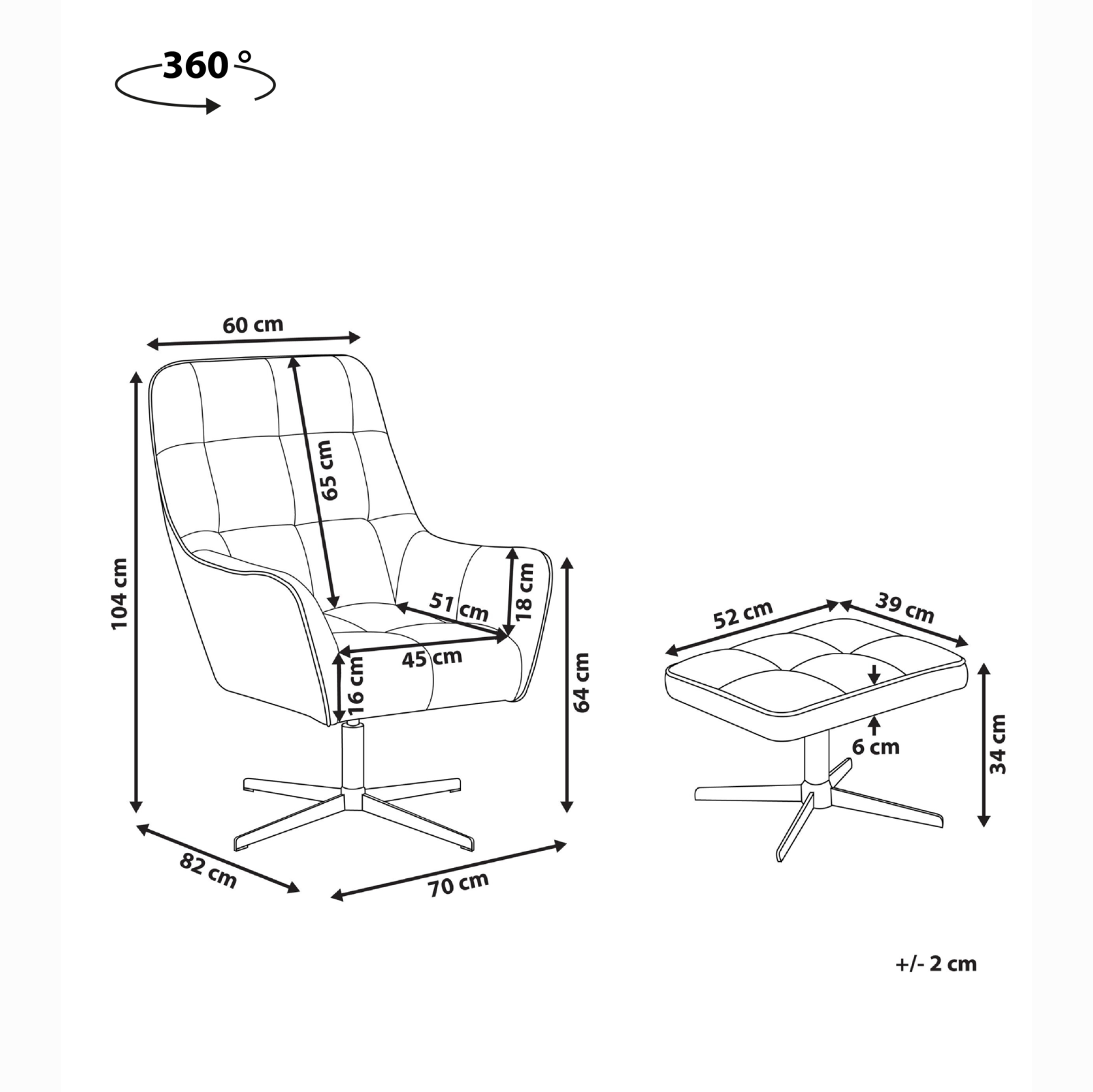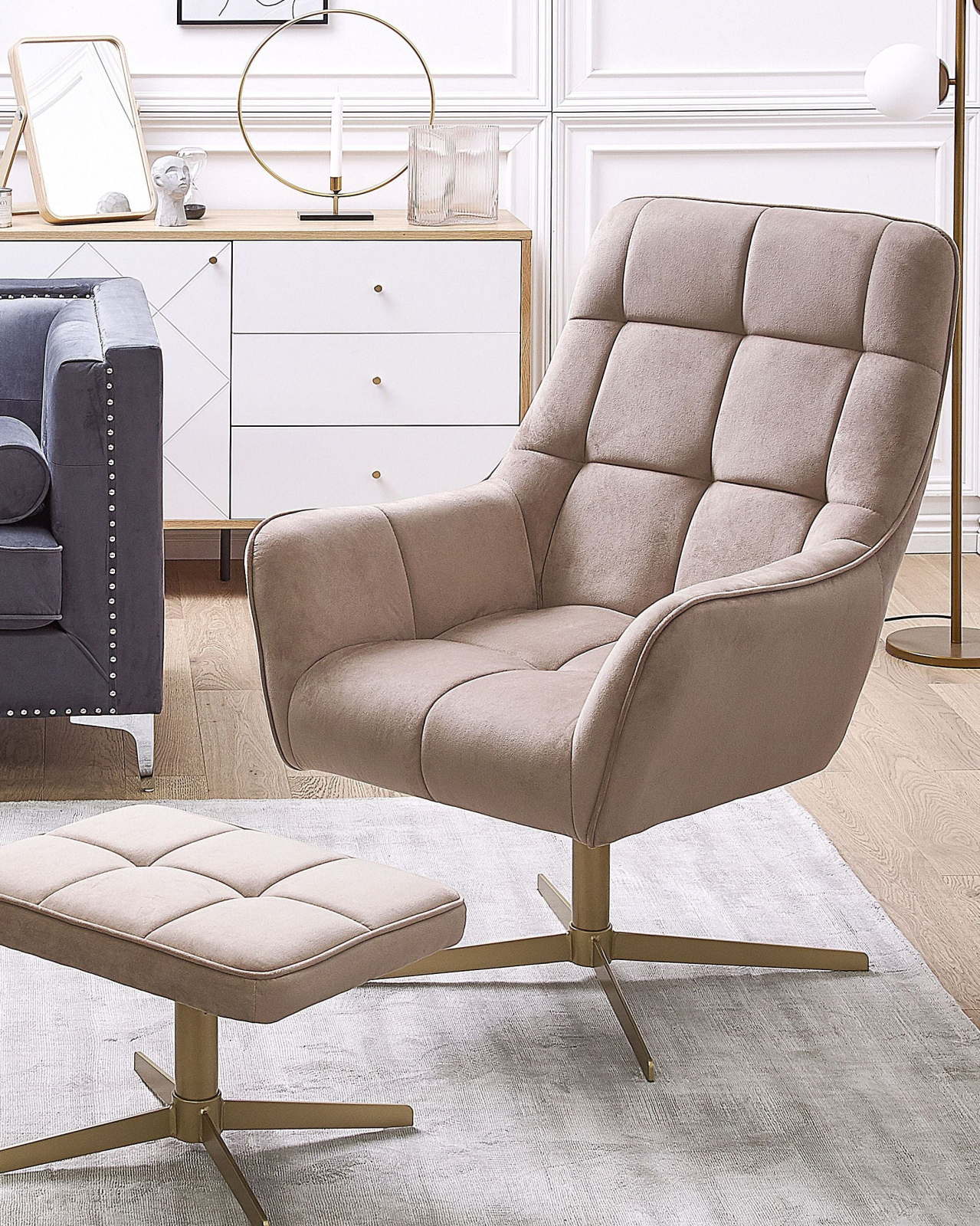 Fotoliu cu suport pentru picioare. Răsfăț și stil într-un singur set format din fotoliu și taburet, care creează un colț perfect pentru relaxare. Tapițeria din catifea bej, moale și rafinată, aduce un plus de confort vizual și tactil, integrându-se cu ușurință atât în decoruri moderne, cât și în cele clasice. Picioarele metalice aurii oferă stabilitate și un accent retro-chic. Taburetul completează armonios piesa principală, fiind ideal ca măsuță auxiliară sau scăunel pentru picioare. Detalii: Tip de Produs: Fotoliu. Stil: Retro. Culoare: Bej. Nuanță: Taupe. Material: Țesătură. Material primar: Catifea. Material secundar: Metal. Căptușeală: Spumă. Detalii material picioare: Metal. Compoziția materialului: 100% Poliester. Stilul cotierei: Curbat. Cotiere: Da. Suport pentru picioare inclus: Nu. Protecții pentru picioare incluse: Da. Model: Culoare solidă. Reclinabil: Nu. Structura scaunului: Placaj. Densitatea pernei scaunului: 24 kg/m3. Dimensiuni: Înălțimea cotierei: 64 cm. Adâncime: 82 cm. Otoman: 52x39x34 cm. Grosimea scaunului: 16 cm. Înălțimea scaunului: 46 cm. Lățime: 60 cm. Înălțime: 104 cm. Suprafața de ședere: 51x45 cm. Dimensiuni generale: 60x82x104. Greutate: 20 kg. Capacitatea de greutate: 200 kg. Oferta incude: 1 x Scaun, 1 x Fotoliu. Caracteristici cheie: Scaun gros pentru confort maxim, Suport pentru picioare practic, Design mereu actualizat, Excepțional de ușor de întreținut, Tapițată complet, Bază stabilă și durabilă. Asamblare: Picioare neasamblate.20-40 min. Informații suplimentare: Pentru o stabilitate și siguranță maximă în utilizare, se recomandă să verificați la aproximativ 2 săptămâni după instalare dacă produsul a fost asamblat corect. De asemenea, se recomandă să verificați dacă șuruburile sunt strânse corect, o dată la 3 luni. Rețineți că țesătura de catifea poate avea un aspect puțin diferit atunci când este expusă la lumină; tinde să fie mai strălucitoare și mai luminoasă în lumina soarelui, în timp ce în lumină artificială are un ton diferit, mai închis. Datorită tipului de țesătură, tonul catifelei poate varia, de asemenea, atunci când este atinsă din direcții diferite. Pentru a uniformiza culoarea și a scăpa de lovituri și cute, materialul trebuie mângâiat cu palma deschisă într-o singură direcție, frecat cu o cârpă umedă sau călcat cu abur. Sfaturi de întreținere: Catifea: 1.Vă rugăm să curățați cu un șampon uscat și un burete umed sau cu un detergent ușor. 2.Aspirati folosind un accesoriu potrivit. Metal: 1.Curățați cu un detergent delicat și o cârpă moale, apoi ștergeți bine. 2.Pentru a evita zgârieturile, nu folosiți produse de curățare abrazive. 3.Pentru elementele din cupru sau crom, folosiți un agent de lustruire.