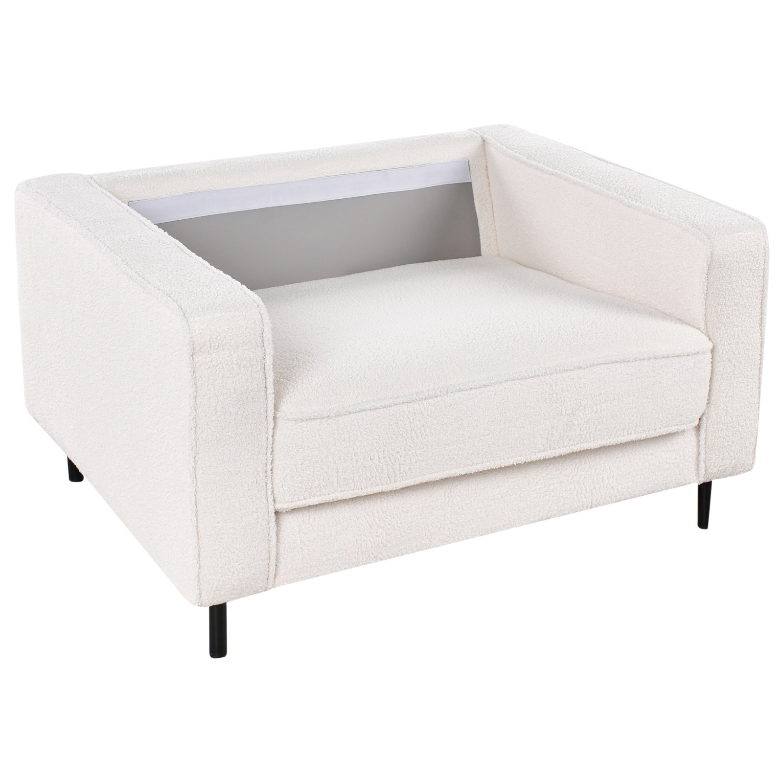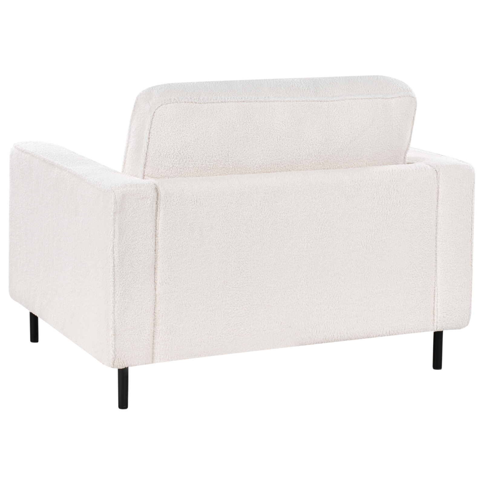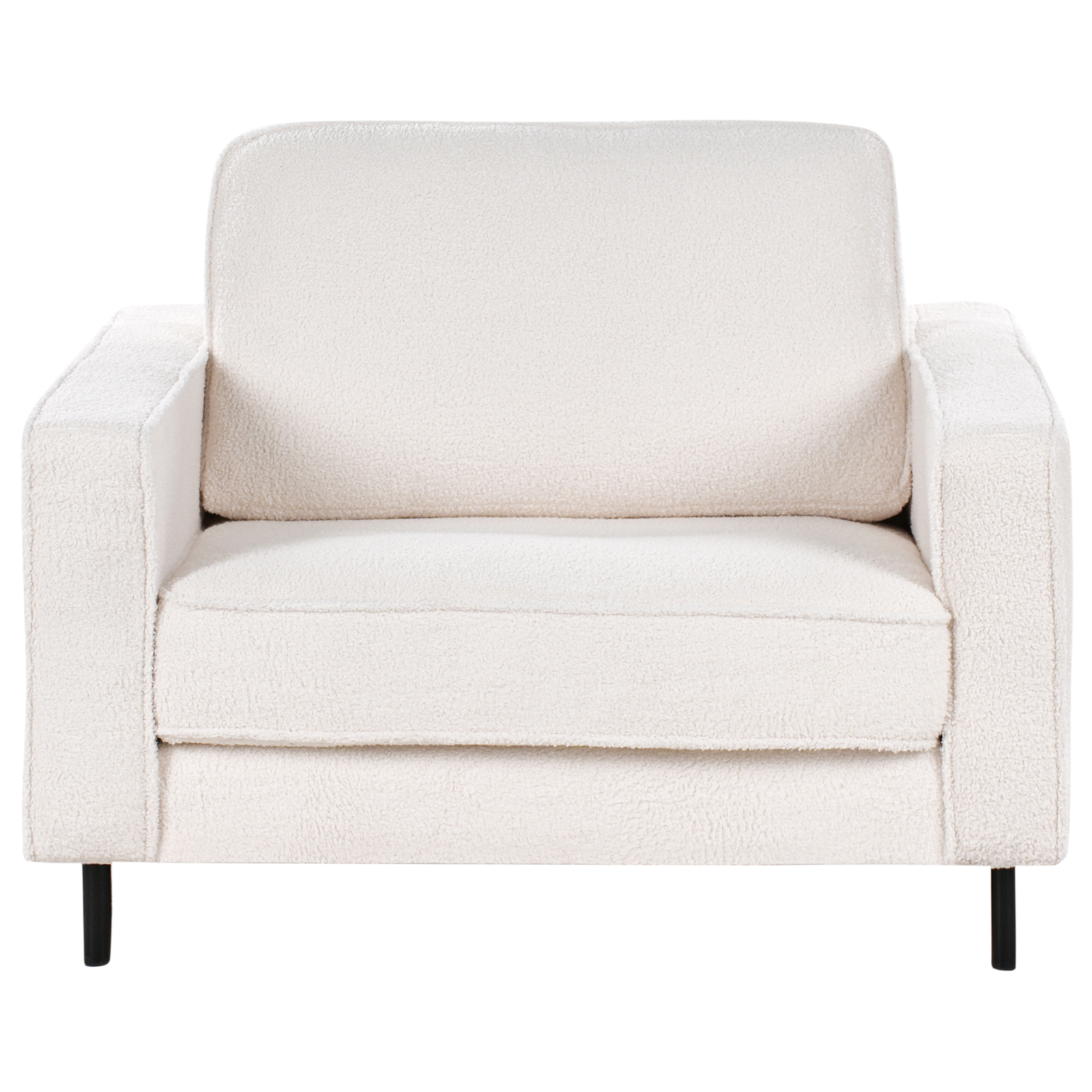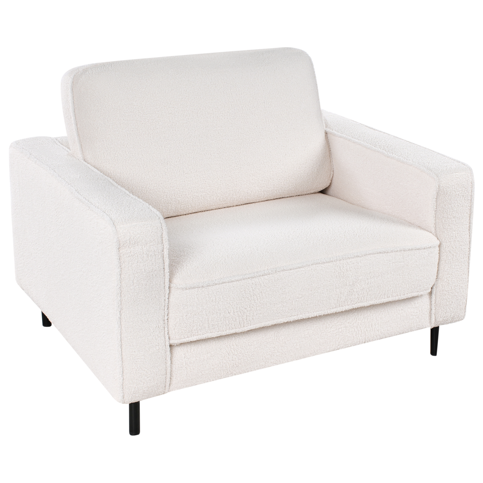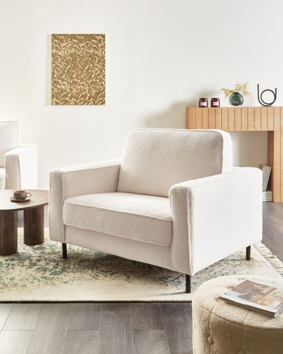 Fotoliu minimalist. Acest fotoliu este piesa perfectă pentru orice living, adăugând un plus de stil prin designul său atemporal. Cu o formă elegantă, linii bine definite și picioare metalice, este tapițat în boucle moale, oferind un aspect minimalist și sofisticat. Materialul plăcut la atingere și pernele de șezut generoase asigură confort maxim. Ideal pentru a aduce o notă de rafinament atât într-un decor clasic, cât și într-unul modern. Detalii: Tip de Produs: Fotoliu. Stil: Tradițional. Culoare: Alb. Material: Țesătură. Material primar: Boucle. Material secundar: Lemn de eucalipt. Căptușeală: Spumă. Detalii material picioare: Metal. Material scaun: Țesătură. Compoziția materialului: 100% Poliester. Stilul cotierei: Liniar. Cotiere: Da. Protecții pentru picioare incluse: Nu. Model: Culoare solidă. Reclinabil: Nu. Structura scaunului: Arcuri ondulate. Densitatea pernei scaunului: 24 kg/m3. Dimensiuni: Înălțimea cotierei: 63 cm. Adâncime: 91 cm. Înălțimea scaunului: 41 cm. Lățime: 117 cm. Înălțime: 87 cm. Suprafața de ședere: 90x56 cm. Greutate: 28 kg. Capacitatea de greutate: 100 kg. Oferta incude: 1 x Fotoliu. Caracteristici cheie: Atașare rapidă și ușoară a pernelor cu sistem de prindere Velcro, Scaun gros pentru confort maxim, Design mereu actualizat, Structură proiectată pentru a oferi stabilitate maximă, Tapițată complet. Asamblare: Picioare neasamblate.5-15 min. Informații suplimentare: Pentru o stabilitate și siguranță maximă în utilizare, se recomandă să verificați la aproximativ 2 săptămâni după instalare dacă produsul a fost asamblat corect. De asemenea, se recomandă să verificați dacă șuruburile sunt strânse corect, o dată la 3 luni. Sfaturi de întreținere: Boucle: 1.Aspirati folosind un accesoriu potrivit. 2.Vă rugăm să curățați cu un șampon uscat și un burete umed sau cu un detergent ușor. Fier: 1.Pentru elementele din cupru sau crom, folosiți un agent de lustruire. 2.Pentru a evita zgârieturile, nu folosiți produse de curățare abrazive. 3.Curățați cu un detergent delicat și o cârpă moale, apoi ștergeți bine.