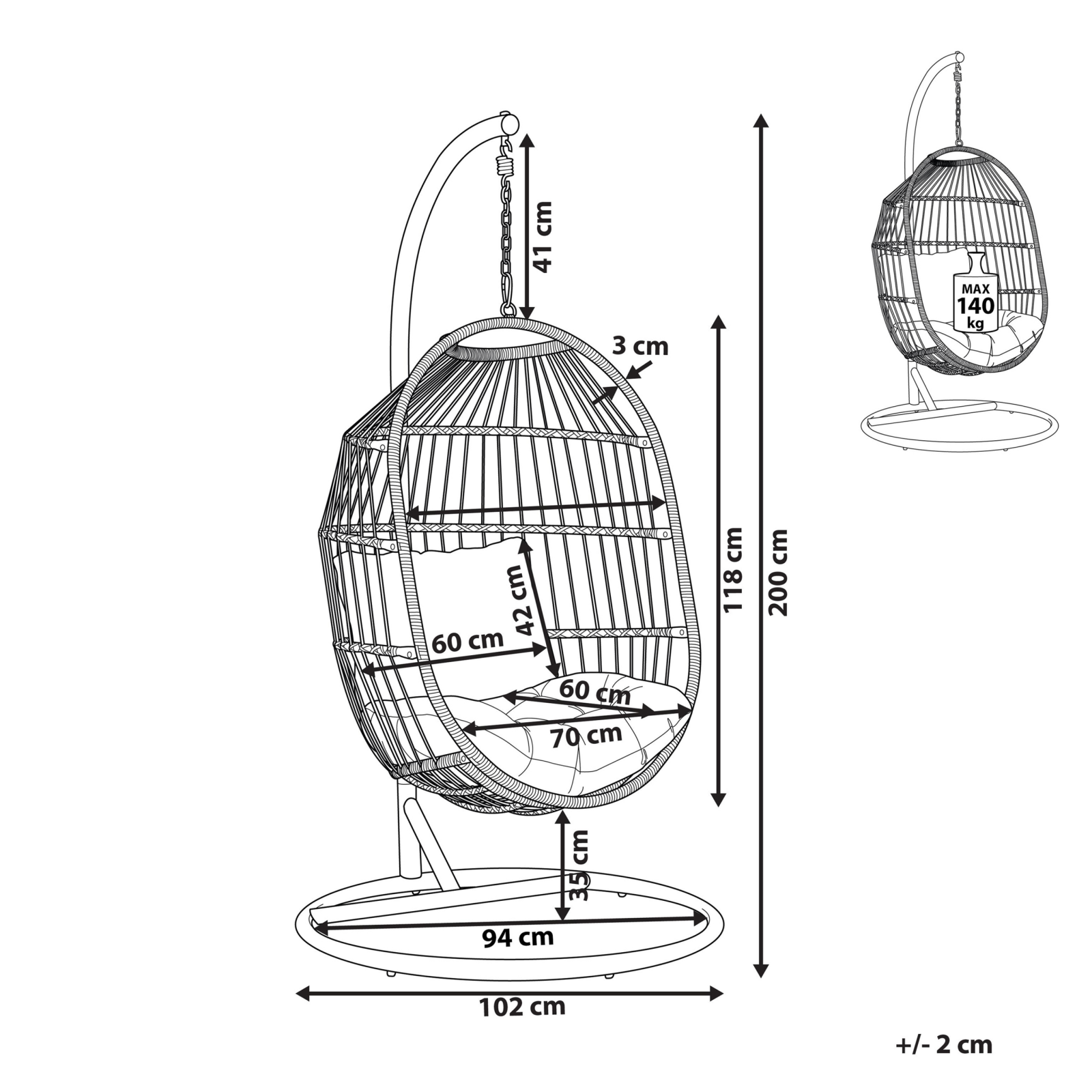 Fotoliu suspendat cu design boho. Adaugă un plus de stil și confort în casa ta cu acest fotoliu suspendat în tendințe, perfect pentru living sau terasă. Mai mult decât un simplu obiect de decor, acesta devine un refugiu de relaxare, un loc în care te poți destinde și scăpa de stresul zilnic. Mișcarea ușoară de leagăn, generată de suspensia cu lanț, îți va oferi momente de liniște și serenitate, învăluindu-te într-o atmosferă plăcută. Realizat din ratan sintetic rezistent, își va păstra aspectul elegant pe termen lung. Te invită să te oprești din ritmul agitat al zilei și să te bucuri de momente de răsfăț. Detalii: Tip de Produs: Fotoloiu suspendat. Stil: Boho. Culoare: Maro. Material: Ratan sintetic. Material primar: Ratan sintetic. Material secundar: Țesătură. Detalii material picioare: Metal. Material scaun: Țesătură. Compoziția materialului: 100% Poliester. Finisaj: Acoperire pulverizată. Densitatea pernei scaunului: 25 kg/m3. Dimensiuni: Bază: 102x102. Adâncime: 102 cm. Grosimea scaunului: 15 cm. Înălțimea scaunului: 35 cm. Lățime: 102 cm. Înălțime: 200 cm. Suprafața de ședere: 70x60 cm. Greutate: 34 kg. Capacitatea de greutate: 140 kg. Oferta incude: 1 x Scaun, 1 x Pernă pentru șezut, 1 x Pernă, 1 x Suport. Caracteristici cheie: Formă curbată pentru a maximiza confortul, Se integrează practic cu orice stil de amenajare, Structură proiectată pentru a oferi stabilitate maximă, Atât în interior cât și în exterior, Rezistența la UV 5 (ISO 105-B02). Asamblare: Necesită asamblare parțială.20-40 min. Informații suplimentare: Vă rugăm să rețineți că produsul este sensibil la condițiile meteorologice și trebuie păstrat în interior sau într-un loc acoperit și moderat, atunci când nu este folosit. Pentru o stabilitate și siguranță maximă în utilizare, se recomandă să verificați la aproximativ 2 săptămâni după instalare dacă produsul a fost asamblat corect. De asemenea, se recomandă să verificați dacă șuruburile sunt strânse corect, o dată la 3 luni. Descriere: Mobilierul rezistent la razele UV oferă o protecție sporită împotriva decolorării sau schimbării culorii. Totuși, recomandăm depozitarea produsului într-un loc acoperit atunci când nu este folosit. Astfel, veți asigura o durată de viață maximă a mobilierului. Rezistență: UV. Sfaturi de întreținere: Ratan sintetic: 1.Curățați cu soluții de curățare pe bază de săpun. Evitați produsele de curățare caustice sau chimice. 2.Pentru a prelungi durata de viață a mobilierului, protejați-l de expunerea directă la soare. 3.Ustensilele sau accesoriile din sticlă pot provoca supraîncălzirea suprafeței. 4.Se recomandă să folosiți o husă de protecție pentru sezonul de iarnă sau, dacă este posibil, să păstrați mobilierul uscat și răcoros în interior. Oțel: 1.Curățarea regulată și depozitarea lor în interior crește durata de viață a mobilierului de grădină. 2.Curățați cu soluții de curățare delicate disponibile în comerț. 3.Pentru a asigura protecția împotriva coroziunii, evitați agenții de curățare pe bază de substanțe alcaline sau acide. Uscați bine după curățare. 4.Când nu este utilizat, mobilierul trebuie depozitat în interior sau acoperit cu o husă de protecție. 5.Îndepărtați periodic capacele de protecție pentru a permite evacuarea lichidului, lăsați să se usuce și folosiți spray anti-coroziune dacă este necesar. 6.Orice deteriorare a stratului de vopsea exterioară trebuie protejată de umiditate. 7.Vă rugăm să rețineți că acest produs nu trebuie să intre în contact cu apa, deoarece acest lucru ar putea duce la scurgerea de apă ruginită din centrul țevilor cadru. 8.Se recomandă ca, de două ori pe an, mobilierul să fie protejat cu un etanșant sau cu un tratament antirugină, pentru a-i prelungi durata de viață. Țesătură: 1.Spălați numai manual, folosind apă rece și un detergent delicat. Spălați pe fața materialului, cu fermoarul închis. 2.Nu se usucă la mașina de uscat și nu se calcă. 3.Când nu este utilizat, păstrați-l într-un loc curat și uscat pentru a-l proteja de condițiile atmosferice.