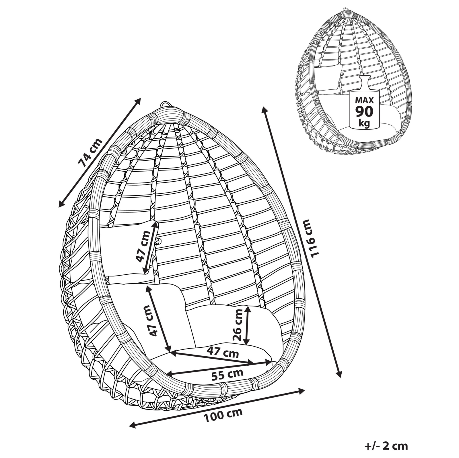 Fotoliu suspendat fără suport în stil boho. Mobilierul în tonuri neutre poate fi elegant și plin de personalitate. Acest fotoliu suspendat, cu structură circulară, adaugă un farmec boho oricărui dormitor, living sau balcon, completând perfect un decor modern. Fără un suport metalic, acest design inovator pune în valoare simplitatea și fluiditatea formei, aducând un plus de armonie spațiului tău. Pernele groase, de culoare gri, îți oferă un confort desăvârșit, transformându-l într-un loc ideal pentru relaxare sau lectură. Coșul din ratan sintetic garantează durabilitatea piesei, fiind o alegere practică și de lungă durată, care îți va înfrumuseța casa pentru mulți ani. Detalii: Tip de Produs: Fotoloiu suspendat. Stil: Retro. Culoare: Gri. Nuanță: Gri deschis. Material: Ratan sintetic. Material primar: Ratan sintetic. Material secundar: Oțel. Material scaun: Țesătură. Compoziția materialului: 100% Poliester. Densitatea pernei scaunului: 25 kg/m3. Dimensiuni: Adâncime: 74 cm. Grosimea scaunului: 15 cm. Lățime: 100 cm. Înălțime: 116 cm. Suprafața de ședere: 100x74 cm. Greutate: 12 kg. Capacitatea de greutate: 90 kg. Oferta incude: 1 x Scaun, 1 x Pernă pentru șezut, 1 x Pernă. Caracteristici cheie: Legături practice pentru o prindere sigură, Confort maxim, Materiale de cea mai bună calitate, Atât în interior cât și în exterior, Rezistență UV 4 (ISO 105-B05), Ușor de curățat. Asamblare: Nu necesită asamblare. Informații suplimentare: Pentru a agăța scaunul suspendat de tavan, este necesar un lanț sau un cablu, care nu este inclus în ofertă. Vă rugăm să rețineți că produsul este sensibil la condițiile meteorologice și trebuie păstrat în interior sau într-un loc acoperit și moderat, atunci când nu este folosit. Descriere: Mobilierul rezistent la razele UV oferă o protecție sporită împotriva decolorării sau schimbării culorii. Totuși, recomandăm depozitarea produsului într-un loc acoperit atunci când nu este folosit. Astfel, veți asigura o durată de viață maximă a mobilierului. Rezistență: UV. Sfaturi de întreținere: Ratan sintetic: 1.Curățați cu soluții de curățare pe bază de săpun. Evitați produsele de curățare caustice sau chimice. 2.Pentru a prelungi durata de viață a mobilierului, protejați-l de expunerea directă la soare. 3.Ustensilele sau accesoriile din sticlă pot provoca supraîncălzirea suprafeței. 4.Se recomandă să folosiți o husă de protecție pentru sezonul de iarnă sau, dacă este posibil, să păstrați mobilierul uscat și răcoros în interior. Țesătură: 1.Curățați cu șampon uscat și un burete umed sau cu un detergent delicat. 2.Aspirați folosind un accesoriu potrivit. 3.Când nu este folosit, păstrați-l într-un loc curat și uscat pentru a-l proteja de condițiile atmosferice.