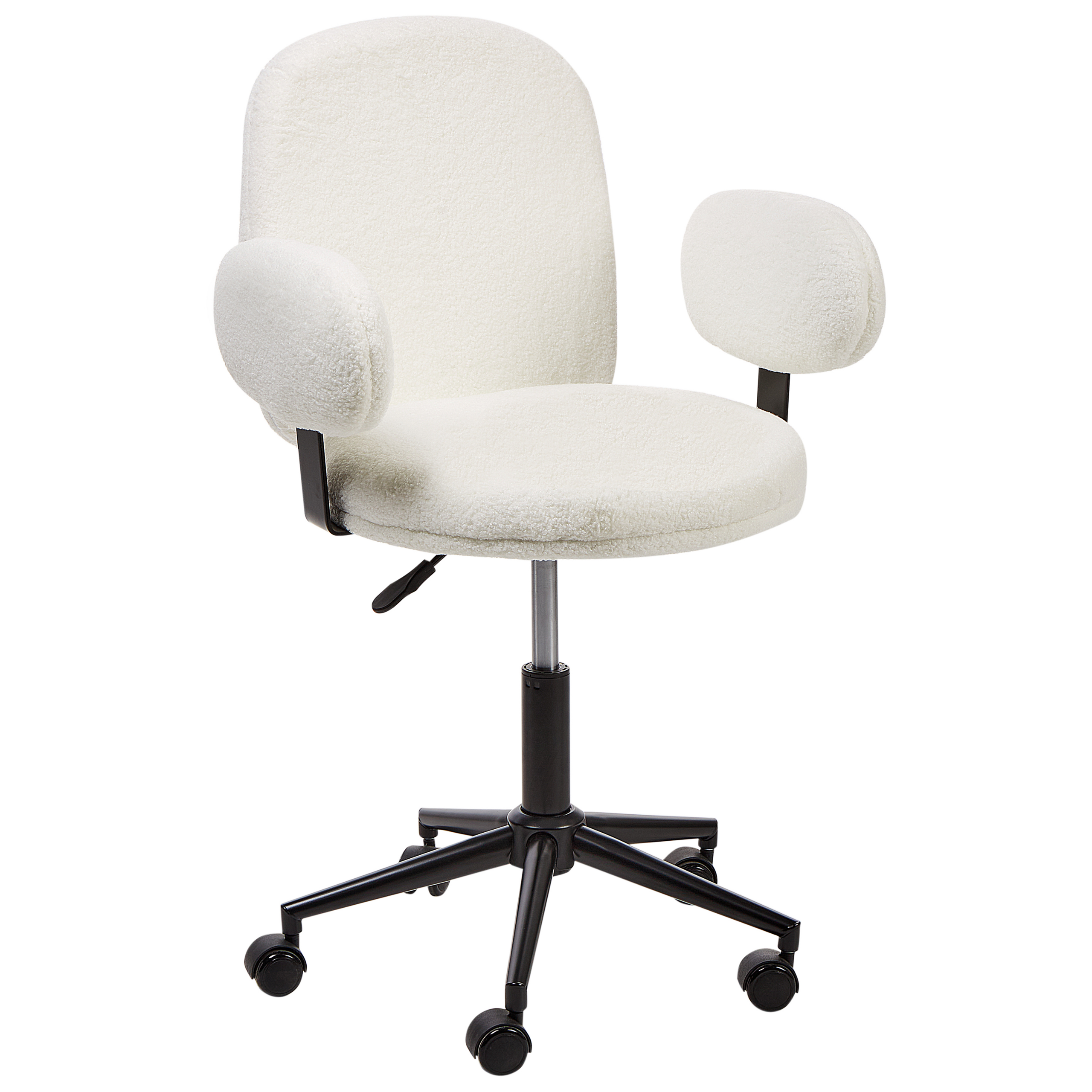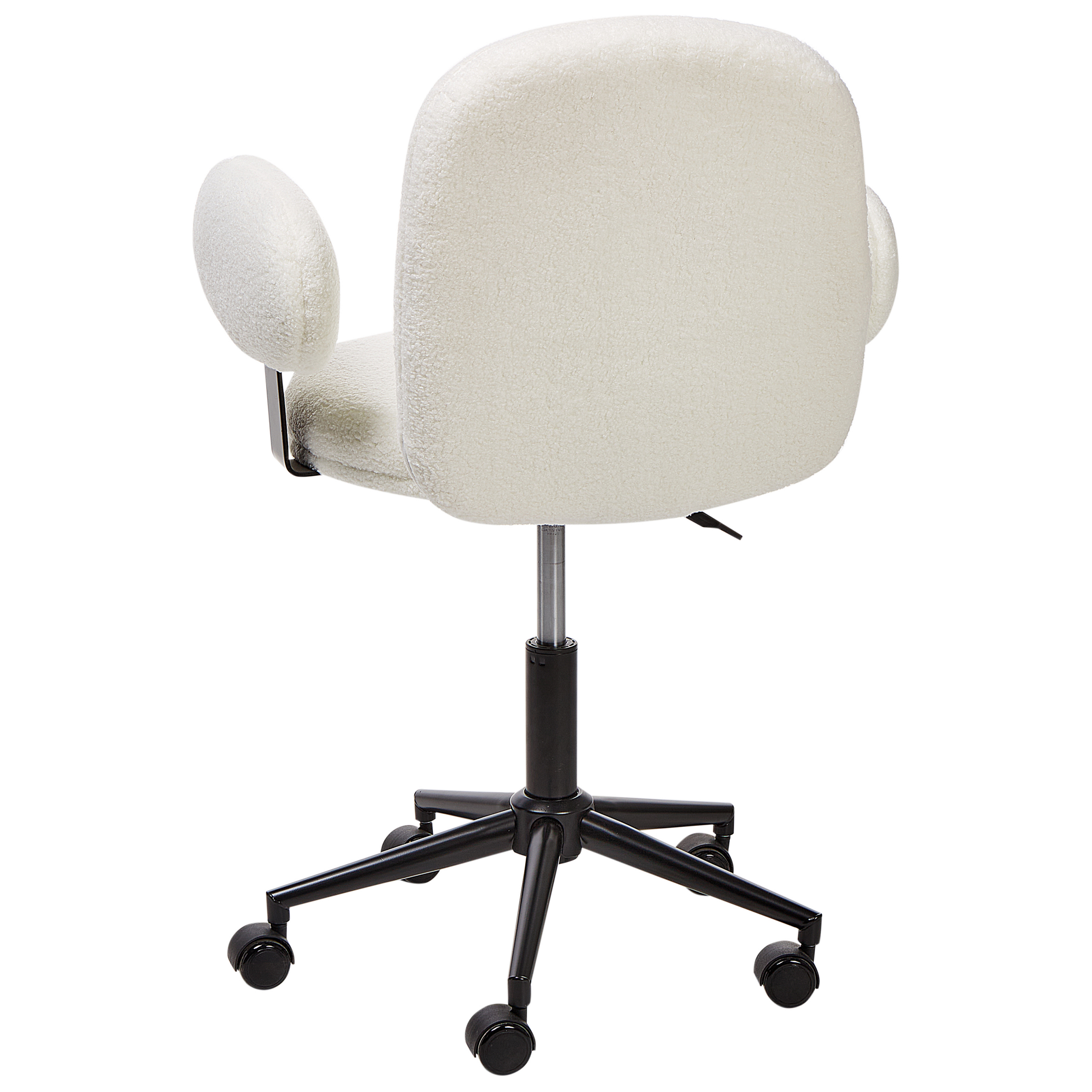 Scaun de birou tapițat cu cotiere. Creează un colț confortabil în biroul tău cu acest scaun tapițat deosebit de confortabil. Șezutul și spătarul generos, împreună cu cotierele, sunt acoperite cu țesătură boucle moale și plăcută la atingere, într-o nuanță elegantă. Baza neagră, din metal durabil, oferă stabilitate, iar mecanismul cu piston pe gaz permite reglarea precisă a înălțimii scaunului. În plus, funcția de rotație 360° îl face extrem de versatil și practic pentru orice birou. Detalii: Tip de Produs: Scaun de birou. Stil: Retro. Culoare: Alb. Nuanță: Alb-murdar. Material: Țesătură. Material primar: Boucle. Material secundar: Fier. Detalii material picioare: Metal. Material scaun: Țesătură. Compoziția materialului: 100% Poliester. Rotire la 360°: Da. Piese reglabile: Înălțime scaun. Cotiere: Da. Finisaj: Acoperire pulverizată. Protecții pentru picioare incluse: Nu. Înclinare: Nu. Dimensiuni: Înălțimea cotierei: 66 cm. Adâncime: 58 cm. Înălțimea scaunului: 42-57 cm. Lățime: 58 cm. Înălțime: 80-95 cm. Suprafața de ședere: 46x46 cm. Greutate: 8 kg. Capacitatea de greutate: 130 kg. Oferta incude: 1 x Scaun. Caracteristici cheie: Rotire de 360°, Roți pivotante cu rulare lină, Reglarea pneumatică a înălțimii scaunului, Confort maxim, Design modern. Asamblare: Necesită asamblare completă.5-15 min. Informații suplimentare: Pentru o stabilitate și siguranță maximă în utilizare, se recomandă să verificați la aproximativ 2 săptămâni după instalare dacă produsul a fost asamblat corect. De asemenea, se recomandă să verificați dacă șuruburile sunt strânse corect, o dată la 3 luni. Sfaturi de întreținere: Boucle: 1.Vă rugăm să curățați cu un șampon uscat și un burete umed sau cu un detergent ușor. 2.Aspirati folosind un accesoriu potrivit. Fier: 1.Curățați cu un detergent delicat și o cârpă moale, apoi ștergeți bine. 2.Pentru a evita zgârieturile, nu folosiți produse de curățare abrazive. 3.Pentru elementele din cupru sau crom, folosiți un agent de lustruire.