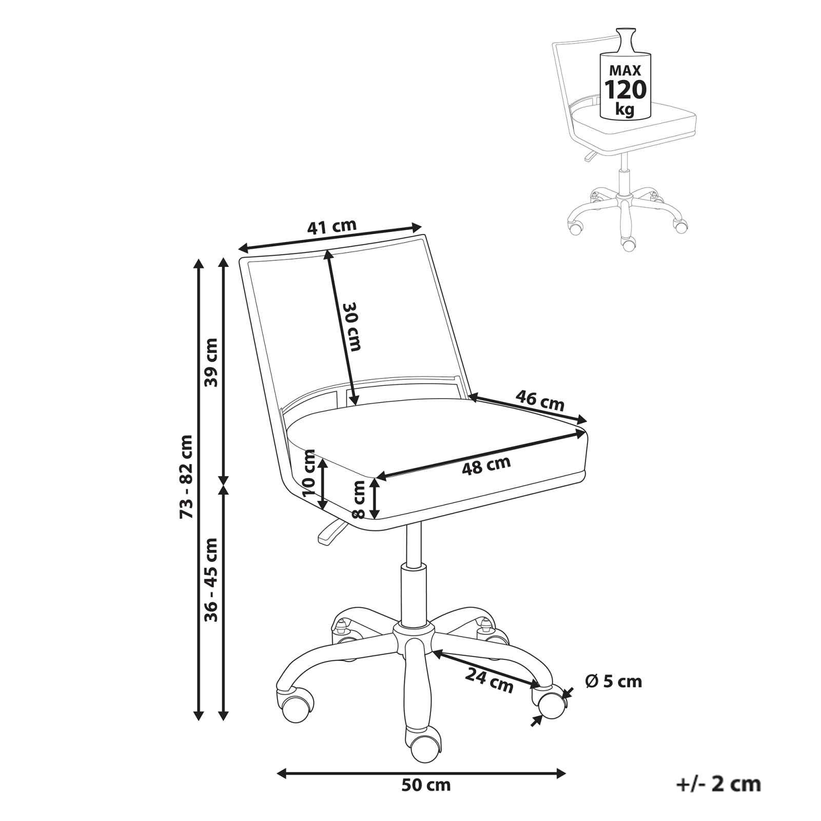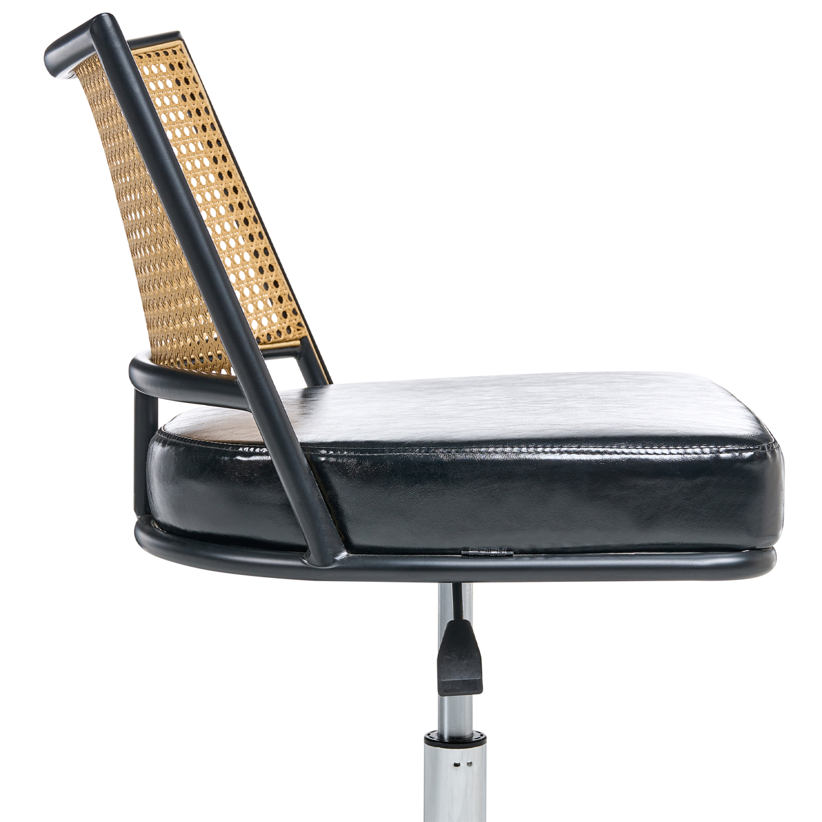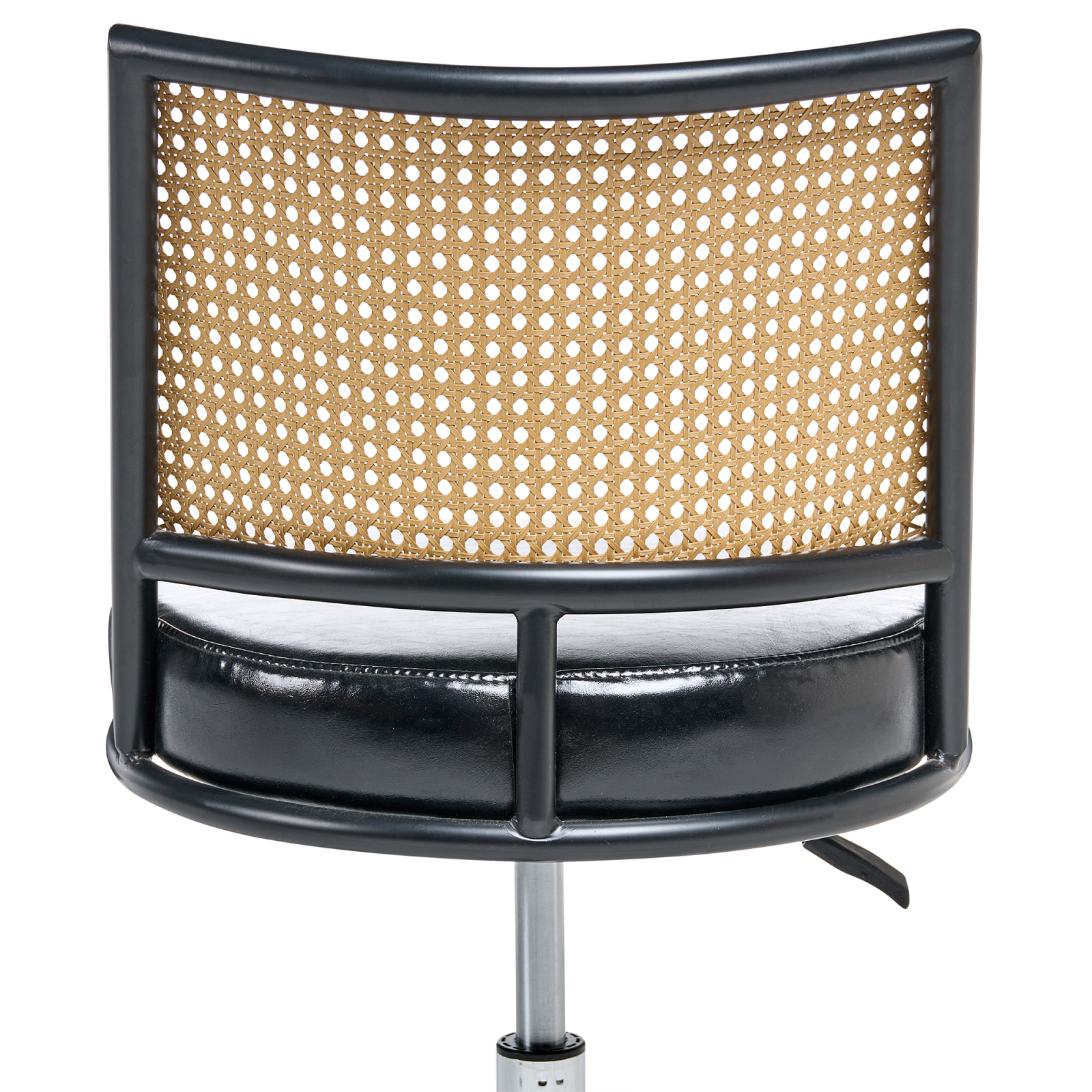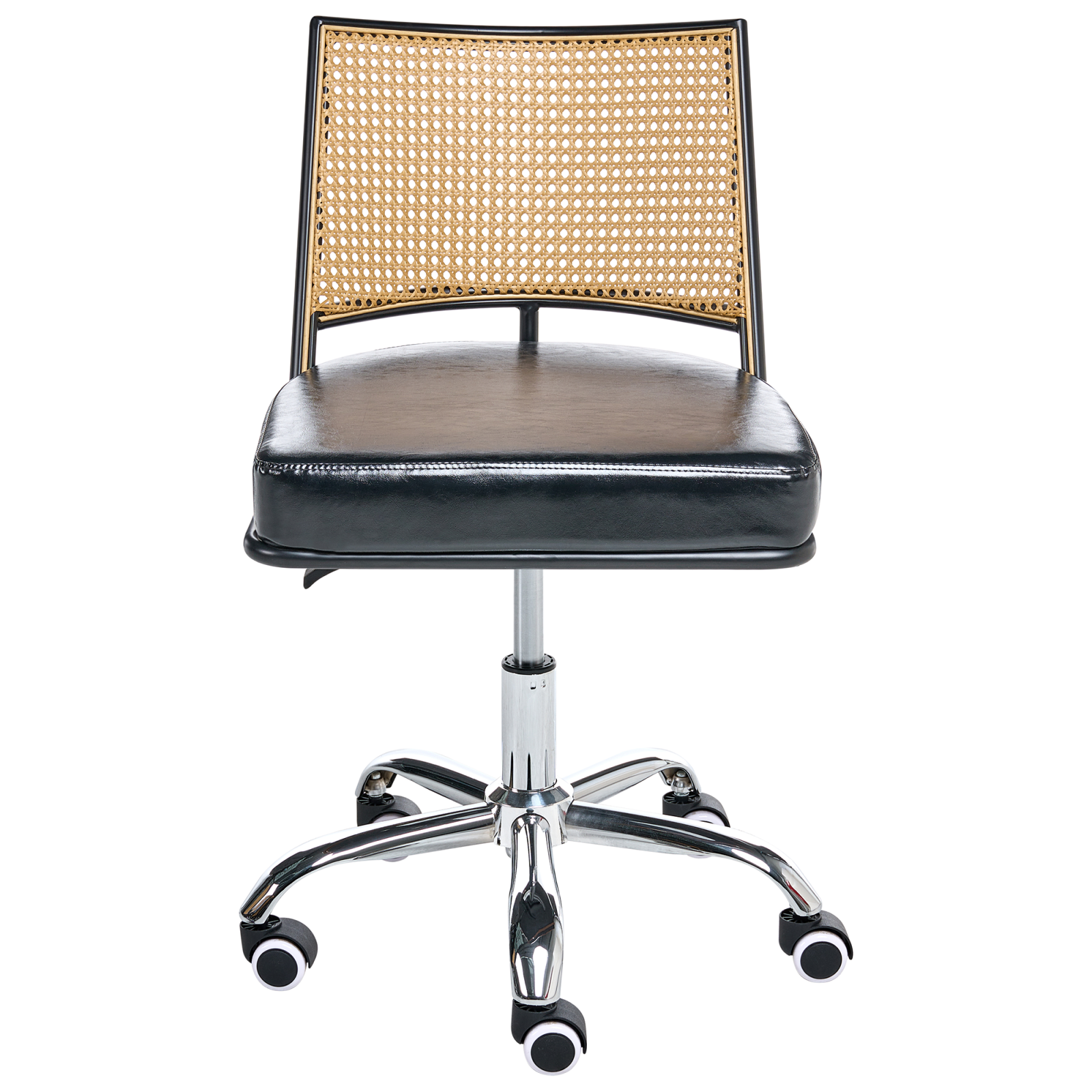 Scaun de birou rotativ cu design retro. Bucură-te de confort și eleganță atemporală cu acest scaun de birou, tapițat cu piele ecologică de înaltă calitate, ce oferă un aspect rafinat și întreținere facilă. Spătarul distinctiv prezintă un design cu împletitură vieneză, realizat din ratan sintetic durabil, adăugând o notă clasică plină de farmec. Dotat cu reglaj pneumatic pe înălțime și roți cu frână de siguranță, oferă suport personalizat și stabilitate sporită pe durata întregii zile de lucru. Ideal pentru orice spațiu de lucru, acest model îmbină cu ușurință stilul și funcționalitatea. Creează o atmosferă sofisticată în biroul tău cu această soluție unică de ședere. Detalii: Tip de Produs: Scaun de birou. Stil: Retro. Culoare: Negru. Material: Piele ecologică. Material primar: Piele ecologică. Material secundar: Placaj. Detalii material picioare: Metal. Material scaun: Piele ecologică. Compoziția materialului: 100% Piele PVC. Rotire la 360°: Da. Piese reglabile: Înălțime scaun. Cotiere: Nu. Finisaj: Cromat. Protecții pentru picioare incluse: Nu. Înclinare: Nu. Dimensiuni: Adâncime: 50 cm. Înălțimea scaunului: 36-45 cm. Lățime: 50 cm. Înălțime: 73-82 cm. Suprafața de ședere: 46x48 cm. Greutate: 7 kg. Capacitatea de greutate: 120 kg. Oferta incude: 1 x Scaun de birou. Caracteristici cheie: Rotire de 360°, Funcție de frână de siguranță care blochează roțile pentru siguranță, se deblochează pentru mobilitate. Reglarea pneumatică a înălțimii scaunului, Design tradițional cu o notă modernă, Construcție solidă și stabilă. Asamblare: Necesită asamblare completă.5-15 min. Informații suplimentare: Pentru o stabilitate și siguranță maximă în utilizare, se recomandă să verificați la aproximativ 2 săptămâni după instalare dacă produsul a fost asamblat corect. De asemenea, se recomandă să verificați dacă șuruburile sunt strânse corect, o dată la 3 luni. Sfaturi de întreținere: Piele ecologică: 1.O dată pe săptămână, ștergeți cu o cârpă umedă și uscați după curățare. Nu folosiți substanțe uleioase. 2.Vă rugăm să curățați cu apă distilată și să folosiți detergenți pe bază de săpun pentru petele dificile. 3.Utilizați doar soluții de curățare delicate și balsamuri dedicate pielii ecologice. 4.Aspirati folosind un accesoriu potrivit. Metal: 1.Curățați cu un detergent delicat și o cârpă moale, apoi ștergeți bine. 2.Pentru a evita zgârieturile, nu folosiți produse de curățare abrazive. 3.Pentru elementele din cupru sau crom, folosiți un agent de lustruire.