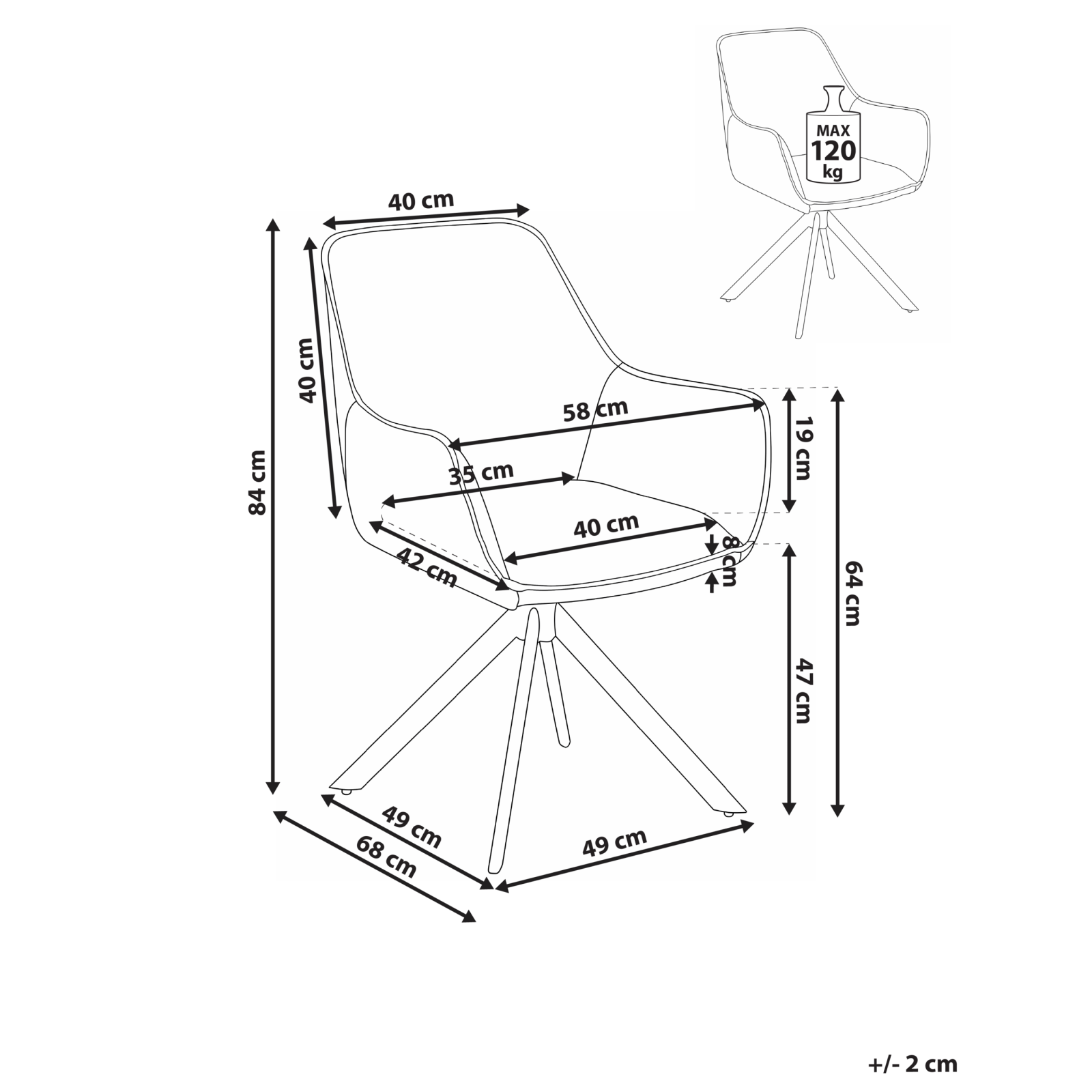 Scaun ergonomic rotativ. Acest scaun pivotant îmbină stilul scandinav cu funcționalitatea modernă. Dispune de un șezut ergonomic tip scoică, tapițat elegant, și picioare rezistente din fier vopsit electrostatic. Designul contrastant și funcția de rotire aduc un plus de confort și stil oricărei mese de dining. Detalii: Tip de Produs: Scaun dining. Stil: Scandinav. Culoare: Bej. Nuanță: Bej deschis. Material: Țesătură. Material primar: In sintetic. Material secundar: Fier. Materialul cadrului: Metal. Detalii material picioare: Metal. Material scaun: Spumă. Compoziția materialului: 95% Poliester. Cotiere: Da. Finisaj: Acoperire pulverizată. Stivuire: Nu. Dimensiuni: Înălțimea cotierei: 64 cm. Adâncime: 68 cm. Înălțimea scaunului: 47 cm. Lățime: 58 cm. Înălțime: 84 cm. Suprafața de ședere: 42x40 cm. Greutate: 8 kg. Capacitatea de greutate: 120 kg. Oferta incude: 1 x Scaun. Caracteristici cheie: Rotire de 360°, Picioare robuste pentru o stabilitate optimă, Stil minimalist scandinav, Design modern, Tapițerie din țesătură de înaltă calitate. Asamblare: Necesită asamblare parțială.5-15 min. Informații suplimentare: Pentru o stabilitate și siguranță maximă în utilizare, se recomandă să verificați la aproximativ 2 săptămâni după instalare dacă produsul a fost asamblat corect. De asemenea, se recomandă să verificați dacă șuruburile sunt strânse corect, o dată la 3 luni. Trebuie remarcat faptul că lemnul este un material natural și, prin urmare, fiecare obiect din lemn diferă de celelalte. Diferențele de culoare și de textură a suprafeței (noduri de lemn, dungi etc.) sunt caracteristici intrinseci ale materialului și, prin urmare, nu sunt considerate defecte ale produsului. Sfaturi de întreținere: Țesătură: 1.Vă rugăm să curățați cu un șampon uscat și un burete umed sau cu un detergent ușor. 2.Aspirati folosind un accesoriu potrivit. Fier: 1.Curățați cu un detergent delicat și o cârpă moale, apoi ștergeți bine. 2.Pentru a evita zgârieturile, nu folosiți produse de curățare abrazive. 3.Pentru elementele din cupru sau crom, folosiți un agent de lustruire.