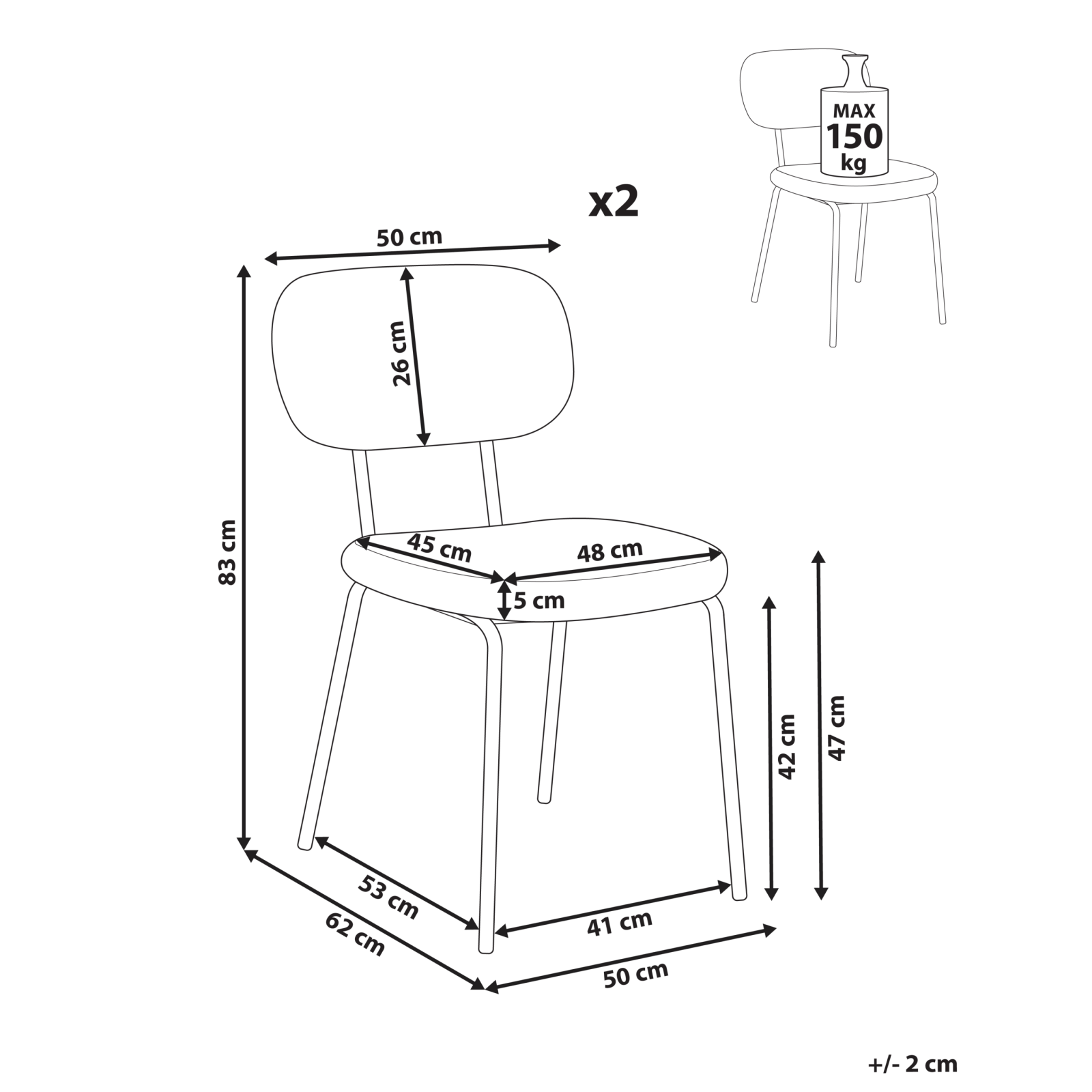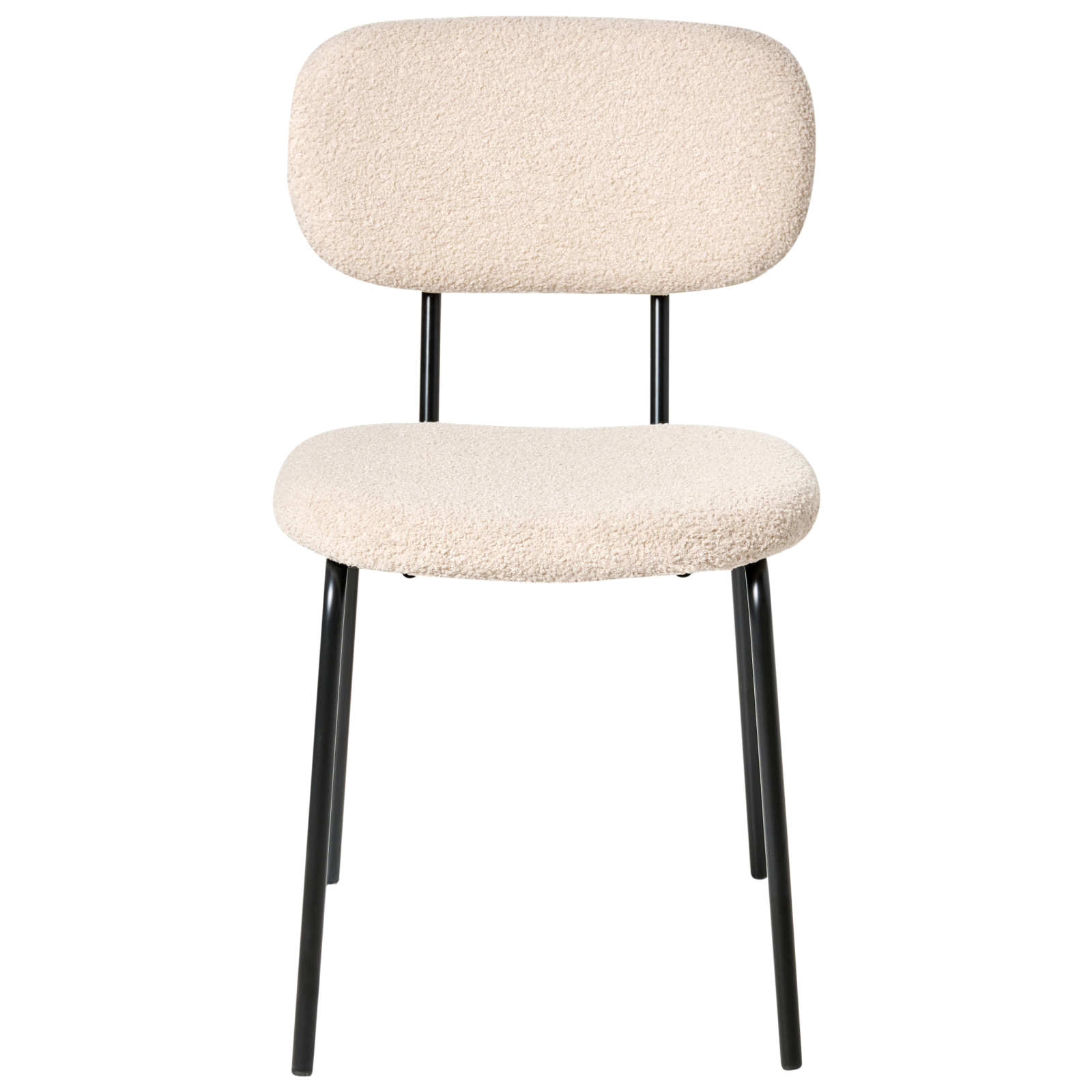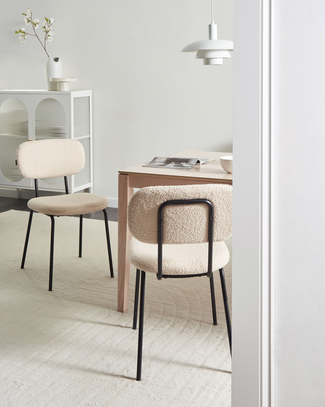 Scaune de dining tapițate. Adaugă o notă de eleganță vintage zonei tale de dining cu aceste scaune tapițate în boucle moale și luxos. Fiecare piesă este creată pentru a-ți oferi o experiență plăcută de relaxare, în timp ce cadrul metalic negru adaugă un accent modern, subtil și sofisticat. Perfect pentru un ambient scandinav sau minimalist, acest set transformă fiecare masă într-un moment special, unde stilul și confortul se împletesc armonios. Detalii: Tip de Produs: Scaun dining. Stil: Retro. Culoare: Bej. Culoarea cadrului: Negru. Material: Țesătură. Material primar: Boucle. Material secundar: Placaj. Materialul cadrului: Metal. Detalii material picioare: Metal. Material scaun: Boucle. Compoziția materialului: 100% Poliester. Cotiere: Nu. Stivuire: Nu. Dimensiuni: Adâncime: 62 cm. Înălțimea scaunului: 47 cm. Lățime: 50 cm. Înălțime: 83 cm. Suprafața de ședere: 48x45 cm. Greutate: 5 kg. Capacitatea de greutate: 150 kg. Oferta incude: 2 x Scaun. Caracteristici cheie: Confort maxim la șezut, Design elegant, Stil retro, Materiale de cea mai bună calitate, Excepțional de ușor de întreținut, Capace pentru picioare pentru protecția suprafeței. Asamblare: Picioare neasamblate.5-15 min. Informații suplimentare: Pentru o stabilitate și siguranță maximă în utilizare, se recomandă să verificați la aproximativ 2 săptămâni după instalare dacă produsul a fost asamblat corect. De asemenea, se recomandă să verificați dacă șuruburile sunt strânse corect, o dată la 3 luni. Sfaturi de întreținere: Boucle: 1.Vă rugăm să curățați cu un șampon uscat și un burete umed sau cu un detergent ușor. 2.Aspirati folosind un accesoriu potrivit. Fier: 1.Curățați cu un detergent delicat și o cârpă moale, apoi ștergeți bine. 2.Pentru a evita zgârieturile, nu folosiți produse de curățare abrazive. 3.Pentru elementele din cupru sau crom, folosiți un agent de lustruire.