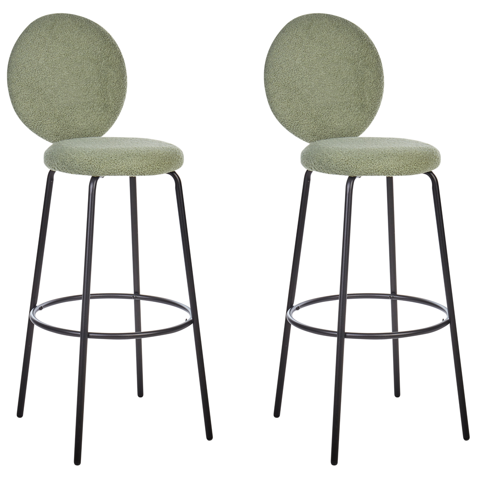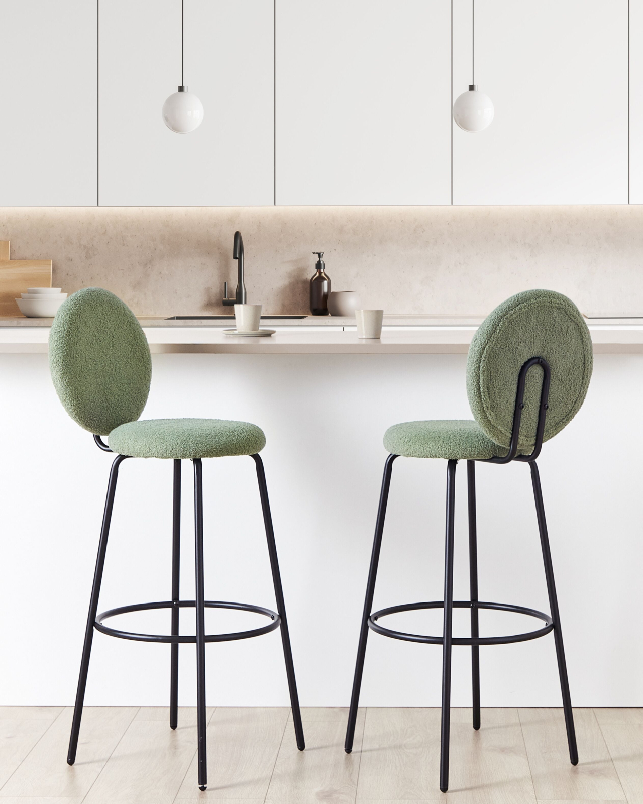 Scaune de bar cu spătar rotund. Aceste scaune de bar elegante sunt tapițate cu un material boucle texturat, moale la atingere, oferind o opțiune de ședere stilată și confortabilă. Fără cotiere și susținute de picioare solide din oțel cu finisaj negru mat, creează un contrast plăcut cu tapițeria verde deschis. Aceste piese îmbină funcționalitatea cu un design modern, fiind ideale pentru diverse spații precum bucătărie sau dining. Detalii: Tip de Produs: Scaun de bar. Stil: Modern. Culoare: Verde. Culoarea cadrului: Negru. Nuanță: Verde deschis. Material: Țesătură. Material primar: Boucle. Material secundar: Oțel. Detalii material picioare: Metal. Material scaun: Țesătură. Compoziția materialului: 100% Poliester. Cotiere: Nu. Finisaj: Opac. Stivuire: Nu. Dimensiuni: Adâncime: 43 cm. Înălțimea scaunului: 77 cm. Lățime: 43 cm. Înălțime: 107 cm. Suprafața de ședere: 37x37 cm. Greutate: 5 kg. Capacitatea de greutate: 120 kg. Oferta incude: 2 x Scaun de bar. Caracteristici cheie: Țesătură moale la atingere, Picioare robuste pentru o stabilitate optimă, Suport pentru picioare practic, Culori calde și elegante, Se adaptează la orice stil de interior, De înaltă calitate. Asamblare: Necesită asamblare parțială. Informații suplimentare: Pentru o stabilitate și siguranță maximă în utilizare, se recomandă să verificați la aproximativ 2 săptămâni după instalare dacă produsul a fost asamblat corect. De asemenea, se recomandă să verificați dacă șuruburile sunt strânse corect, o dată la 3 luni. Sfaturi de întreținere: Boucle: 1.Vă rugăm să curățați cu un șampon uscat și un burete umed sau cu un detergent ușor. 2.Aspirati folosind un accesoriu potrivit. Oțel: 1.Curățați cu un detergent delicat și o cârpă moale, apoi ștergeți bine. 2.Pentru a evita zgârieturile, nu folosiți produse de curățare abrazive. 3.Pentru elementele din cupru sau crom, folosiți un agent de lustruire.