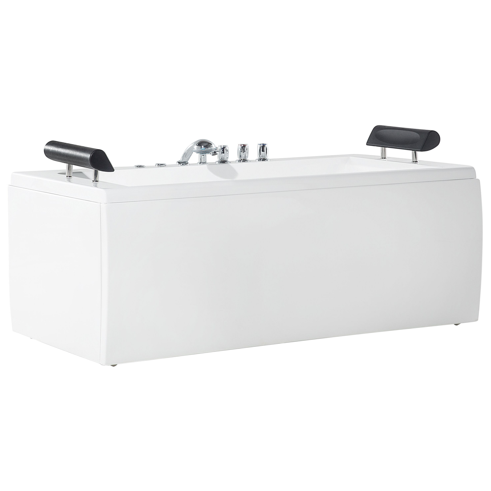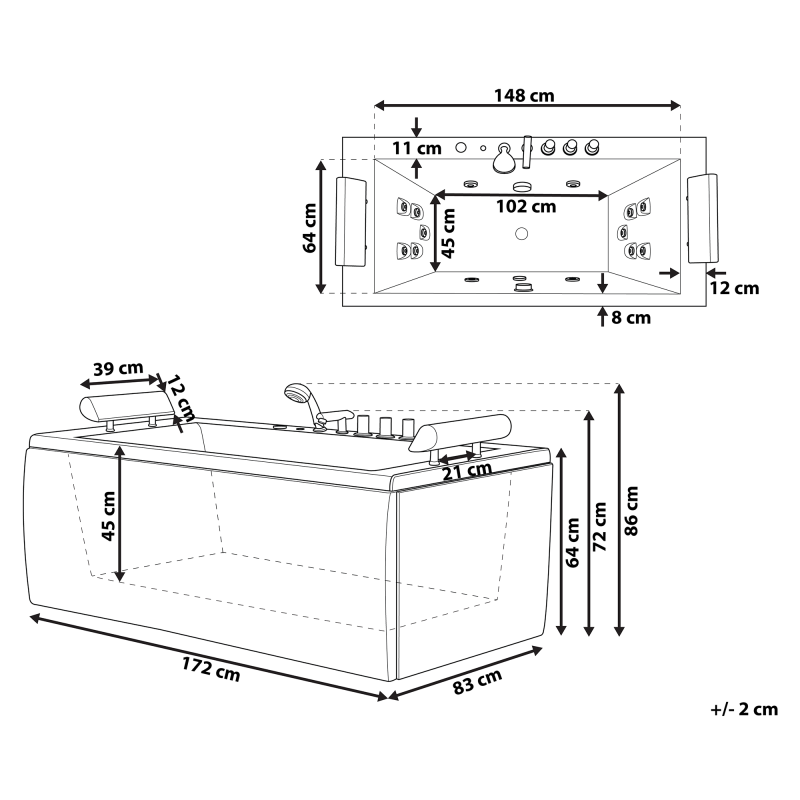 Cadă freestanding cu 14 jeturi de masaj. Această cadă rectangulară monolitică îmbină eleganța atemporală cu funcționalitatea modernă. Detaliile cromate și cele două tetiere din piele sintetică neagră adaugă un plus de stil și confort. Funcția de hidromasaj, împreună cu iluminarea LED subacvatică, creează o experiență plăcută și relaxantă. Datorită dimensiunii compacte, este ideală pentru spații mai mici, iar structura ranforsată cu fibră de sticlă garantează rezistență în timp. Detalii: Tip de Produs: Cadă cu hidromasaj pentru interior. Stil: Scandinav. Culoare: Alb. Material: Acrilic. Material primar: Acrilic. Material secundar: Oțel. Formă: Rectangulară. Panou de control digital: Nu. Finisaj: Galvanizat. Jeturi de hidromasaj: Da. Curenți de apă: 14. Consum de energie: 750 W. Nivel de zgomot: 50-85. Tensiune nominală: 230 V (50 Hz). Pompă cu jet: 0.75 kW/h. Cromoterapie subacvatică: Da. Capacitate: 206. Robinet tip cascadă: Nu. Dimensiuni: Lățime: 83 cm. Dimensiuni interioare: 102x45x45. Lungime: 172 cm. Înălțime: 86 cm. Greutate: 66 kg. Capacitatea de greutate: 210 kg. Oferta incude: 1x Țeavă de drenaj, 1 x Cadă cu hidromasaj, 1 x Sistem de preaplin, 1 x Duș de mână cu furtun, 2 x Tetiere, 1 x Baterie de cadă. Caracteristici cheie: Sistem de drenaj cu control al supraplinului, Lumină LED subacvatică, Jeturile de apă oferă un masaj delicat, Panouri pentru cadă frontale și pe ambele laturi, Cu tetieră moale, Design modern, Materiale ușor de întreținut și durabile. Asamblare: Instalarea trebuie să fie efectuată de un electrician calificat.90-120 min. Informații suplimentare: Conectarea căzii de baie la rețeaua de alimentare trebuie efectuată de un specialist autorizat și calificat. Instalarea rezervorului trebuie efectuată în conformitate cu toate directivele aplicabile în statul în cauză. Pentru a evita deteriorarea în timpul transportului, rezervoarele sunt preasamblate. Instalarea trebuie efectuată de către un instalator calificat. Pentru a evita deteriorarea pompei, umpleți cada cu apă înainte de a utiliza funcția de masaj. Furtunurile adecvate trebuie achiziționate din surse locale și conectate de un specialist. În niciun caz nu trebuie utilizate furtunurile de conectare furnizate de vânzător. Vă rugăm să rețineți că numărul de serie al căzii de baie se află pe rama interioară a acesteia, precum și pe cutie. Acest număr unic trebuie păstrat și ar putea fi necesar în cazul unei cereri de piese de schimb sau al unei cereri de garanție. Toate furtunurile trebuie verificate și etanșate de un specialist înainte de utilizarea produsului și periodic. Furtunurile se pot deconecta în timpul transportului sau în timp. În cazul unui defect, clientul este responsabil pentru îndepărtarea părții defecte și reasamblarea acesteia. Produsul nu este compatibil cu prizele elvețiene sau englezești și necesită adaptor potrivit. Sfaturi de întreținere: Acrilic: 1.Clătiți cu apă după fiecare baie și uscați. 2.Folosiți numai agenți de curățare care nu deteriorează acest material. 3.Se recomandă utilizarea cu prudență a uleiurilor esențiale, deoarece acestea pot lăsa reziduuri uleioase. 4.La instalarea produsului, clientul trebuie să se asigure că panoul frontal este ușor accesibil în orice moment pentru întreținere și în cazul în care trebuie înlocuite piesele. 5.Curățați și întrețineți regulat cada sau cada cu hidromasaj conform instrucțiunilor producătorului, pentru a preveni acumularea de murdărie, bacterii și formarea mucegaiului.