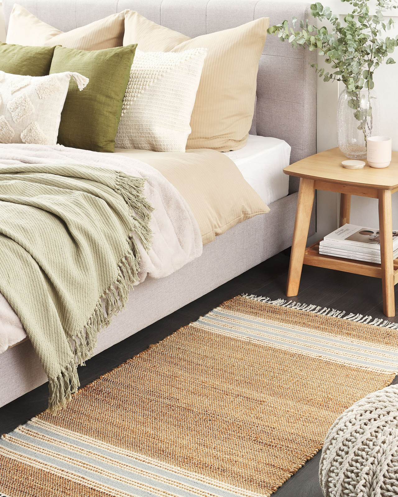 Covor decorativ cu model în dungi și franjuri. Dacă îți dorești un accesoriu care să adauge un aer primitor designului interior, acest covor este o alegere excelentă. Realizat manual din iută de înaltă calitate, lână și bumbac, pentru un aspect natural, va arăta perfect în living sau camera de dining, indiferent dacă stilul tău este boho, tradițional sau rustic. Detalii: Tip de Produs: Covor împletit. Stil: Boho. Culoare: Bej. Nuanță: Bej deschis. Material: Țesătură. Material primar: Iută. Material secundar: Lână. Compoziția materialului: 75% Iută. Formă: Rectangulară. Acoperire inferioară din cauciuc: Nu. Gram pe metru pătrat: 1800. Model: Cu dungi. Potrivit pentru încălzire prin pardoseală: Da. Țesut: Țesut manual. Dimensiuni: Grosime: 0.6 cm. Lățime: 80 cm. Lungime: 150 cm. Greutate: 2.2 kg. Oferta incude: 1 x Covor. Caracteristici cheie: Potrivit pentru încălzire în pardoseală, Realizat manual cu mare atenție la detalii, Creează o atmosferă confortabilă, Ideal atât pentru dormitor, cât și pentru camera de zi, De înaltă calitate. Asamblare: Nu necesită asamblare. Informații suplimentare: Vă rugăm să rețineți că, datorită producției manuale, fiecare piesă poate diferi ușor în ceea ce privește culoarea, textura și dimensiunea (+/- 5-7 cm). Aceste variații nu pot fi considerate reclamații. După despachetare, articolul are nevoie de aproximativ 72 de ore pentru a căpăta forma dorită. Vă recomandăm să îl desfășurați cât mai curând posibil și să plasați greutăți la capete pentru rezultate optime. Sfaturi de întreținere: 1.Pentru pete mai dificile, curățați suprafața cu o cârpă de bumbac umedă care nu pătează. Dacă este necesar, folosiți un detergent pentru lână. Nu udați prea mult covorul și uscați-l imediat după curățare. Folosiți numai detergenți pentru covoare. Contactați un expert pentru îndepărtarea petelor dificile. 2.Aspirați o dată pe săptămână la putere medie, folosind un accesoriu pentru tapițerie, în direcția firului covorului. 3.Pentru a elimina mirosul specific al materialului natural din care este confecționat covorul, aerisiți produsul timp de câteva ore ( ideal 1 sau 2 zile). 4.Îndepărtați imediat orice pată cu o cârpă umedă care nu-și pierde culoarea. Ștergeți de la margine spre centrul covorului, nu frecați. 5.Rotiți periodic covorul la 180 ̊ pentru a asigura o uzură uniformă și pentru a preveni decolorarea cauzată de expunerea la soare.