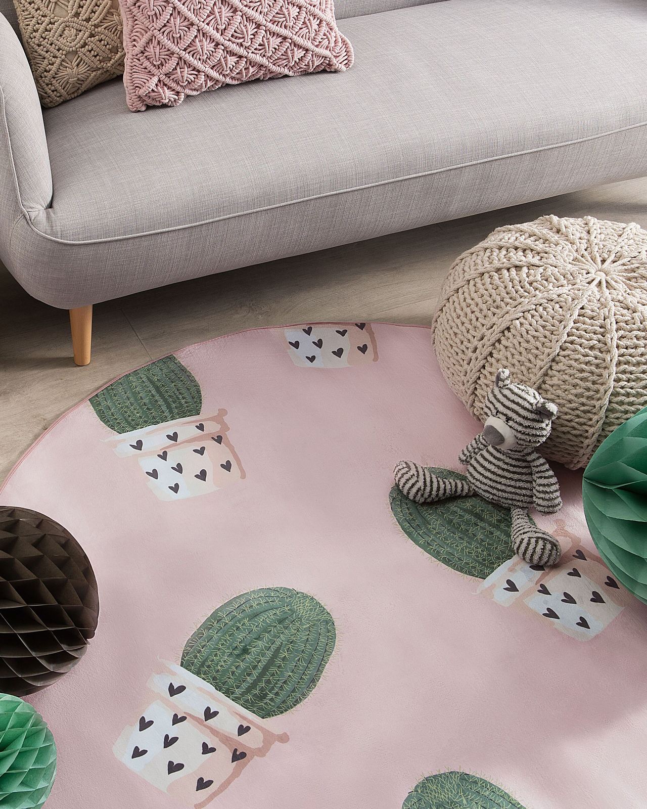Design elegant al covorului. Acest covor de culoare deschisă este ideal pentru grădiniță sau camera de joacă. Motivul cactusului aduce bucurie și stimulează învățarea copiilor. Se asortează perfect cu fiecare cameră din casă, pentru un confort de neegalat. Stratul antiderapant de dedesubt asigură o stabilitate maximă, prevenind pericolele și accidentele. Detalii: Tip de Produs: Covor pentru camera copilului. Culoare: Roz. Material: Țesătură. Material primar: Tesătură. Material de bază: Tesătură. Compoziția materialului: 100% Poliester. Formă: Rotundă. Acoperire inferioară din cauciuc: Da. Gram pe metru pătrat: 500. Model: Imprimeu cu plante. Potrivit pentru încălzire prin pardoseală: Da. Țesut: Țesut la mașină. Dimensiuni: Grosime: 1 cm. Lățime: 120 cm. Lungime: 120 cm. Greutate: 1 kg. Oferta incude: 1 x Covor. Caracteristici cheie: Potrivit pentru încălzire în pardoseală, Riscul de alunecare redus datorită stratului inferior antiderapant, O completare excelentă pentru orice interior de casă, Materiale ușor de întreținut și durabile, Aspect modern și structură puternică pentru o durabilitate maximă. Asamblare: Nu necesită asamblare. Informații suplimentare: După despachetare, articolul are nevoie de aproximativ 72 de ore pentru a căpăta forma dorită. Vă recomandăm să îl desfășurați cât mai curând posibil și să plasați greutăți la capete pentru rezultate optime. Sfaturi de întreținere: 1.Aspirați o dată pe săptămână la putere medie, folosind un accesoriu pentru tapițerie, în direcția firului covorului. 2.Rotiți periodic covorul la 180 ̊ pentru a asigura o uzură uniformă și pentru a preveni decolorarea cauzată de expunerea la soare. 3.Îndepărtați imediat orice pată cu o cârpă umedă care nu-și pierde culoarea. Ștergeți de la margine spre centrul covorului, nu frecați. 4.Pentru pete mai dificile, curățați suprafața cu o cârpă de bumbac umedă care nu pătează. Dacă este necesar, folosiți un detergent pentru lână. Nu udați prea mult covorul și uscați-l imediat după curățare. Folosiți numai detergenți pentru covoare. Contactați un expert pentru îndepărtarea petelor dificile. 5.Pentru a elimina mirosul specific al materialului natural din care este confecționat covorul, aerisiți produsul timp de câteva ore ( ideal 1 sau 2 zile).