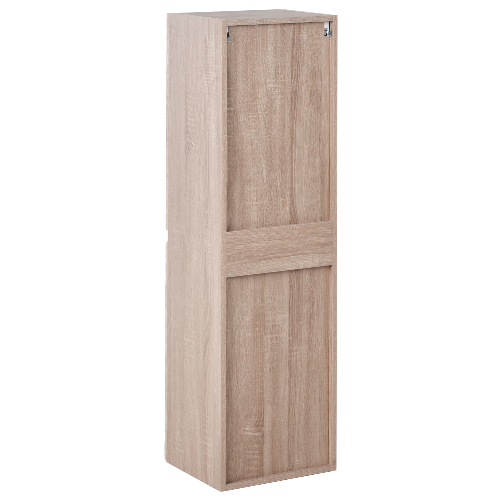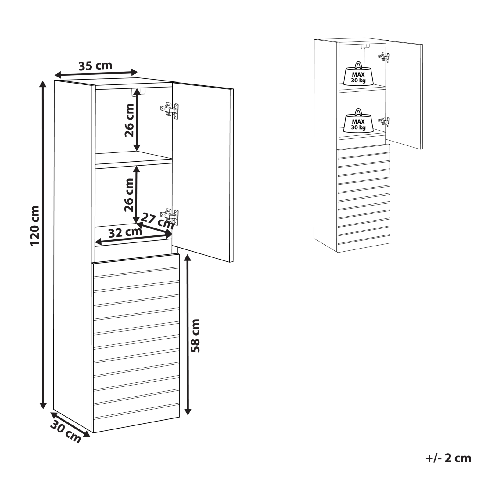 Dulap suspendat cu 2 rafturi. Acest dulap de baie înalt și îngust îmbină un spațiu generos de depozitare cu un design elegant. Echipat cu două uși fără mânere și finisaj maro deschis, se integrează perfect în interioarele de stil scandinav. Compartimentele superioare și inferioare oferă suficient spațiu pentru articole de toaletă, prosoape sau produse de curățenie, toate ascunse ordonat în spatele ușilor cu aspect de lemn. O alegere practică și inteligentă pentru orice baie, fără a aglomera spațiul. Detalii: Tip de Produs: Dulap de baie. Stil: Scandinav. Culoare: Maro. Nuanță: Maro deschis. Material: Lemn stratificat. Material primar: Fibră cu densitate medie (MDF). Materialul suprafeței mesei: Lemn stratificat. Deschiderea ușilor: Standard. Sertare: Nu. Finisaj: Melaminat. Numărul de uși: 2. Rafturi: Da. Dimensiuni: Adâncime: 30 cm. Lățime: 35 cm. Înălțime: 120 cm. Greutate: 18 kg. Capacitatea maximă a raftului: 30 kg. Capacitatea maximă: 30 kg. Oferta incude: 1 x Dulap de perete. Caracteristici cheie: Cu mecanism de închidere silențioasă, Construcție solidă și stabilă, Material ușor, dar durabil, Finisaje fine, Spațiu funcțional pentru fiecare obiect mic, Montare sigură și stabilă. Asamblare: Necesită instalare și asamblare.45-60 min. Sfaturi de întreținere: Fibră cu densitate medie (MDF): 1.Curățați delicat cu un detergent blând și o cârpă moale, apoi ștergeți suprafața până la uscare completă.