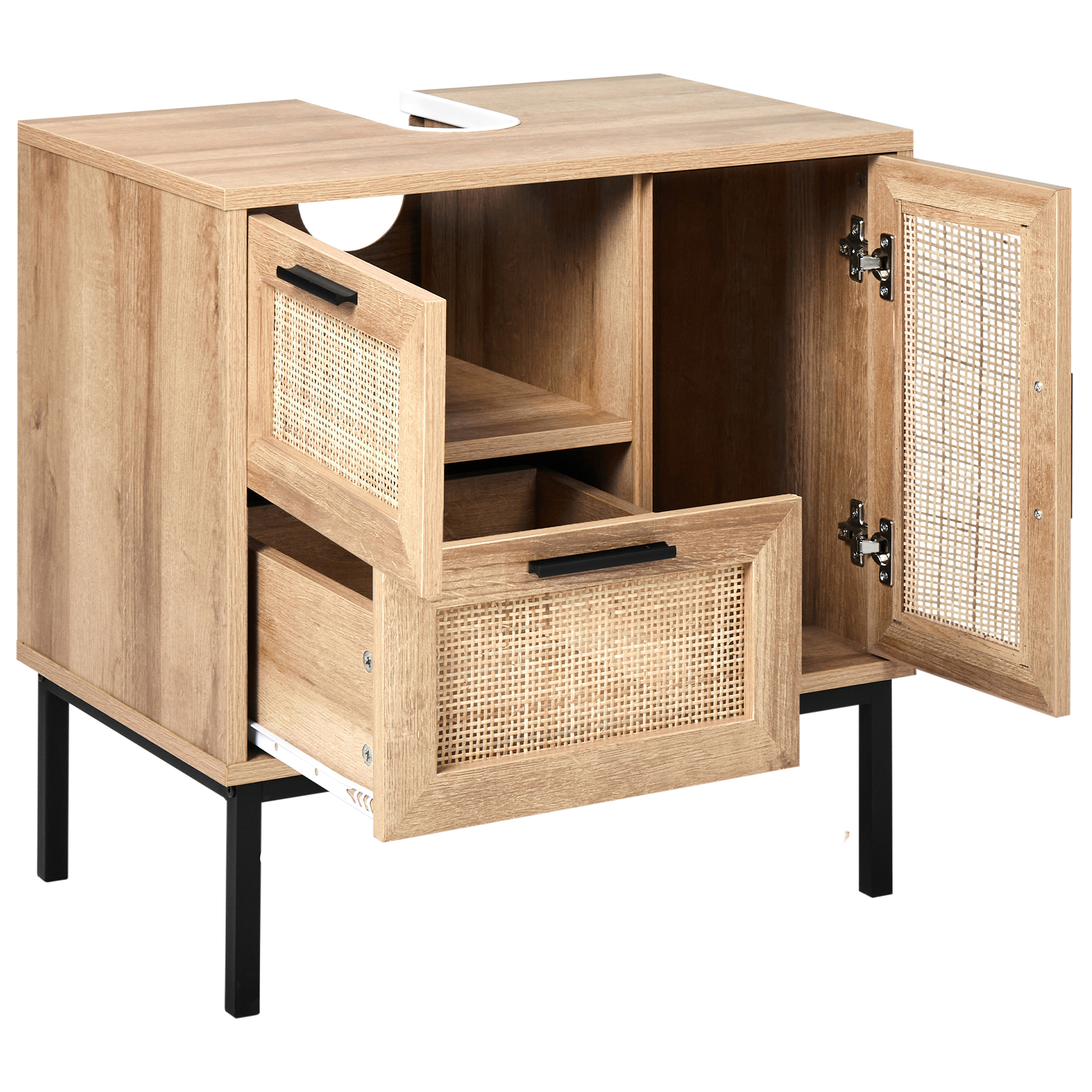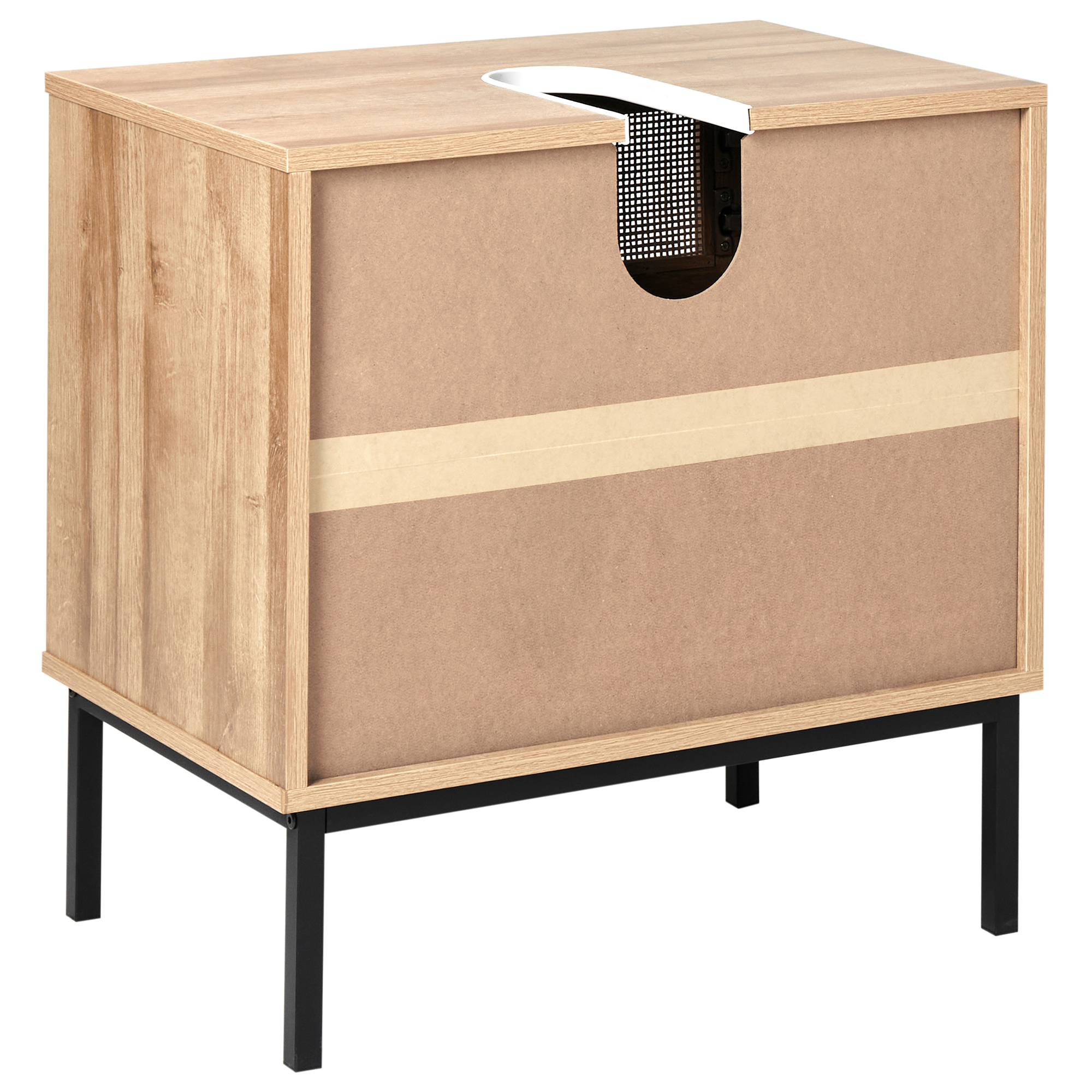 Dulap de baie independent cu fațadă împletită. Transformă-ți baia într-un spațiu primitor și elegant cu acest mobilier de baie cu lavoar. Fabricat din placaj de înaltă calitate, cu o fațadă împletită din ratan, adaugă un farmec natural și o textură caldă, care aduce un aer relaxant și plăcut în orice colț al băii tale. Cu o combinație practică de sertare și rafturi, acesta îți oferă spațiu suficient pentru toate produsele esențiale, păstrându-ți baia ordonată și funcțională. Ideal pentru a adăuga un strop de eleganță rustică și a-ți transforma baia într-un loc deosebit, plin de personalitate. Detalii: Tip de Produs: Dulap de baie. Stil: Boho. Culoare: Natural. Material: Lemn stratificat. Material primar: Placă din fibre cu densitate mică (LDF). Material secundar: Ratan. Materialul cadrului: Lemn stratificat. Materialul suprafeței mesei: Lemn stratificat. Deschiderea ușilor: Standard. Sertare: Da. Finisaj: Opac. Protecții pentru picioare incluse: Da. Numărul de uși: 1. Număr de sertare: 2. Rafturi: Da. Dimensiuni: Adâncime: 40 cm. Lățime: 60 cm. Înălțime: 60 cm. Greutate: 15 kg. Capacitatea maximă a sertarului: 5 kg. Capacitatea maximă a raftului: 5 kg. Capacitatea maximă: 15 kg. Oferta incude: 1 x Dulap pentru lavoar. Caracteristici cheie: Sertare cu sistem de închidere silențioasă, Foarte chic, Excepțional de ușor de întreținut, Spațiu practic pentru a depozita toate articolele de uz zilnic, Capace pentru picioare pentru protecția suprafeței. Asamblare: Necesită asamblare completă.20-40 min. Informații suplimentare: Vă rugăm să rețineți că, din motive de siguranță, produsul trebuie montat pe perete. Sfaturi de întreținere: Placă din fibre cu densitate mică (LDF): 1.Curățați delicat cu un detergent blând și o cârpă moale, apoi ștergeți suprafața până la uscare completă. Ratan: 1.Curățați numai cu o cârpă uscată. Nu folosiți detergenți.