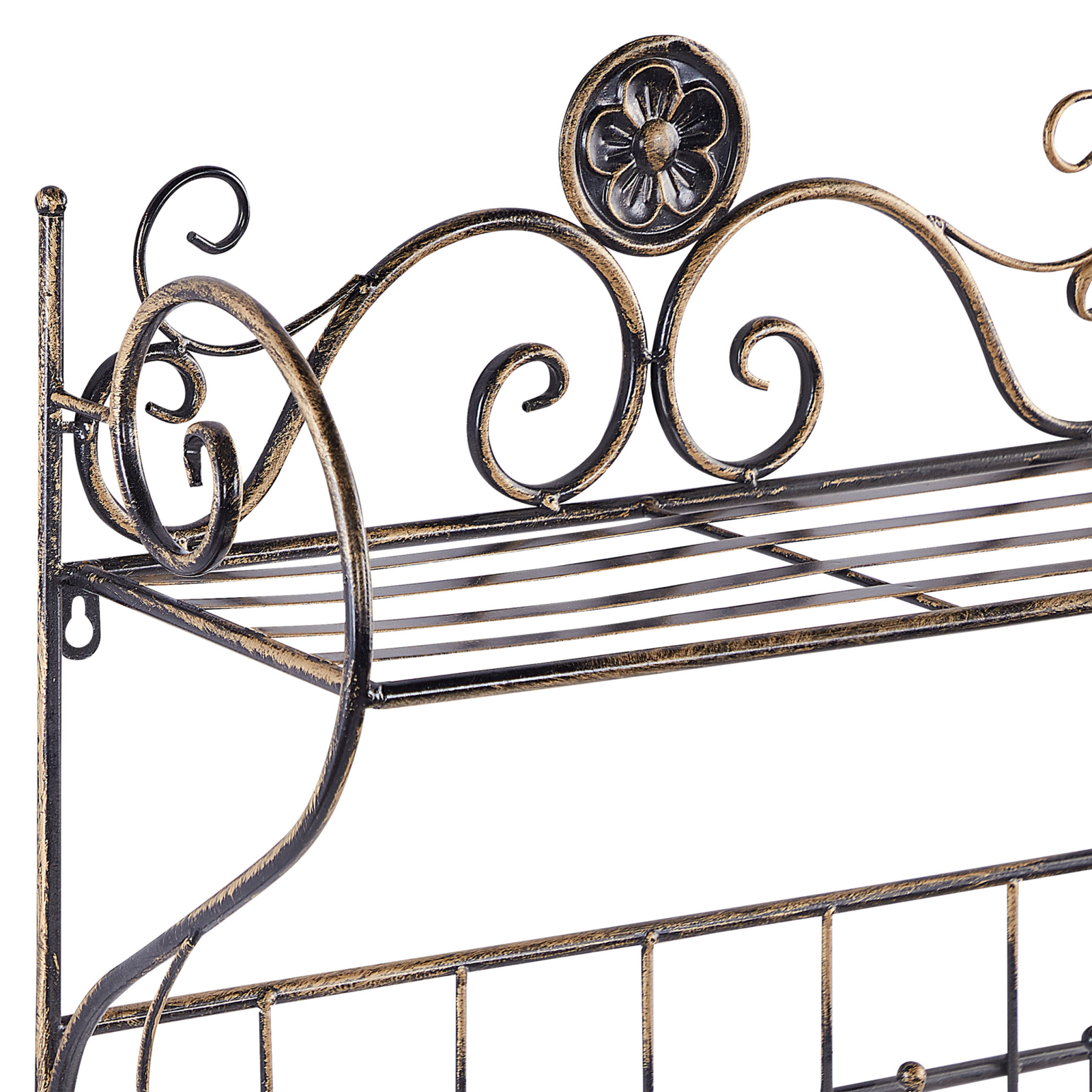 Raft suspendat pentru baie în stil vintage cu cârlige. Această etajeră metalică decorativă de perete este ideală atât pentru baie, cât și pentru hol. Cadrul cu design ornamental în stil vintage, cu efect antichizat, pune în valoare încăperi amenajate în stil retro sau rustic. Raftul superior oferă spațiu generos pentru accesorii și cosmetice, iar cele cinci cârlige practice permit agățarea halatelor, prosoapelor sau coșului de rufe. În hol, poate fi folosită pentru pălării, eșarfe și jachete, combinând funcționalitatea cu un aspect estetic deosebit. Detalii: Tip de Produs: Etajeră pentru baie. Stil: Retro. Culoare: Negru. Material: Metal. Material primar: Fier. Număr de rafturi: 1. Sertare: Nu. Finisaj: Acoperire pulverizată. Rafturi: Da. Dimensiuni: Adâncime: 18 cm. Lățime: 47 cm. Înălțime: 42 cm. Greutate: 2 kg. Capacitatea maximă: 10 kg. Oferta incude: 1 x Raft. Caracteristici cheie: Stil retro, Materiale de cea mai bună calitate, Ușor de curățat, Montare sigură și stabilă, Spațiu de depozitare suplimentar. Asamblare: Nu necesită asamblare. Informații suplimentare: Efectul imperfect, îmbătrânit sau pătat al acestui produs este intenționat și nu reprezintă un defect de fabricație. Sfaturi de întreținere: Fier: 1.Curățați cu un detergent delicat și o cârpă moale, apoi ștergeți bine. 2.Pentru a evita zgârieturile, nu folosiți produse de curățare abrazive. 3.Pentru elementele din cupru sau crom, folosiți un agent de lustruire.