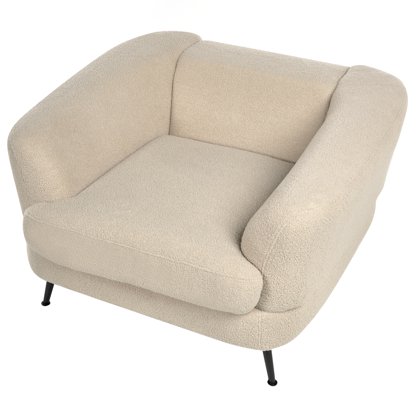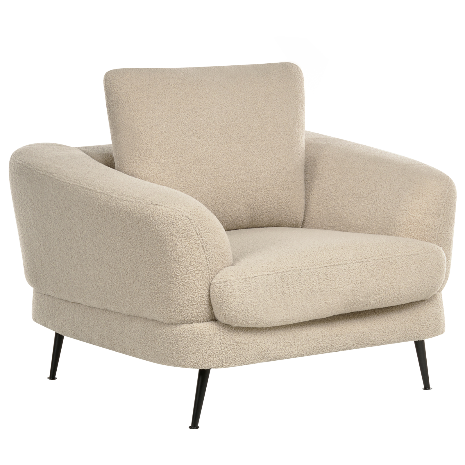 Fotoliu modern. Acest fotoliu adaugă un strop de eleganță în casă, fiind tapițat cu material boucle moale și plăcut la atingere, oferindu-ți atât confort, cât și calitate de lungă durată. Perna și brațele rotunjite formează o siluetă primitoare, iar picioarele solide din fier asigură stabilitate, făcându-l o alegere perfectă pentru living. Detalii: Tip de Produs: Fotoliu. Stil: Modern. Culoare: Bej. Nuanță: Bej deschis. Material: Țesătură. Material primar: Boucle. Material secundar: Lemn de eucalipt. Căptușeală: Spumă. Material scaun: Chenille. Compoziția materialului: 100% Poliester. Stilul cotierei: Liniar. Cotiere: Da. Protecții pentru picioare incluse: Da. Model: Culoare solidă. Reclinabil: Nu. Structura scaunului: Lemn. Densitatea pernei scaunului: 30 kg/m3. Dimensiuni: Înălțimea cotierei: 73 cm. Adâncime: 100 cm. Grosimea scaunului: 15 cm. Înălțimea scaunului: 45 cm. Lățime: 100 cm. Înălțime: 100 cm. Suprafața de ședere: 53x72 cm. Greutate: 35 kg. Capacitatea de greutate: 120 kg. Oferta incude: 1 x Fotoliu. Caracteristici cheie: Design mereu actualizat, Se adaptează la orice stil de interior, Tapițerie din țesătură de înaltă calitate, Perne de spate cu huse detașabile, Capace pentru picioare pentru protecția suprafeței. Asamblare: Picioare neasamblate.5-15 min. Sfaturi de întreținere: Boucle: 1.Aspirati folosind un accesoriu potrivit. 2.Vă rugăm să curățați cu un șampon uscat și un burete umed sau cu un detergent ușor. Fier: 1.Pentru a evita zgârieturile, nu folosiți produse de curățare abrazive. 2.Curățați cu un detergent delicat și o cârpă moale, apoi ștergeți bine. 3.Pentru elementele din cupru sau crom, folosiți un agent de lustruire.