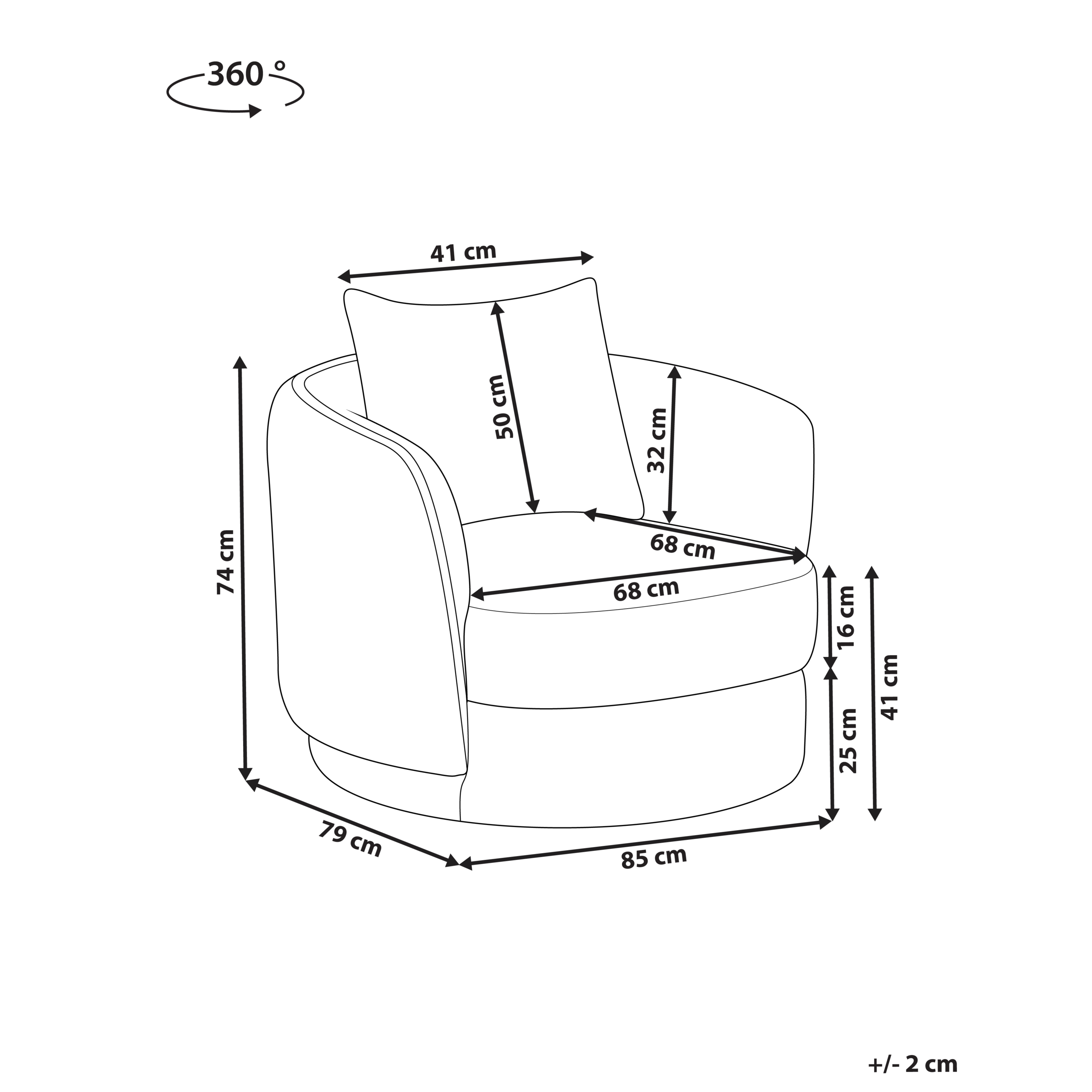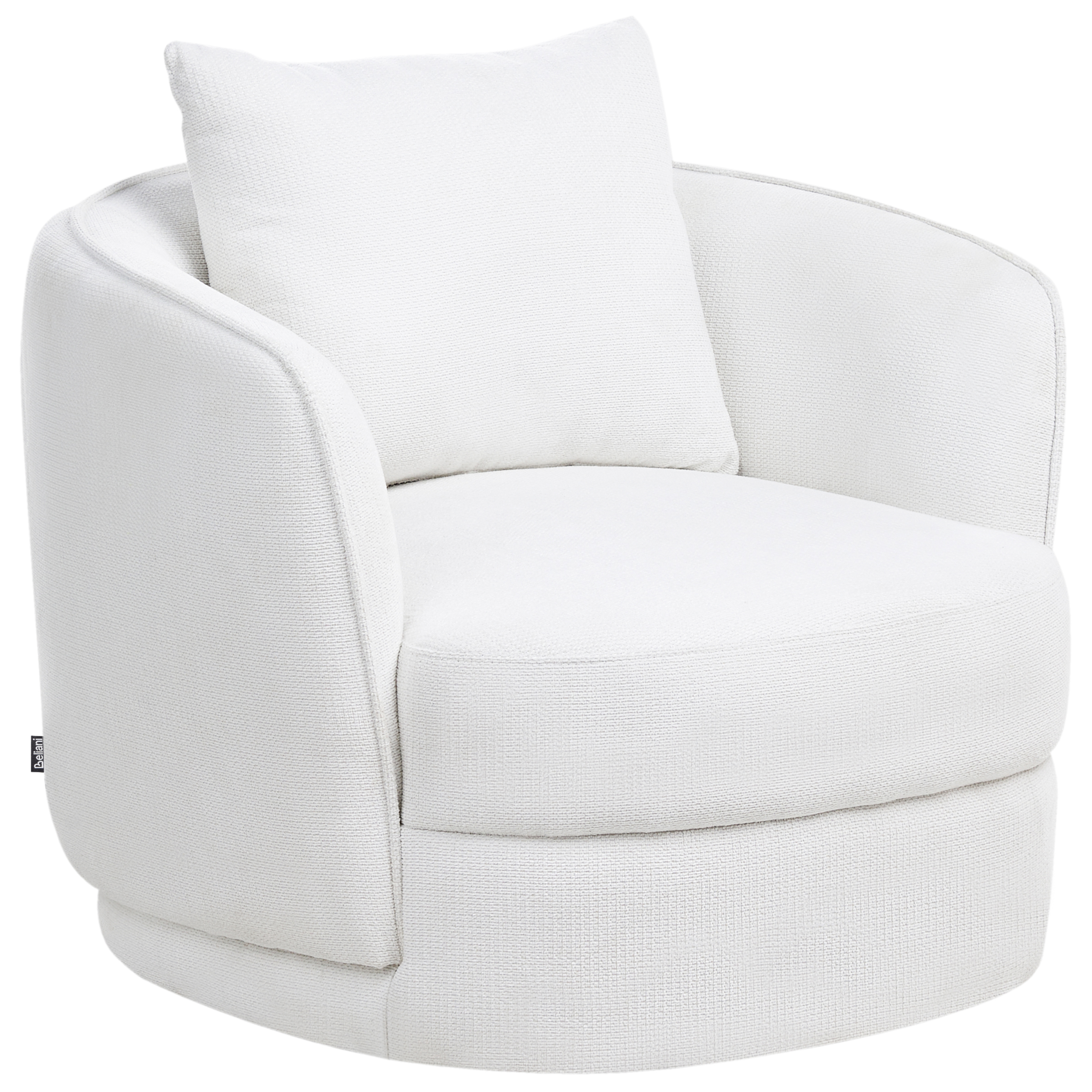 Fotoliu pivotant cu pernă. Relaxează-te în acest fotoliu elegant, cu design curbat, perfect pentru momente de relaxare. Baza rotativă la 360 de grade îți permite să te miști ușor, iar perna suplimentară cu husă detașabilă face curățarea rapidă și simplă. Tapițat cu un material moale, texturat, rezistent la apă și prietenos cu animalele de companie, acest fotoliu îmbină stilul cu practicitatea, fiind o piesă modernă și rezistentă pentru orice cameră. Detalii: Tip de Produs: Fotoliu. Stil: Retro. Culoare: Alb. Nuanță: Alb-murdar. Material: Țesătură. Material primar: Țesătură. Material secundar: Fier. Căptușeală: Spumă. Detalii material picioare: Metal. Material scaun: Țesătură. Compoziția materialului: 100% Poliester. Stilul cotierei: Liniar. Cotiere: Da. Protecții pentru picioare incluse: Nu. Model: Culoare solidă. Reclinabil: Nu. Structura scaunului: Lemn. Densitatea pernei scaunului: 28 kg/m3. Dimensiuni: Înălțimea cotierei: 74 cm. Adâncime: 79 cm. Grosimea scaunului: 16 cm. Înălțimea scaunului: 41 cm. Lățime: 85 cm. Înălțime: 74 cm. Suprafața de ședere: 68x68 cm. Greutate: 26 kg. Capacitatea de greutate: 125 kg. Oferta incude: 1 x Fotoliu, 1 x Pernă. Caracteristici cheie: Rotire de 360°, Scaun spațios și confortabil, Ideal atât pentru dormitor, cât și pentru camera de zi, Design elegant, Materiale ușor de întreținut și durabile, Finisajul rezistent la apă permite ca orice vărsare să rămână pe suprafață, Țesătura prietenoasă cu animalele de companie împiedică pătrunderea firelor de păr, fiind astfel ușor de curățat și întreținut, Perne detașabile pentru o curățare ușoară. Asamblare: Nu necesită asamblare. Sfaturi de întreținere: Țesătură: 1.Aspirati folosind un accesoriu potrivit. 2.Vă rugăm să curățați cu un șampon uscat și un burete umed sau cu un detergent ușor. Fier: 1.Pentru a evita zgârieturile, nu folosiți produse de curățare abrazive. 2.Curățați cu un detergent delicat și o cârpă moale, apoi ștergeți bine. 3.Pentru elementele din cupru sau crom, folosiți un agent de lustruire.