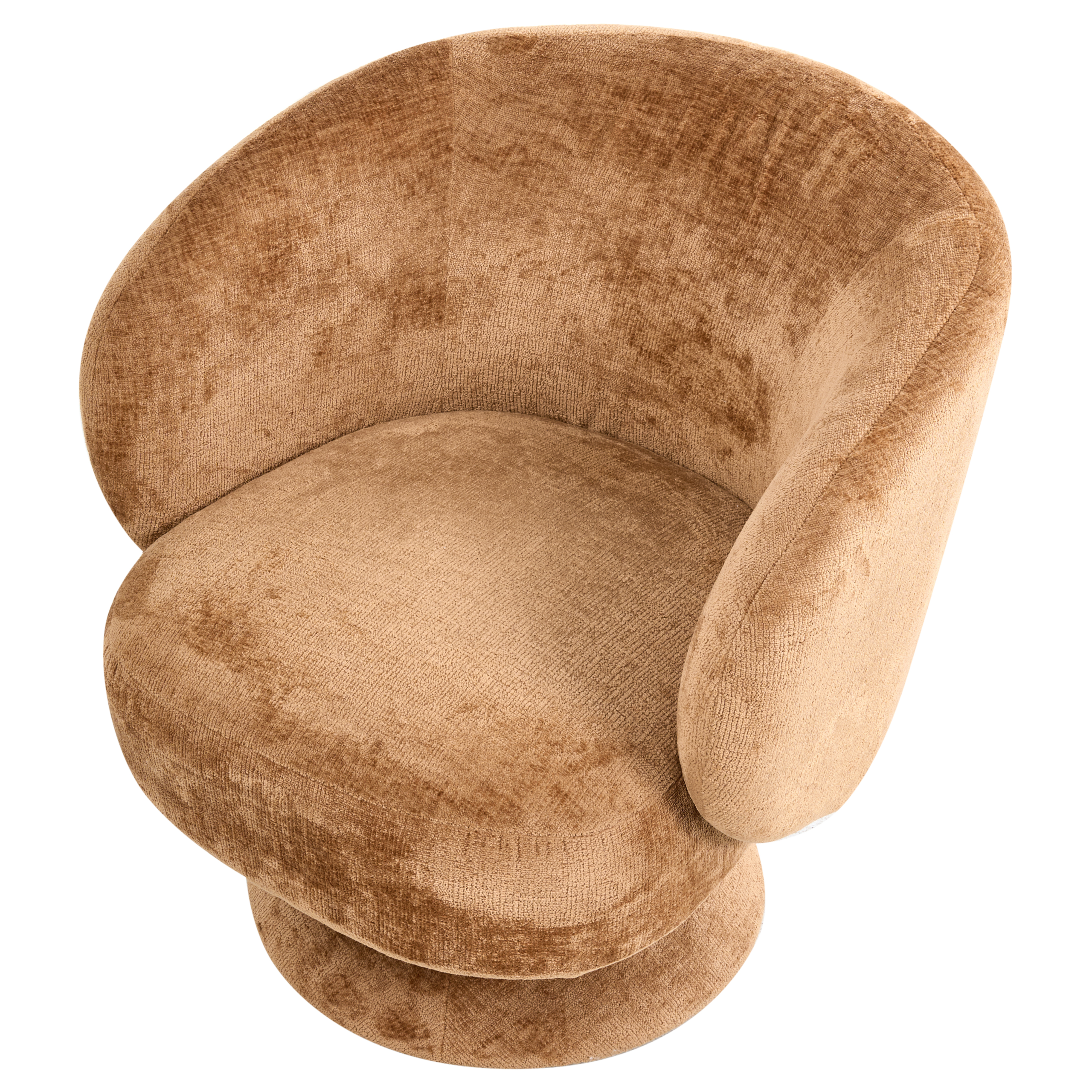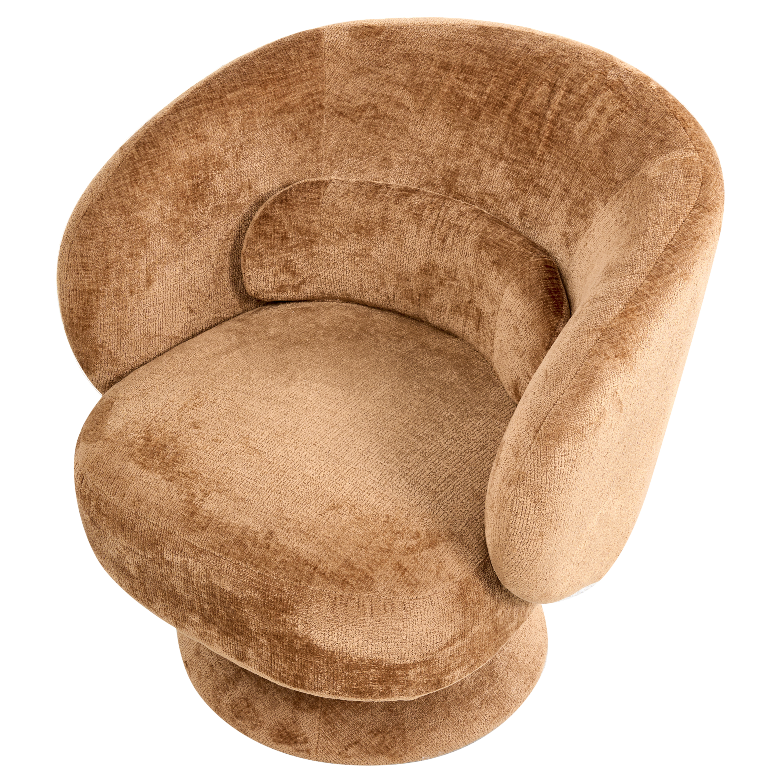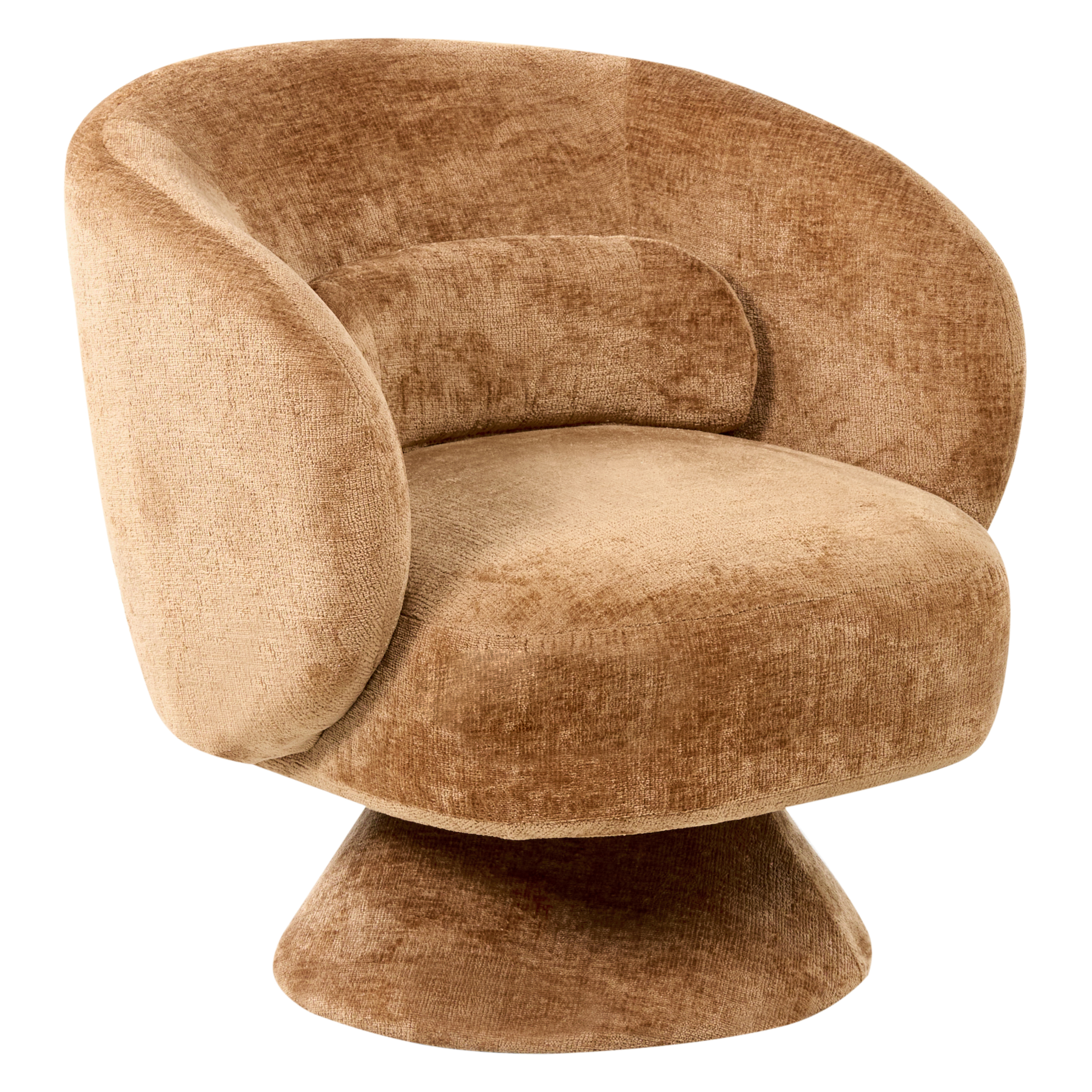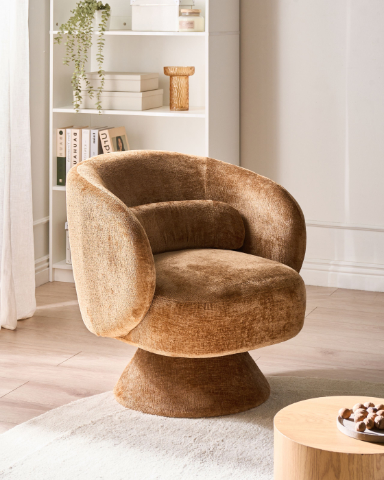 Fotoliu cu spătar rotund în stil retro. Acest fotoliu rotativ reunește confortul autentic cu un design rafinat, devenind rapid piesa preferată din orice încăpere. Tapițeria din chenille, cu textură delicată și plăcută la atingere, adaugă un plus de eleganță, în timp ce spătarul curbat oferă susținere optimă pentru clipe de relaxare. Nuanța delicată de verde, ușor de asortat, completează armonios atât interioarele moderne, cât și cele clasice. O alegere inspirată pentru un ambient cald și primitor. Detalii: Tip de Produs: Fotoliu. Stil: Minimalist. Culoare: Maro. Culoarea cadrului: Bej. Nuanță: Maro auriu. Material: Țesătură. Material primar: Chenille. Material secundar: Lemn de cauciuc. Căptușeală: Spumă. Detalii material picioare: Metal. Material scaun: Chenille. Compoziția materialului: 100% Poliester. Stilul cotierei: Fără cotiere. Cotiere: Nu. Protecții pentru picioare incluse: Nu. Model: Culoare solidă. Reclinabil: Nu. Structura scaunului: Placaj. Densitatea pernei scaunului: 28 kg/m3. Dimensiuni: Adâncime: 64 cm. Grosimea scaunului: 21 cm. Înălțimea scaunului: 43 cm. Lățime: 77 cm. Înălțime: 77 cm. Suprafața de ședere: 59x56 cm. Greutate: 18 kg. Capacitatea de greutate: 180 kg. Oferta incude: 1 x Pernă decorativă, 1 x Fotoliu. Caracteristici cheie: Rotire de 360°, Un loc excelent pentru relaxare, Stil retro, Ideal atât pentru dormitor, cât și pentru camera de zi, Creează o atmosferă confortabilă, Construcție robustă. Asamblare: Necesită asamblare parțială.20-40 min. Informații suplimentare: Pentru o stabilitate și siguranță maximă în utilizare, se recomandă să verificați la aproximativ 2 săptămâni după instalare dacă produsul a fost asamblat corect. De asemenea, se recomandă să verificați dacă șuruburile sunt strânse corect, o dată la 3 luni. Sfaturi de întreținere: Chenille: 1.Aspirati folosind un accesoriu potrivit. 2.Vă rugăm să curățați cu un șampon uscat și un burete umed sau cu un detergent ușor.