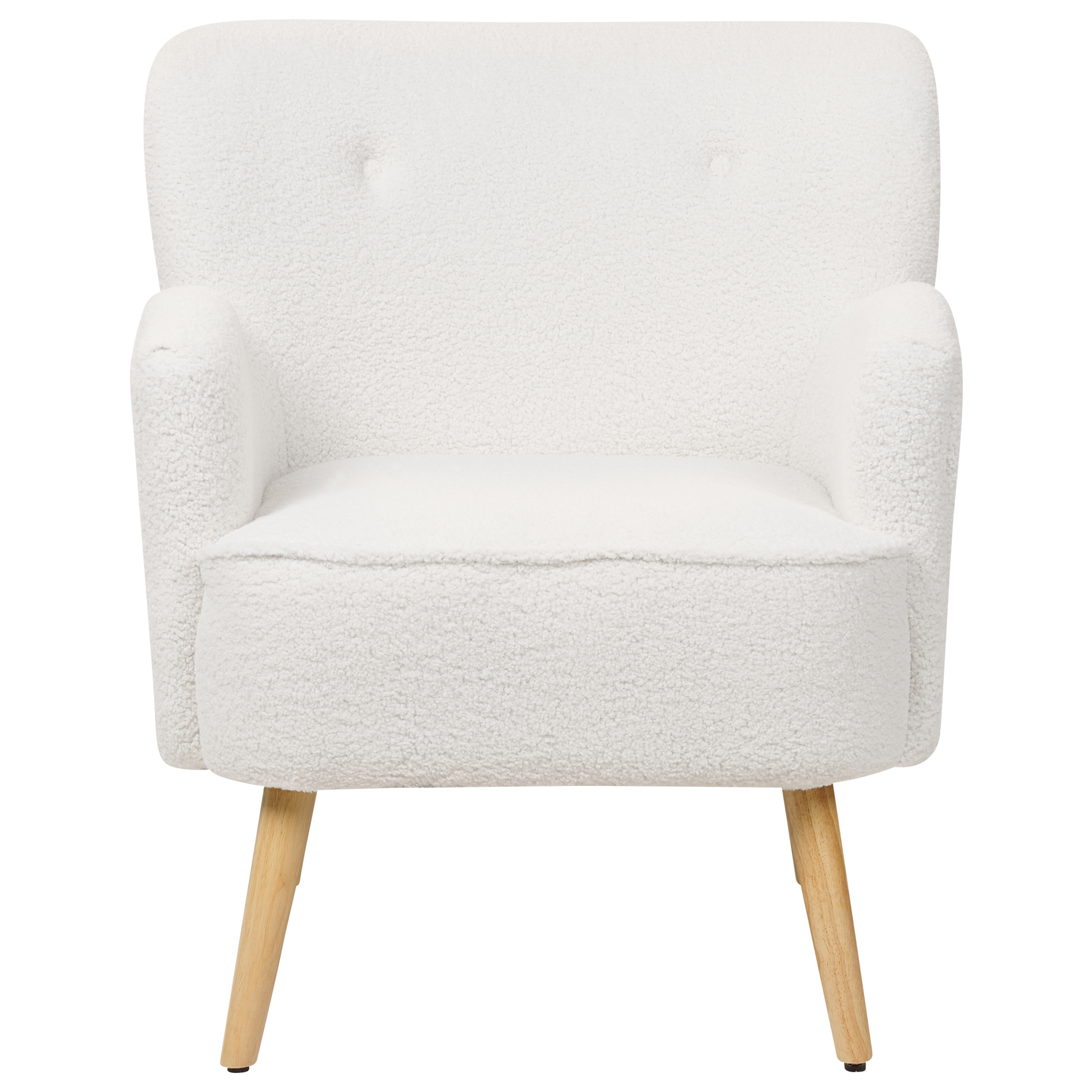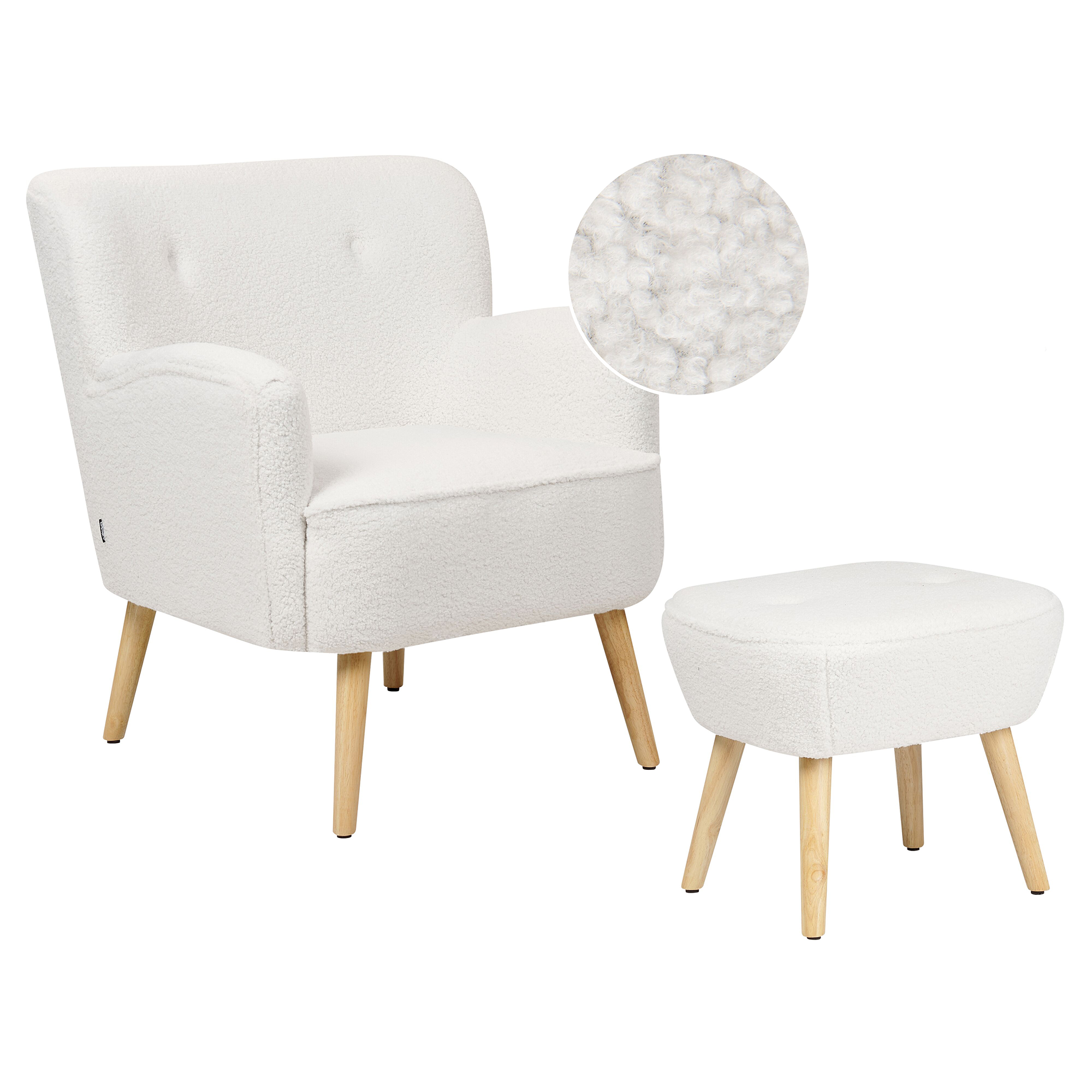 Set fotoliu și suport pentru picioare. Creează un colț perfect de relaxare în livingul tău cu acest set elegant de fotoliu și taburet. Tapițat cu un țesătură boucle albă extrem de plăcută la atingere, acest mobilier adaugă confort și farmec oricărei încăperi. Spătarul scund, formele rotunjite și accentul subtil sub formă de nasturi fac din această piesă de mobilier alegerea ideală pentru interioare retro sau moderne, oferind atât stil, cât și confort. Detalii: Tip de Produs: Fotoliu. Stil: Retro. Culoare: Alb. Material: Țesătură. Material primar: Boucle. Material secundar: Lemn de cauciuc. Căptușeală: Spumă. Detalii material picioare: Lemn. Material scaun: Țesătură. Compoziția materialului: 100% Poliester. Stilul cotierei: Integrat. Cotiere: Da. Suport pentru picioare inclus: Da. Protecții pentru picioare incluse: Da. Model: Culoare solidă. Reclinabil: Nu. Structura scaunului: Curea elastică. Densitatea pernei scaunului: 24 kg/m3. Dimensiuni: Înălțimea cotierei: 63 cm. Adâncime: 79 cm. Otoman: 52x44x43 cm. Grosimea scaunului: 20 cm. Înălțimea scaunului: 44 cm. Lățime: 74 cm. Înălțime: 85 cm. Suprafața de ședere: 51x51 cm. Dimensiuni generale: 74x79x85. Greutate: 19 kg. Capacitatea de greutate: 150 kg. Oferta incude: 1 x Fotoliu, 1 x Scaun. Caracteristici cheie: Confort maxim la șezut, Suport pentru picioare practic, Mobilier decorativ și funcțional, Excepțional de ușor de întreținut, De înaltă calitate, Tapițată complet. Asamblare: Picioare neasamblate.20-40 min. Informații suplimentare: Pentru o stabilitate și siguranță maximă în utilizare, se recomandă să verificați la aproximativ 2 săptămâni după instalare dacă produsul a fost asamblat corect. De asemenea, se recomandă să verificați dacă șuruburile sunt strânse corect, o dată la 3 luni. Sfaturi de întreținere: Țesătură: 1.Vă rugăm să curățați cu un șampon uscat și un burete umed sau cu un detergent ușor. 2.Aspirati folosind un accesoriu potrivit. Lemn de cauciuc: 1.Curățați cu un detergent delicat și o cârpă moale, urmând direcția fibrelor. 2.Ștergeți imediat după curățare pentru a preveni acumularea apei pe produs. 3.Pentru a păstra mobila finisată cu ulei în stare bună, este necesar să o ungeți cu ulei după un timp.