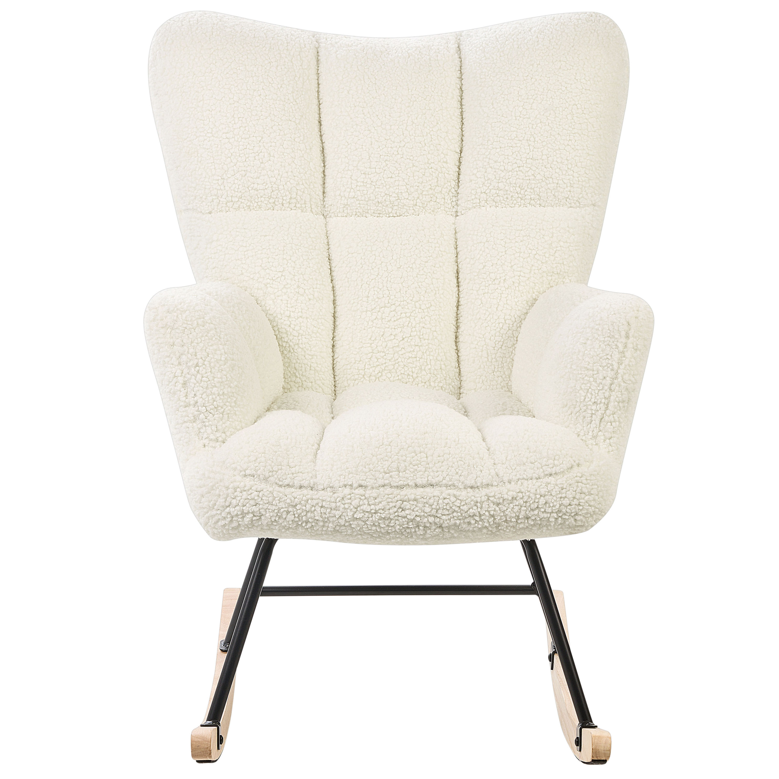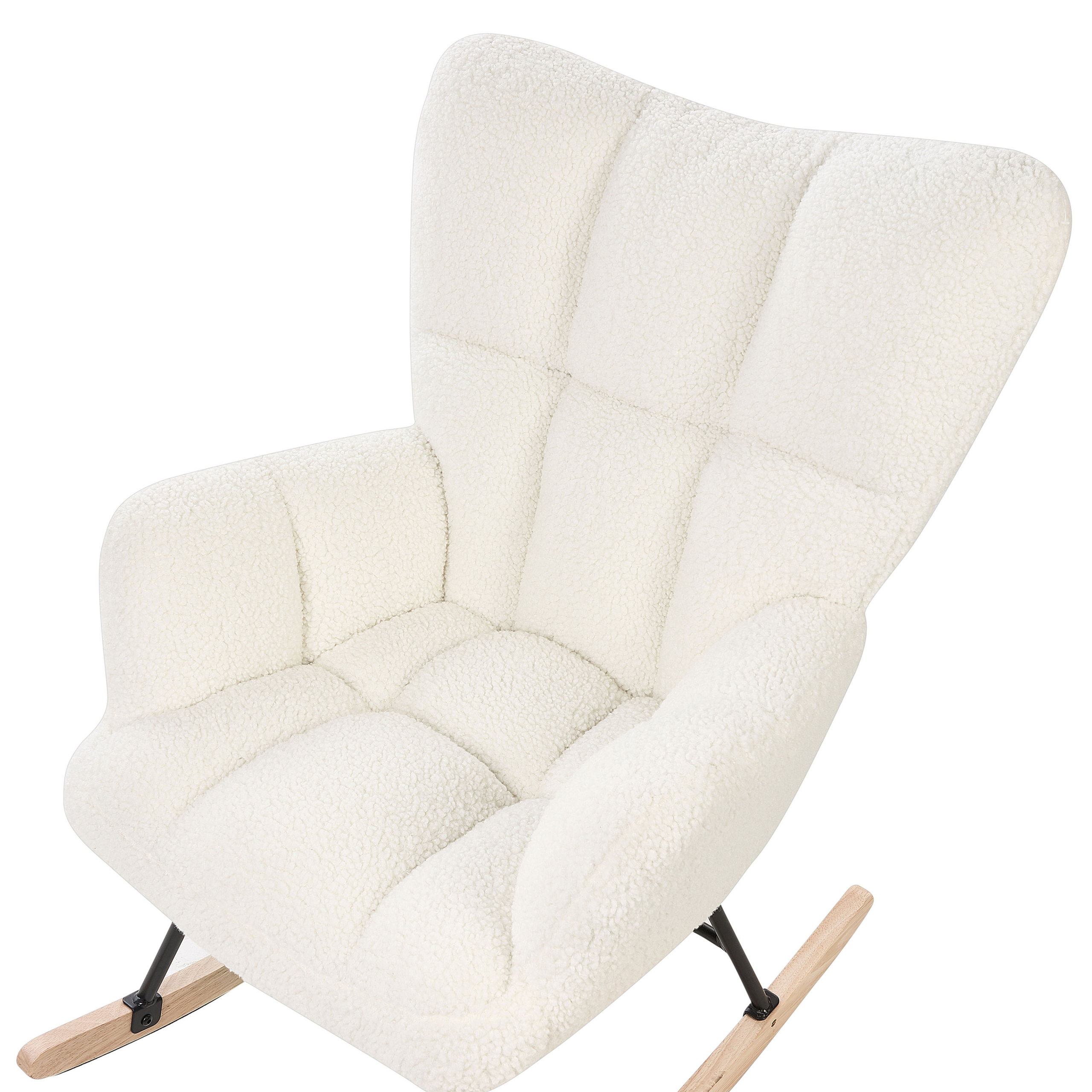 Fotoliu balansoar modern. Creează-ți un colț de liniște și confort cu acest fotoliu balansoar plin de farmec. Tapițeria moale, capitonată, din boucle alb te îmbie să te așezi și să te lași purtat de mișcarea lină, oferită de picioarele curbate din lemn de cauciuc. Este companionul perfect pentru serile în care vrei să te relaxezi, să citești sau să petreci momente magice alături de cei mici. Designul elegant și culoarea versatilă se adaptează cu ușurință oricărui stil de decor, de la retro până la modern, aducând un plus de bucurie și rafinament în orice încăpere. Detalii: Tip de Produs: Fotoliu de relaxare. Stil: Modern. Culoare: Alb. Material: Țesătură. Material primar: Boucle. Material secundar: Metal. Căptușeală: Spumă. Detalii material picioare: Metal. Material scaun: Boucle. Compoziția materialului: 100% Poliester. Stilul cotierei: Rotunjit. Cotiere: Da. Protecții pentru picioare incluse: Nu. Model: Culoare solidă. Reclinabil: Nu. Structura scaunului: Placaj. Densitatea pernei scaunului: 28 kg/m3. Dimensiuni: Înălțimea cotierei: 70 cm. Adâncime: 83 cm. Grosimea scaunului: 5 cm. Înălțimea scaunului: 42 cm. Lățime: 71 cm. Înălțime: 104 cm. Suprafața de ședere: 50x38 cm. Greutate: 11 kg. Capacitatea de greutate: 250 kg. Oferta incude: 1 x Balansoar. Caracteristici cheie: Funcție de legănare, Cotiere confortabile, Creează o atmosferă confortabilă, Se integrează practic cu orice stil de amenajare, Tapițerie din țesătură de înaltă calitate, Construcție robustă. Asamblare: Picioare neasamblate.5-15 min. Informații suplimentare: Pentru o stabilitate și siguranță maximă în utilizare, se recomandă să verificați la aproximativ 2 săptămâni după instalare dacă produsul a fost asamblat corect. De asemenea, se recomandă să verificați dacă șuruburile sunt strânse corect, o dată la 3 luni. Sfaturi de întreținere: Boucle: 1.Aspirati folosind un accesoriu potrivit. 2.Vă rugăm să curățați cu un șampon uscat și un burete umed sau cu un detergent ușor. Metal: 1.Curățați cu un detergent delicat și o cârpă moale, apoi ștergeți bine. 2.Pentru elementele din cupru sau crom, folosiți un agent de lustruire. 3.Pentru a evita zgârieturile, nu folosiți produse de curățare abrazive.