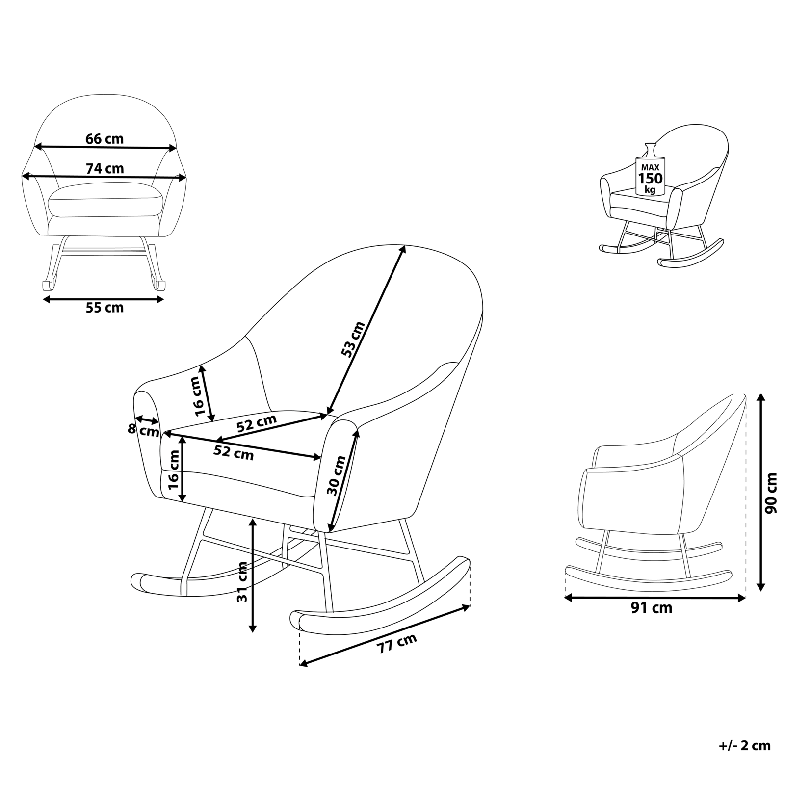 Fotoliu balansoar modern. Adaugă un plus de rafinament și liniște căminului tău cu acest fotoliu balansoar în stil modern. Forma ergonomică și perna capitonată, îmbrăcate într-o catifea fină la atingere, oferă o senzație plăcută de relaxare. Picioarele curbate din lemn deschis la culoare completează perfect designul, oferind o mișcare lină și constantă. Ideal pentru living sau camera copilului, este locul perfect pentru momente de răsfăț, într-un decor plin de stil. Detalii: Tip de Produs: Fotoliu de relaxare. Stil: Glamour. Culoare: Gri. Nuanță: Gri deschis. Material: Țesătură. Material primar: Catifea. Material secundar: Lemn de cauciuc. Detalii material picioare: Lemn. Material scaun: Catifea. Compoziția materialului: 100% Poliester. Stilul cotierei: Rotunjit. Cotiere: Da. Protecții pentru picioare incluse: Nu. Model: Culoare solidă. Reclinabil: Nu. Structura scaunului: Arcuri Bonnell. Densitatea pernei scaunului: 24 kg/m3. Dimensiuni: Înălțimea cotierei: 63 cm. Adâncime: 91 cm. Grosimea scaunului: 8 cm. Înălțimea scaunului: 47 cm. Lățime: 74 cm. Înălțime: 90 cm. Suprafața de ședere: 52x52 cm. Greutate: 13 kg. Capacitatea de greutate: 150 kg. Oferta incude: 1 x Balansoar. Caracteristici cheie: Suprafață de dormit confortabilă și largă, Perfect pentru fiecare cameră, Design modern, Tapițerie din țesătură de înaltă calitate, Ușor de curățat. Asamblare: Picioare neasamblate.20-40 min. Informații suplimentare: Pentru o stabilitate și siguranță maximă în utilizare, se recomandă să verificați la aproximativ 2 săptămâni după instalare dacă produsul a fost asamblat corect. De asemenea, se recomandă să verificați dacă șuruburile sunt strânse corect, o dată la 3 luni. Rețineți că țesătura de catifea poate avea un aspect puțin diferit atunci când este expusă la lumină; tinde să fie mai strălucitoare și mai luminoasă în lumina soarelui, în timp ce în lumină artificială are un ton diferit, mai închis. Datorită tipului de țesătură, tonul catifelei poate varia, de asemenea, atunci când este atinsă din direcții diferite. Pentru a uniformiza culoarea și a scăpa de lovituri și cute, materialul trebuie mângâiat cu palma deschisă într-o singură direcție, frecat cu o cârpă umedă sau călcat cu abur. Sfaturi de întreținere: Catifea: 1.Aspirati folosind un accesoriu potrivit. 2.Vă rugăm să curățați cu un șampon uscat și un burete umed sau cu un detergent ușor. Lemn de cauciuc: 1.Pentru a păstra mobila finisată cu ulei în stare bună, este necesar să o ungeți cu ulei după un timp. 2.Ștergeți imediat după curățare pentru a preveni acumularea apei pe produs. 3.Curățați cu un detergent delicat și o cârpă moale, urmând direcția fibrelor.