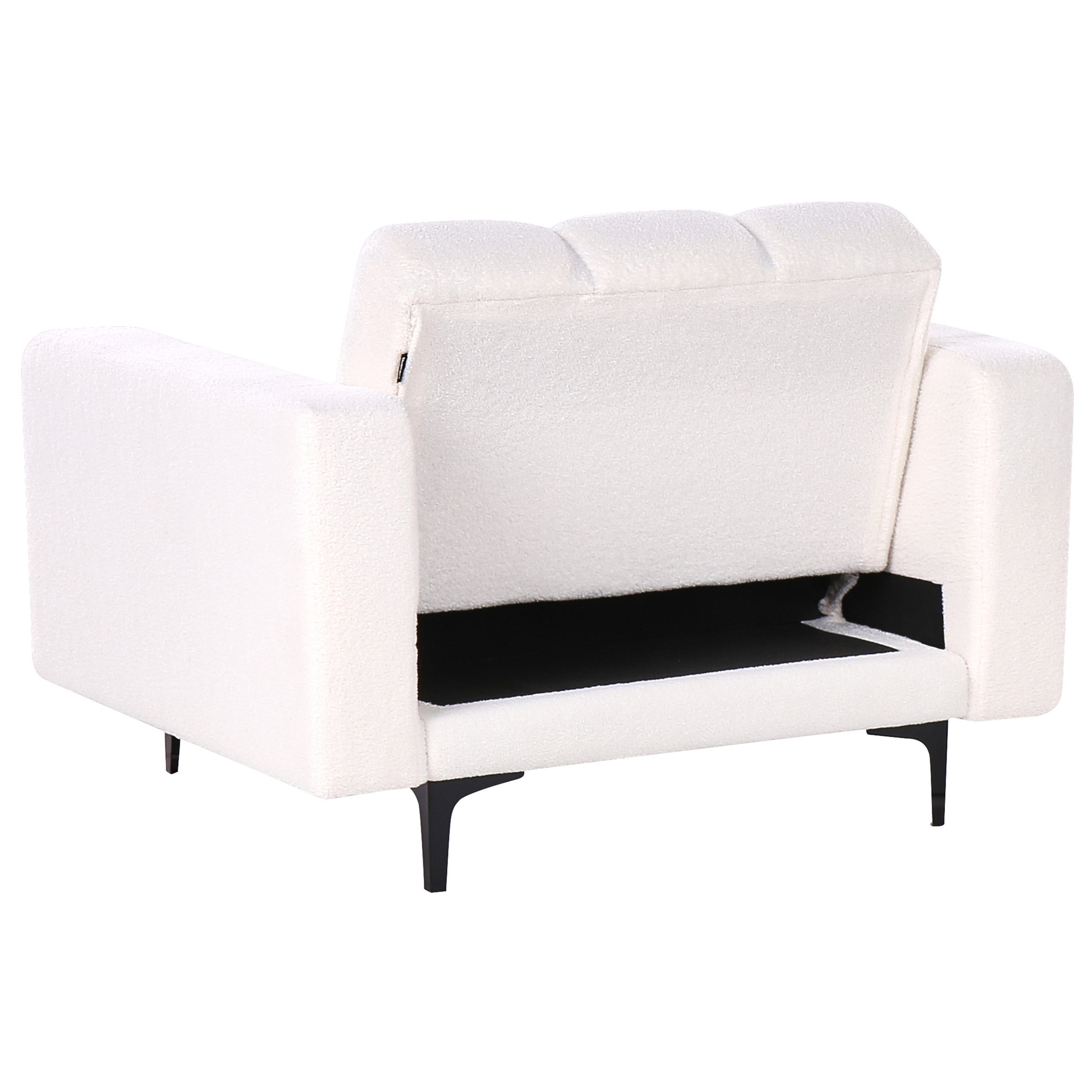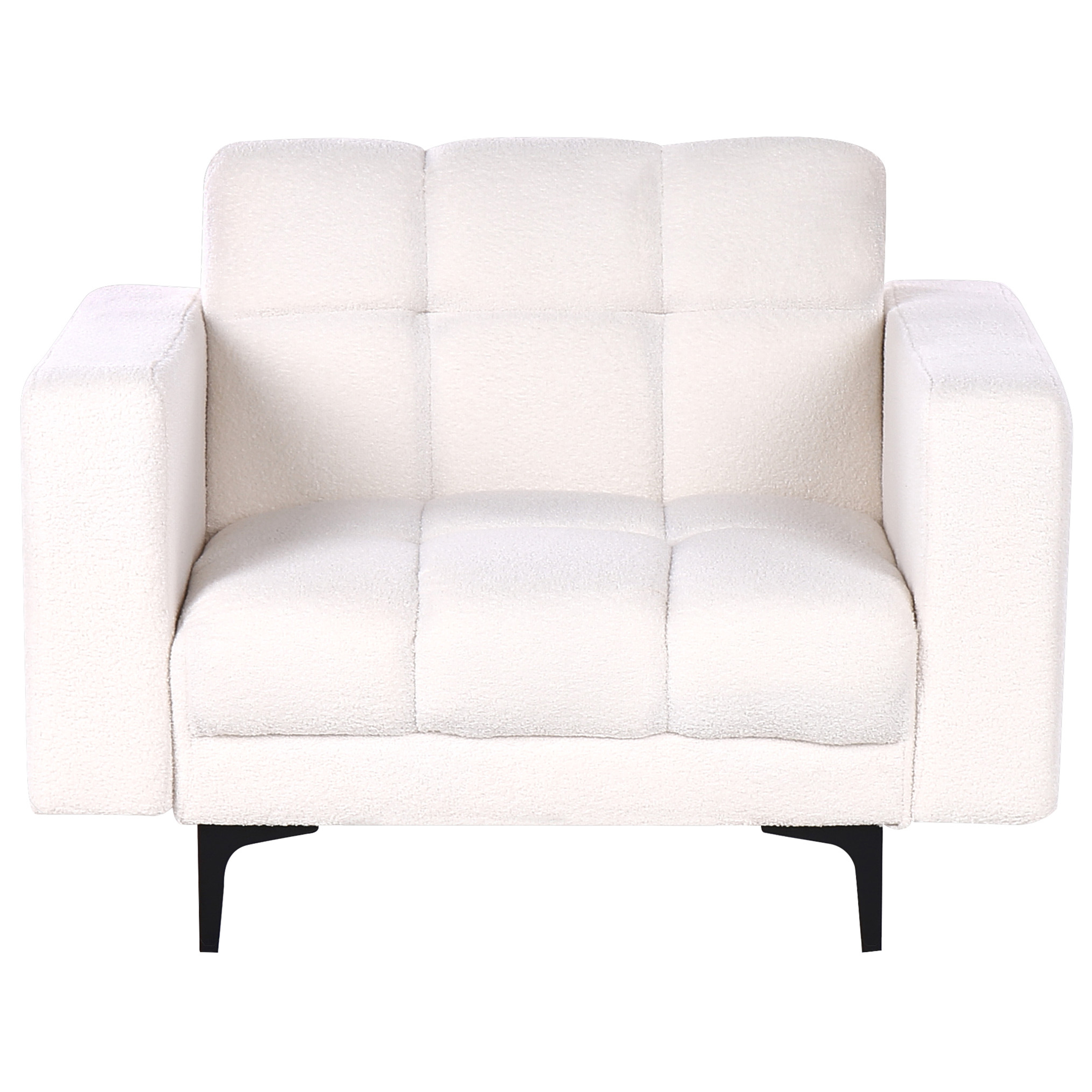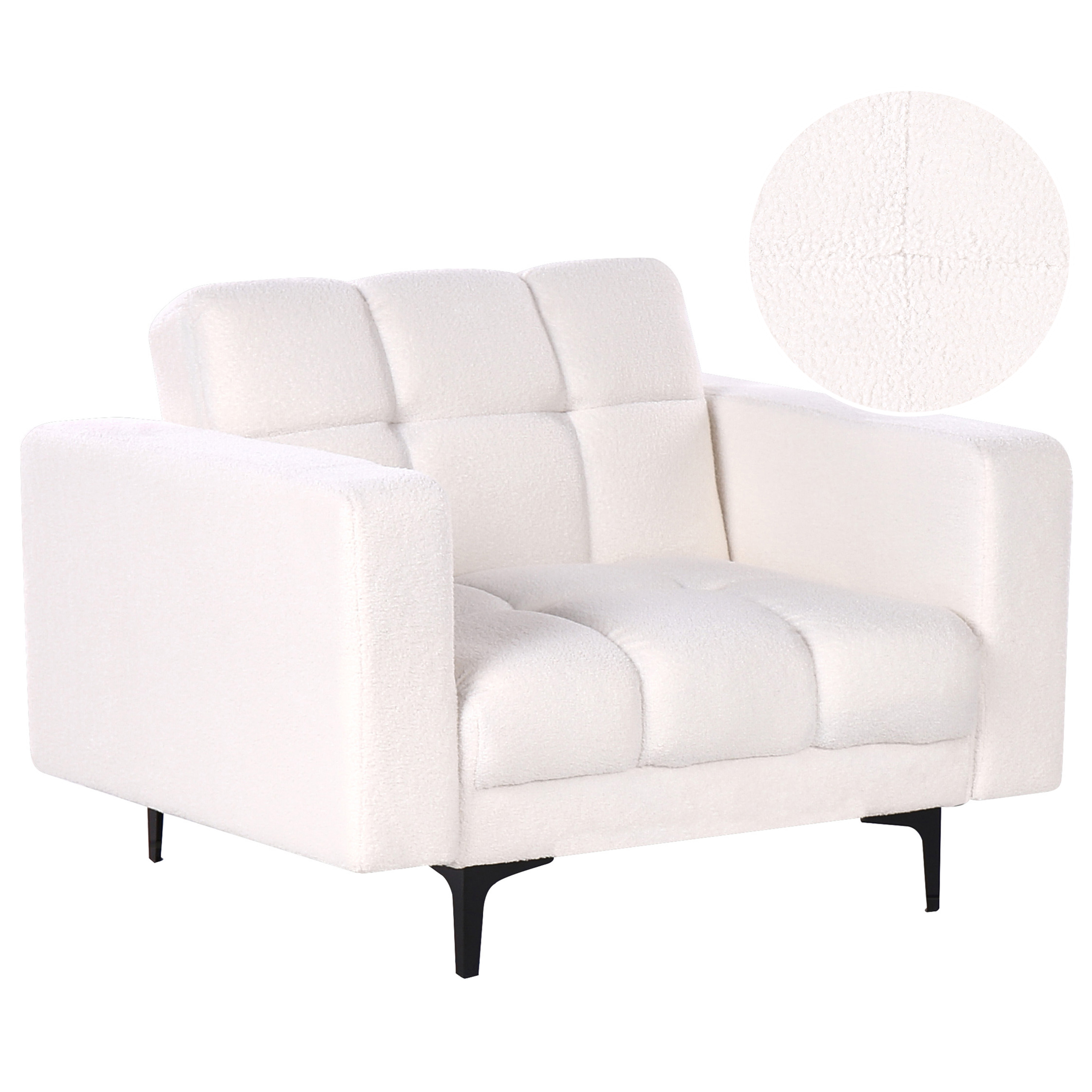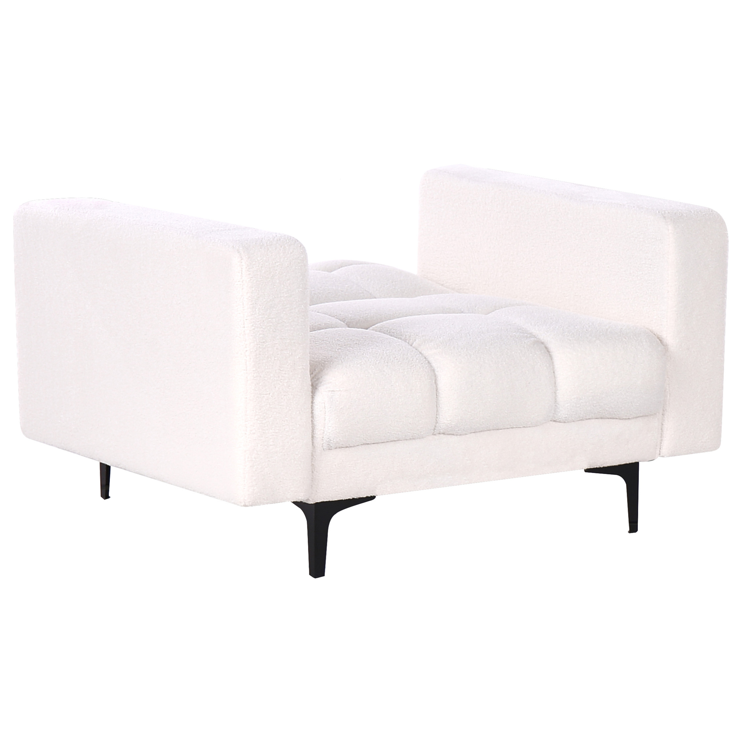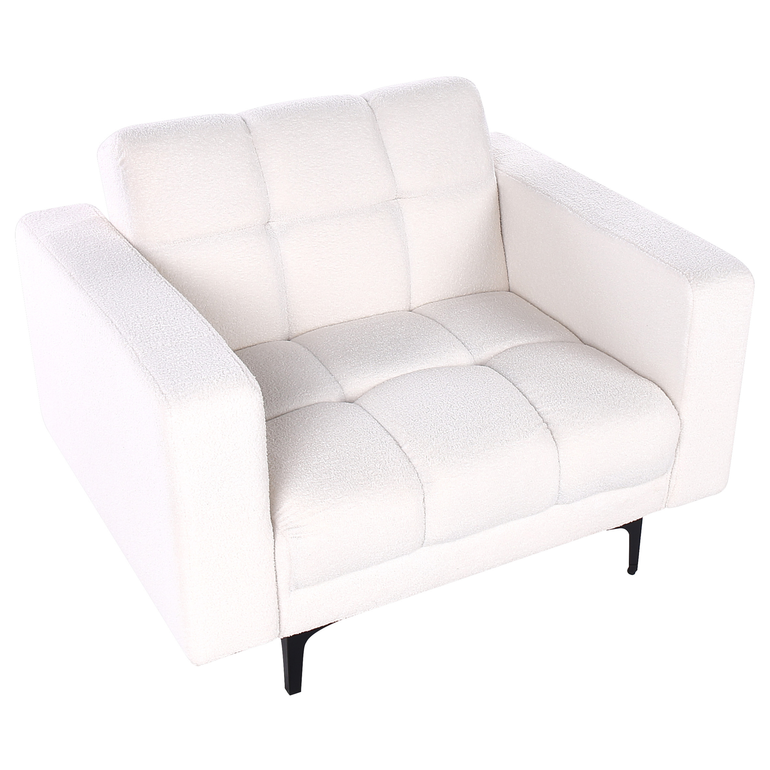 Fotoliu cu spătar reclinabil. Răsfață-te cu acest fotoliu elegant, perfect pentru livingul tău. Tapițat cu țesătură boucle de înaltă calitate și echipat cu funcție de înclinare, îți oferă un loc ideal pentru relaxare. Detaliile capitonate și finisajul delicat în nuanța clasică de alb aduc un plus de confort și stil în orice încăpere. Descoperă și celelalte piese din colecție pentru a crea un colț de relaxare perfect adaptat nevoilor tale. Detalii: Tip de Produs: Fotoliu. Stil: Minimalist. Culoare: Alb. Culoarea cadrului: Negru. Material: Țesătură. Material primar: Boucle. Material secundar: Fier. Căptușeală: Spumă. Detalii material picioare: Metal. Material scaun: Țesătură. Compoziția materialului: 100% Poliester. Stilul cotierei: Liniar. Cotiere: Da. Protecții pentru picioare incluse: Nu. Model: Culoare solidă. Reclinabil: Nu. Structura scaunului: Curea elastică. Densitatea pernei scaunului: 25 kg/m3. Dimensiuni: Înălțimea cotierei: 61 cm. Adâncime: 89 cm. Grosimea scaunului: 26 cm. Înălțimea scaunului: 41 cm. Lățime: 110 cm. Înălțime: 77 cm. Suprafața de ședere: 80x56 cm. Greutate: 31 kg. Capacitatea de greutate: 150 kg. Oferta incude: 1 x Fotoliu. Caracteristici cheie: Poate fi combinat cu alte elemente modulare din colecție, Spătar reglabil în 3 poziții, Scaun gros pentru confort maxim, Cu un tufting decorativ clasic, Design elegant, Tapițerie din țesătură de înaltă calitate. Asamblare: Necesită asamblare parțială.5-15 min. Informații suplimentare: Pentru o stabilitate și siguranță maximă în utilizare, se recomandă să verificați la aproximativ 2 săptămâni după instalare dacă produsul a fost asamblat corect. De asemenea, se recomandă să verificați dacă șuruburile sunt strânse corect, o dată la 3 luni. Sfaturi de întreținere: Boucle: 1.Aspirati folosind un accesoriu potrivit. 2.Vă rugăm să curățați cu un șampon uscat și un burete umed sau cu un detergent ușor. Fier: 1.Curățați cu un detergent delicat și o cârpă moale, apoi ștergeți bine. 2.Pentru elementele din cupru sau crom, folosiți un agent de lustruire. 3.Pentru a evita zgârieturile, nu folosiți produse de curățare abrazive.
